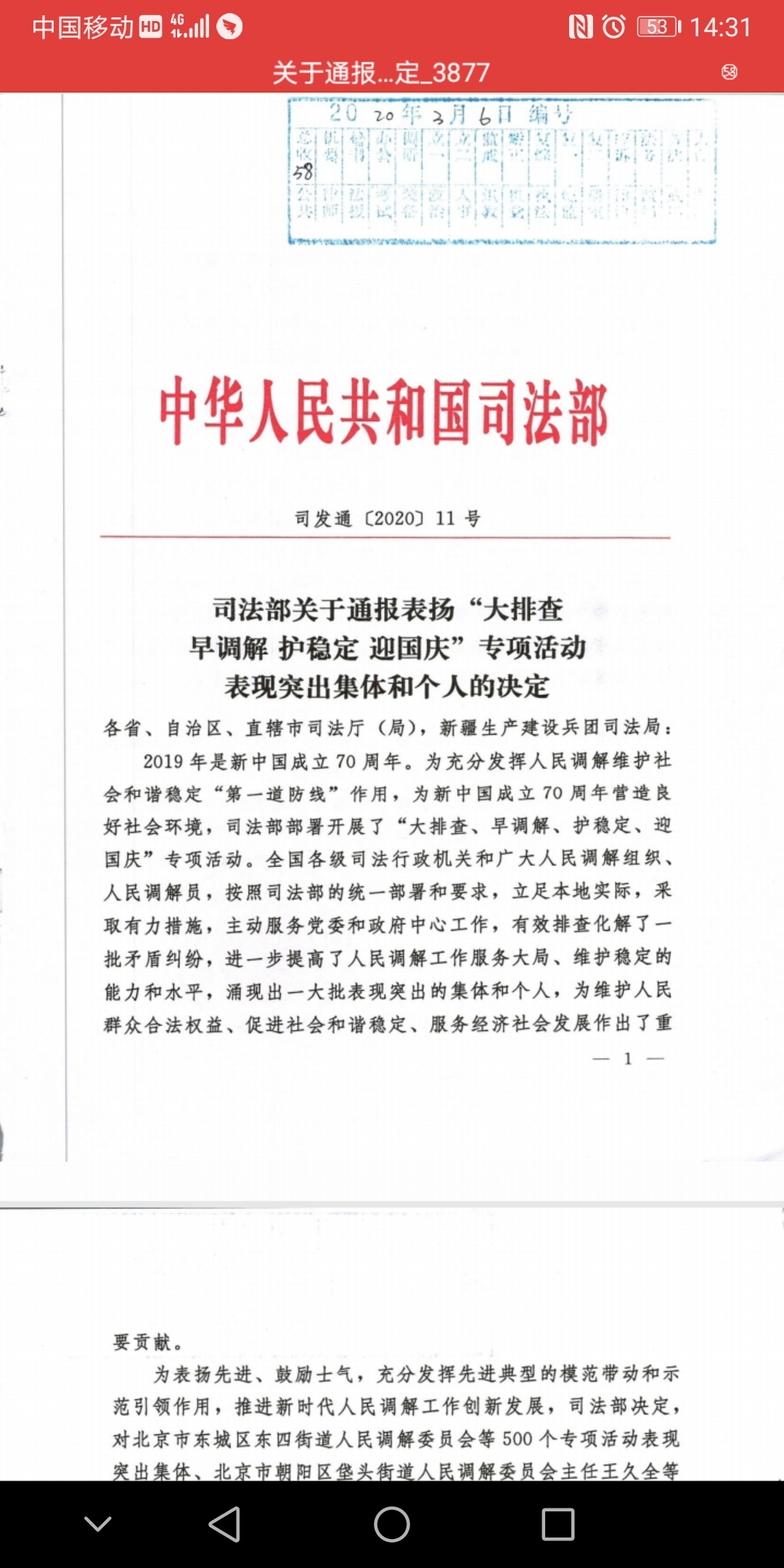 3月24日,记者从兰溪市司法局了解到,兰溪市人民调解委员会被司法部表彰为“大排查 早调解 护稳定 迎国庆”专项活动表现突出集体,成为金华市唯一一家受司法部表彰的人民调委会,这也是自2016年调委会成立以来首次获得国家级荣誉。