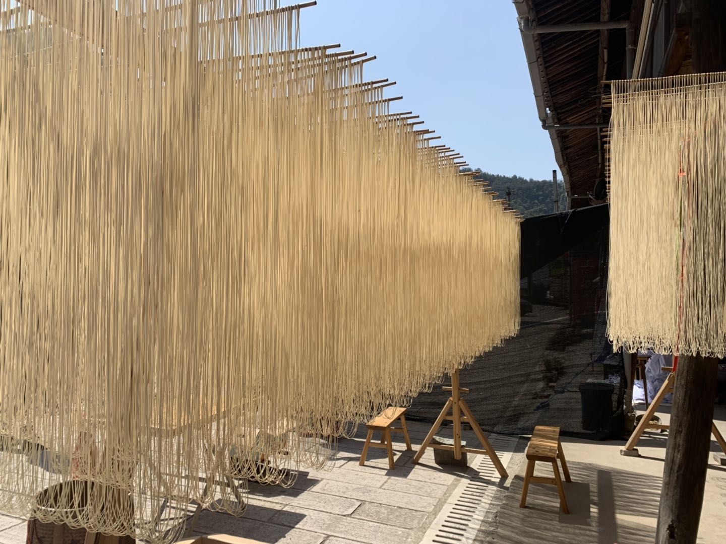 每当天气晴好,冷水镇朱山村胡阿姨家制作的土索面就会如瀑布般悬挂在门口。朱山村拥有1300多年历史,2016年被列入第四批中国传统村落名录。悠久的历史涵养了独特的独落曹文化、车灯文化和土索面文化。“客人争相上门购买,每天25公斤的产量供不应求。”胡阿姨说。