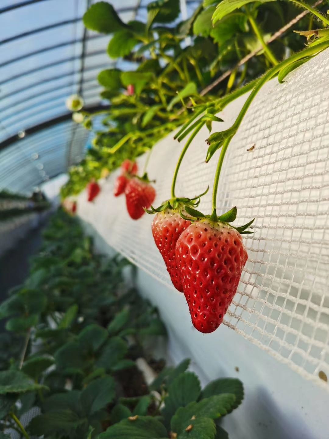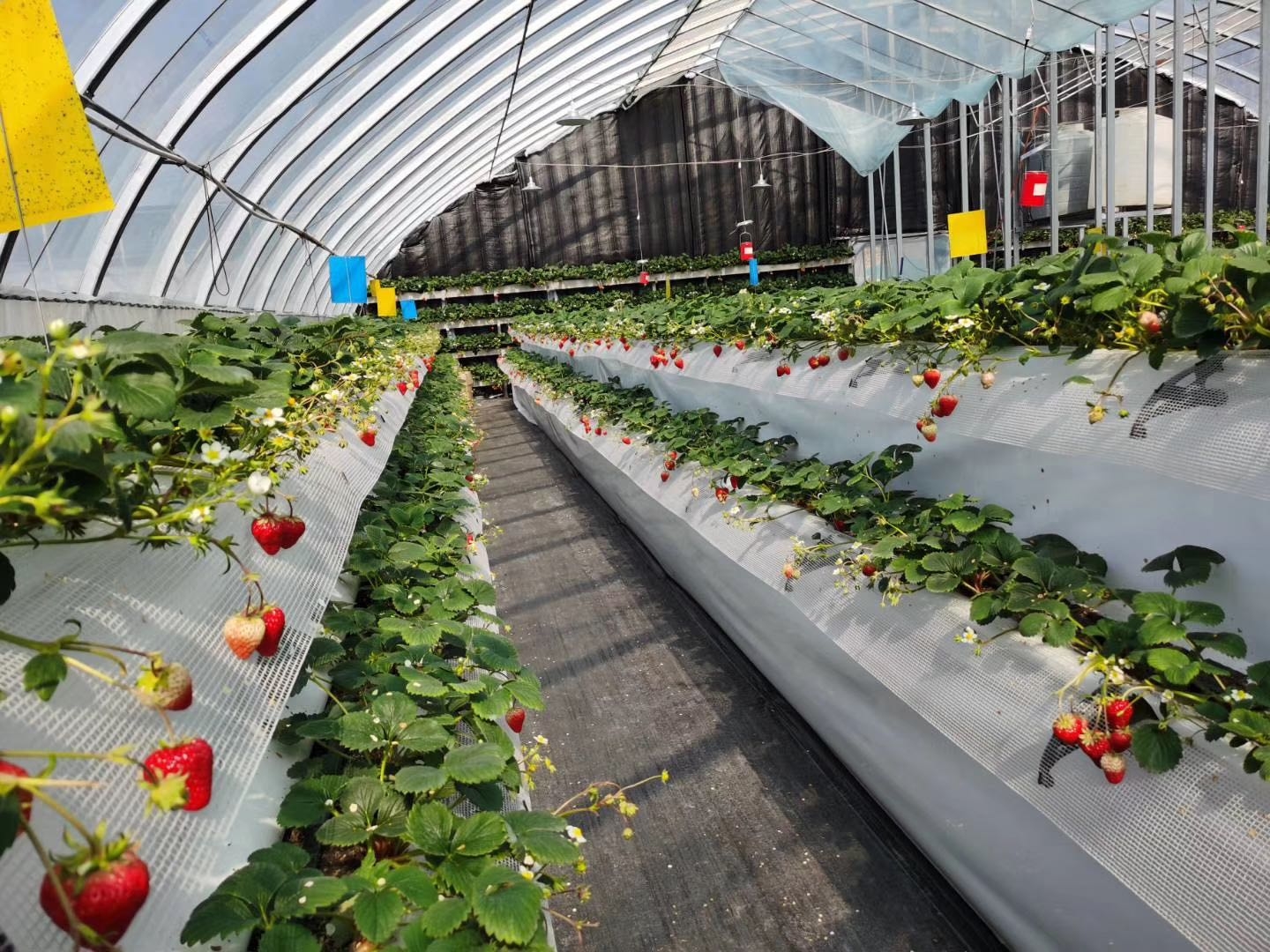 “高架技术栽培的草莓产量更高,品质更好。”该种植园业主刘建光说,草莓种植在高架上一能防虫避病,二让植物有更好的采光条件,三能有效控制植物根部的温湿度,是普通种植方法无法比拟的。