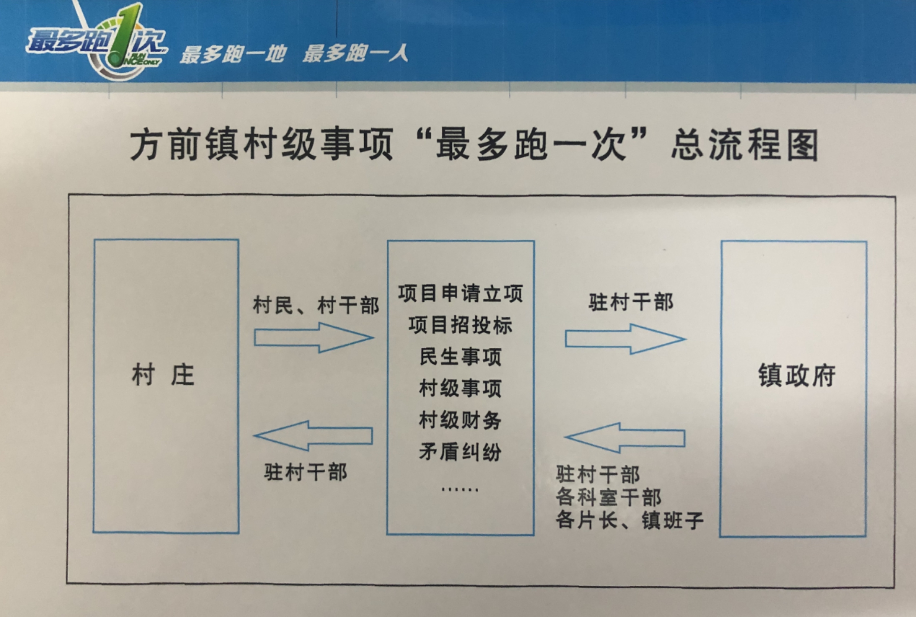 镇党委政府下发《关于推行村级事项“最多跑一次”的通知》文件,重新梳理村级事项办理清单,优化工作流程,画出流程图,制定《方前镇村级事项“最多跑一次”服务手册》,建立“一名办事员、一幅流程图、一个事项包、一份责任书、一张评议表”的“五个一”工作机制,让驻村干部主动负起责任,对接分管线领导和相关科室,主动谋划、主动参与、主动管理村级事项。分管线领导和相关科室也要主动服务,帮助对接上级部门,指导村级事项管理。