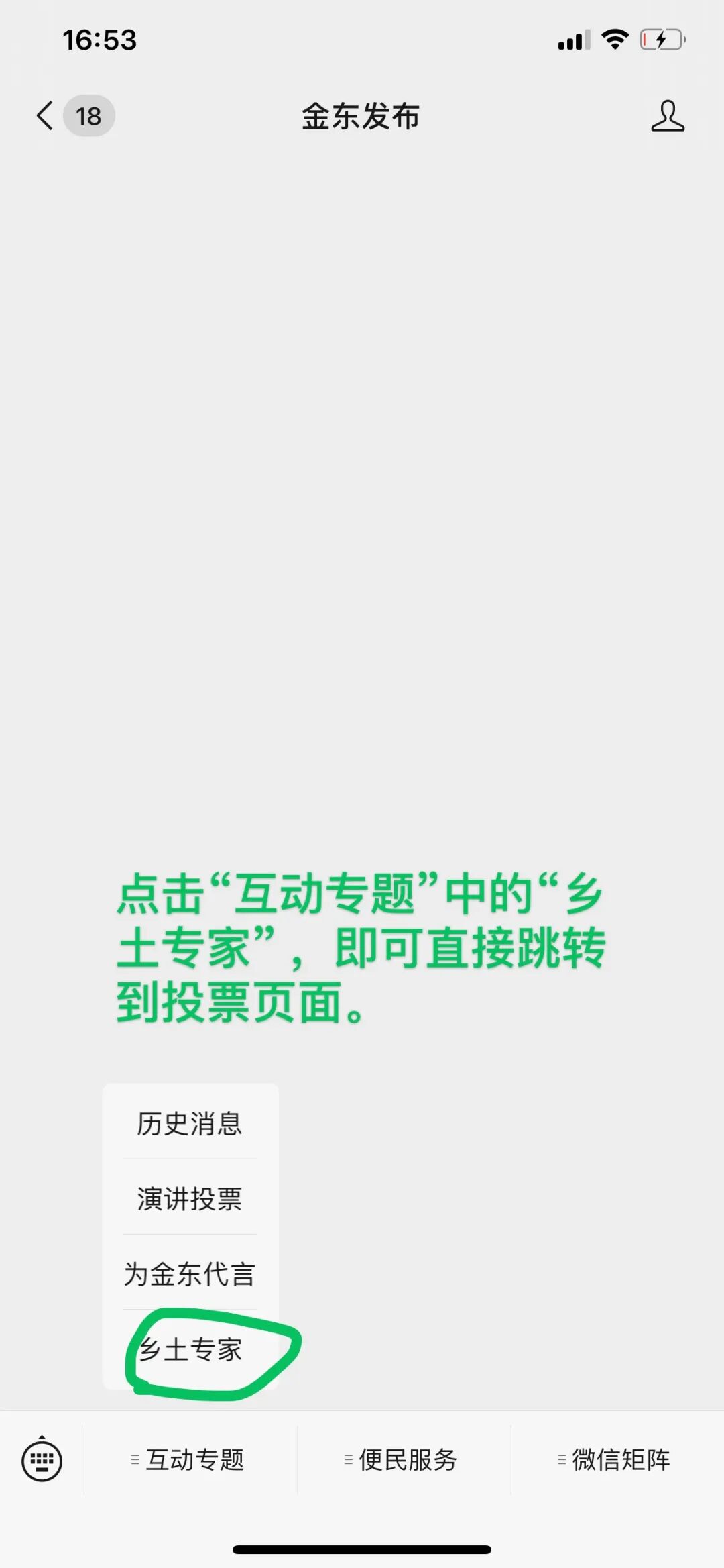 2、拿出手机扫描下方二维码进入【金东发布】微信公众号 — 点击关注公众号 — 点击下方“互动专题” — 点击“乡土专家”即可参与。