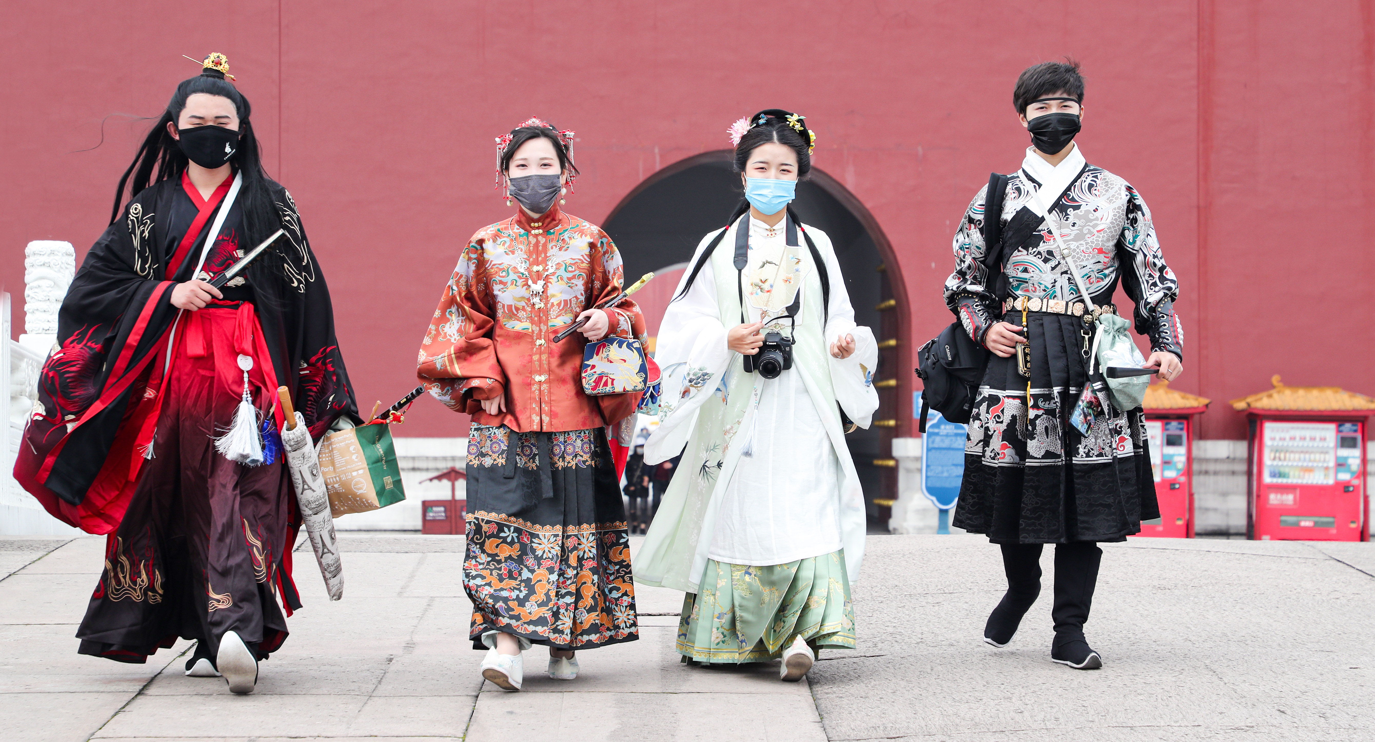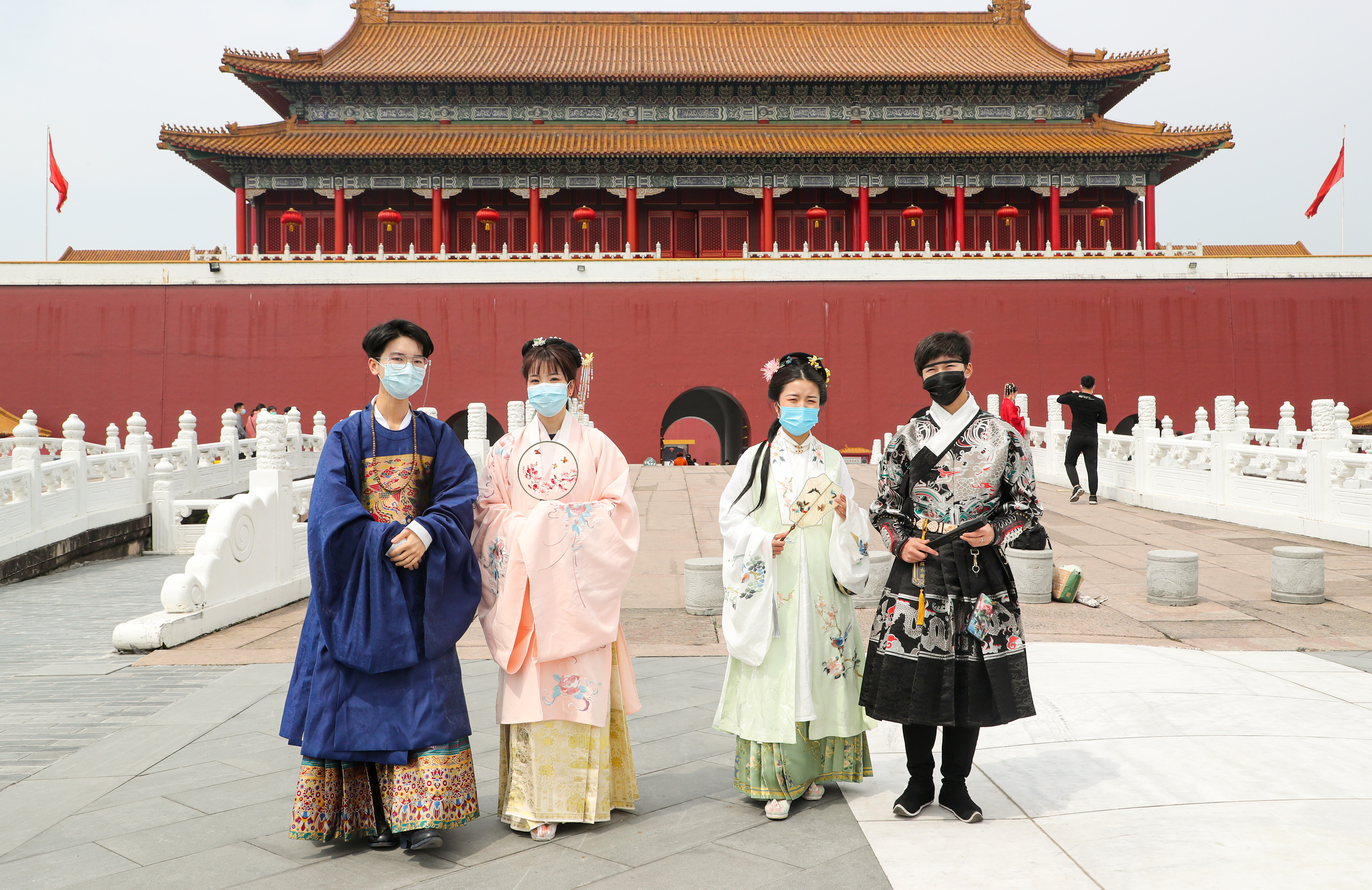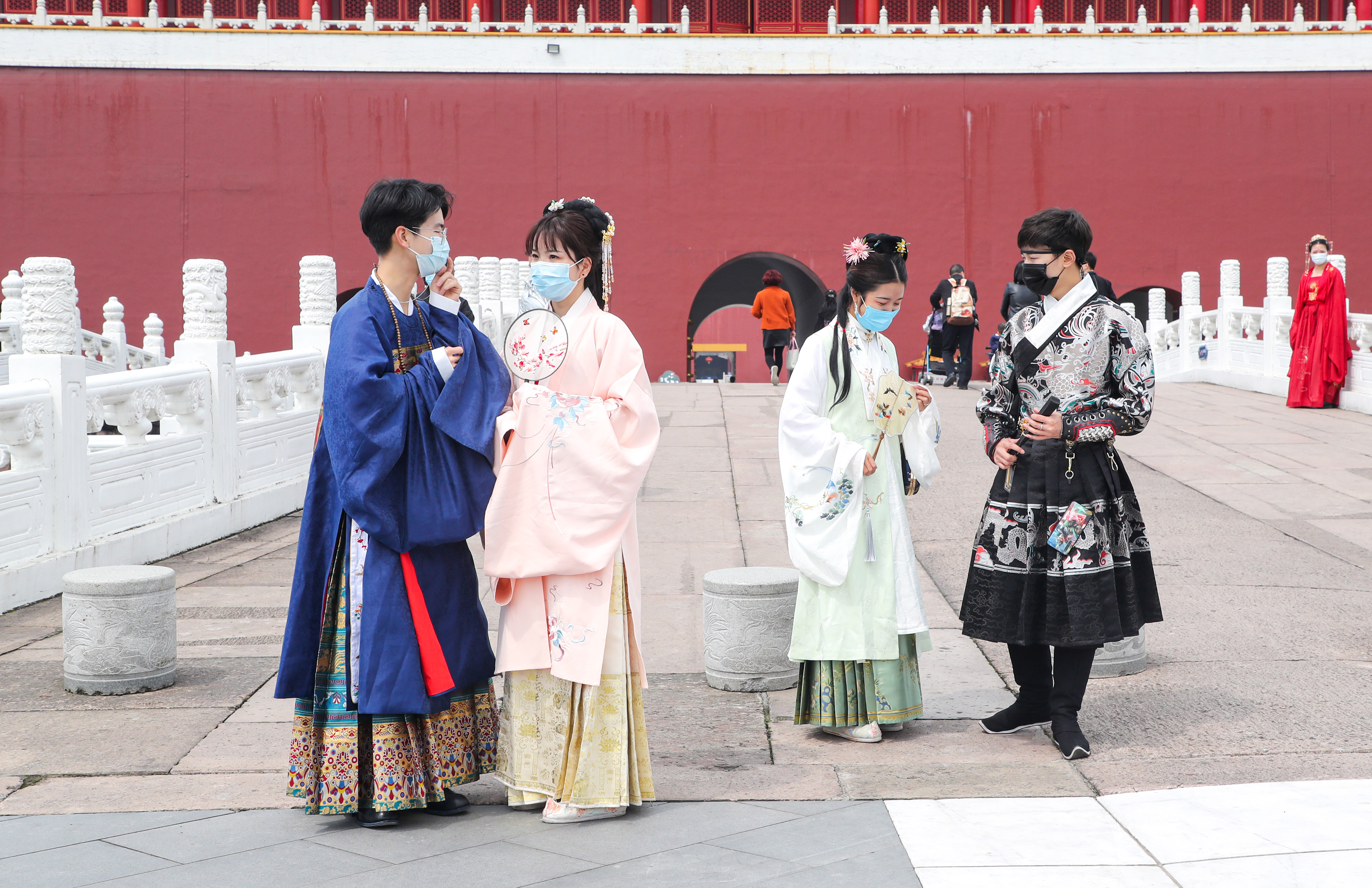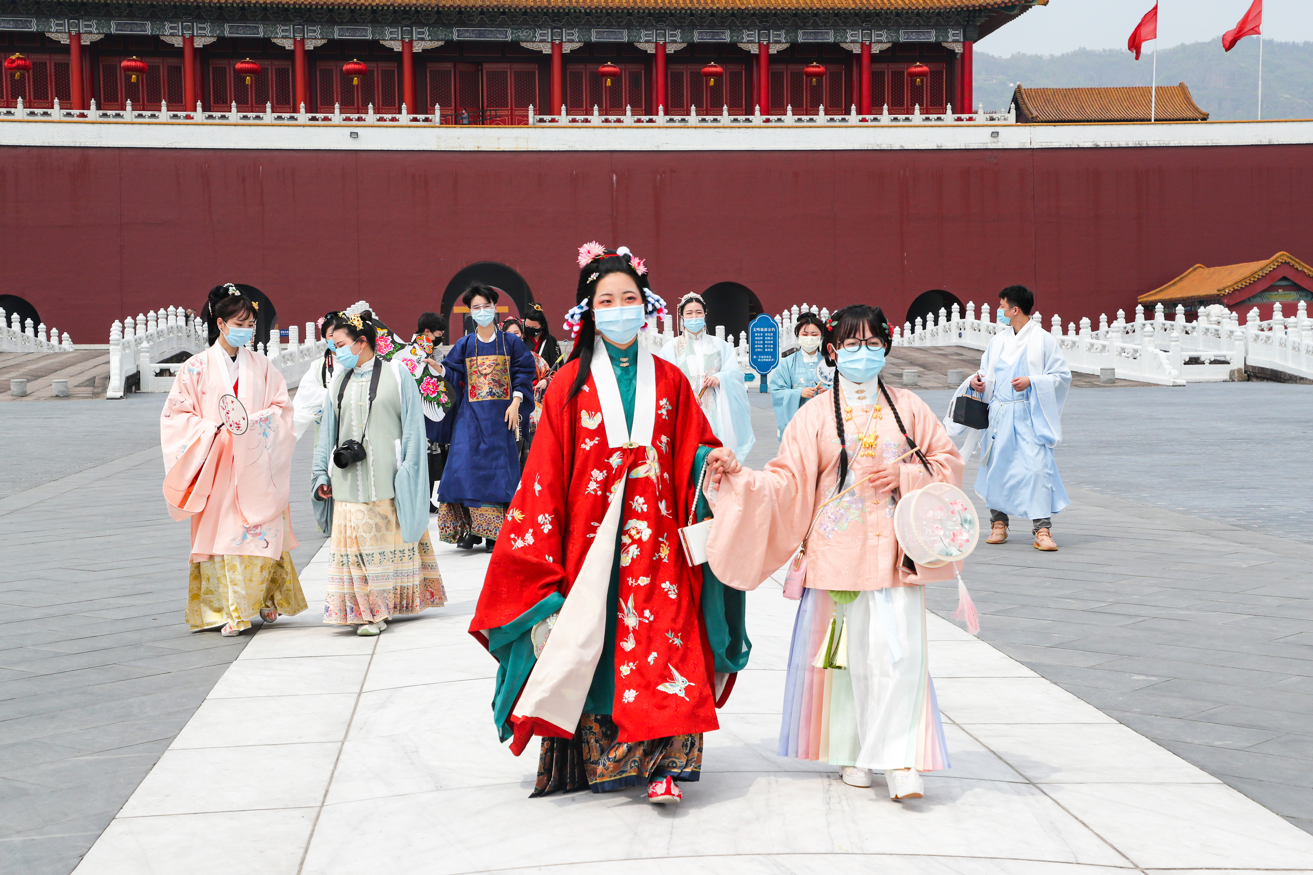 4月5日,义乌游客穿着汉服在横店影视城明清宫苑景区游玩。面对镜头,他们高兴地摆起姿势。