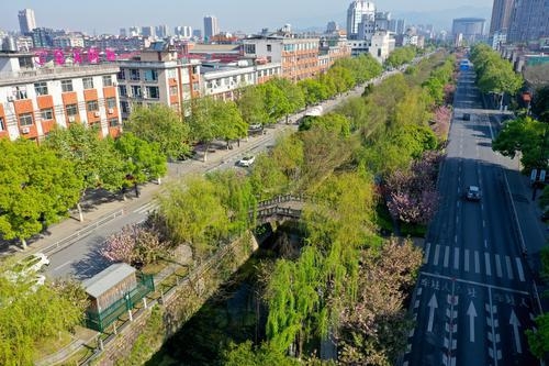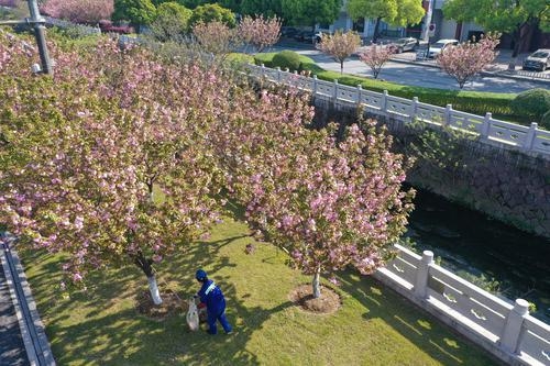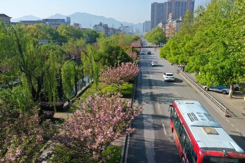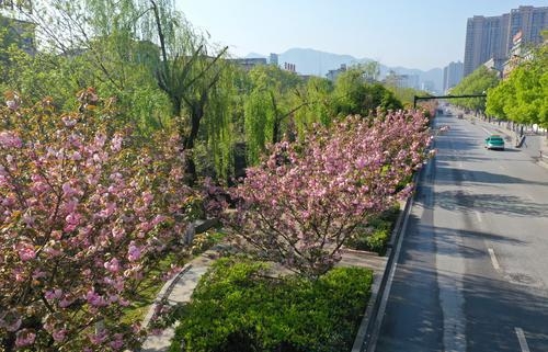 4月7日,东阳市区人民路上盛开的樱花、碧桃花等在郁郁葱葱的绿色植物衬托显得格外养眼。春暖花开,行走在东阳市区街头、绿地、公园里到处是春花烂漫的景象,让市民足不出城也能赏到繁花春景。