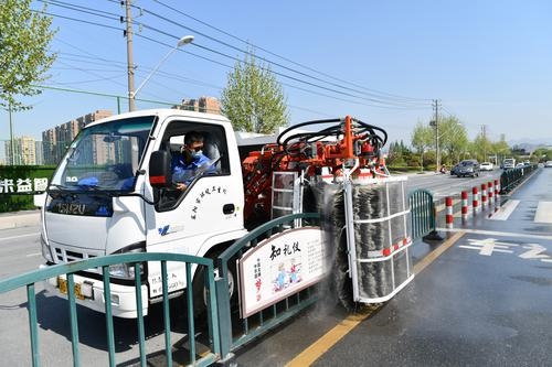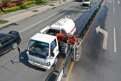 4月7日,护栏清洗车在东阳市区学士路上清洗道路中间隔离栏。为提升城市人居环境,进一步提高环卫保洁精细化管理水平,东阳市综合行政执法局加大机械化设施投入,提高环卫保洁工作的机械化、智慧化程度,切实减轻了一线环卫工人的工作负担。