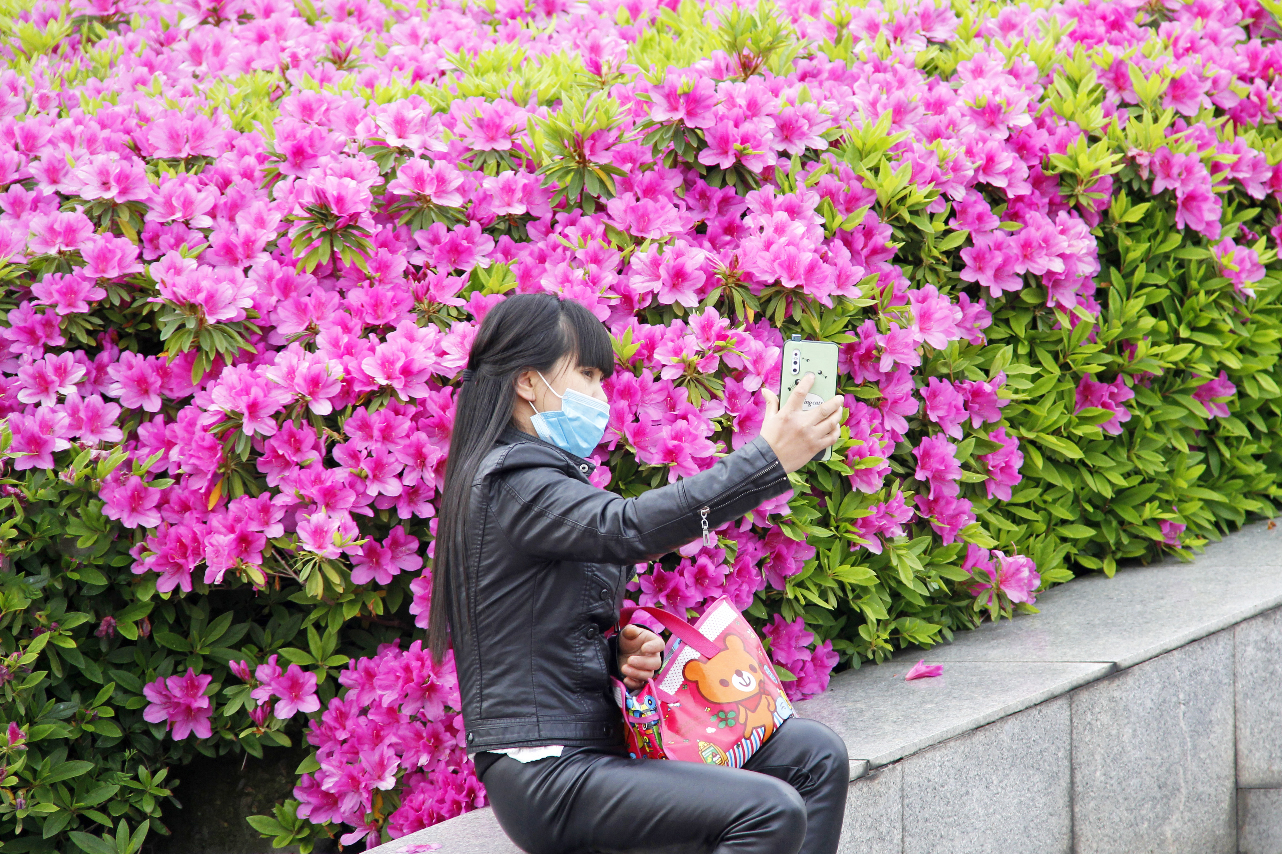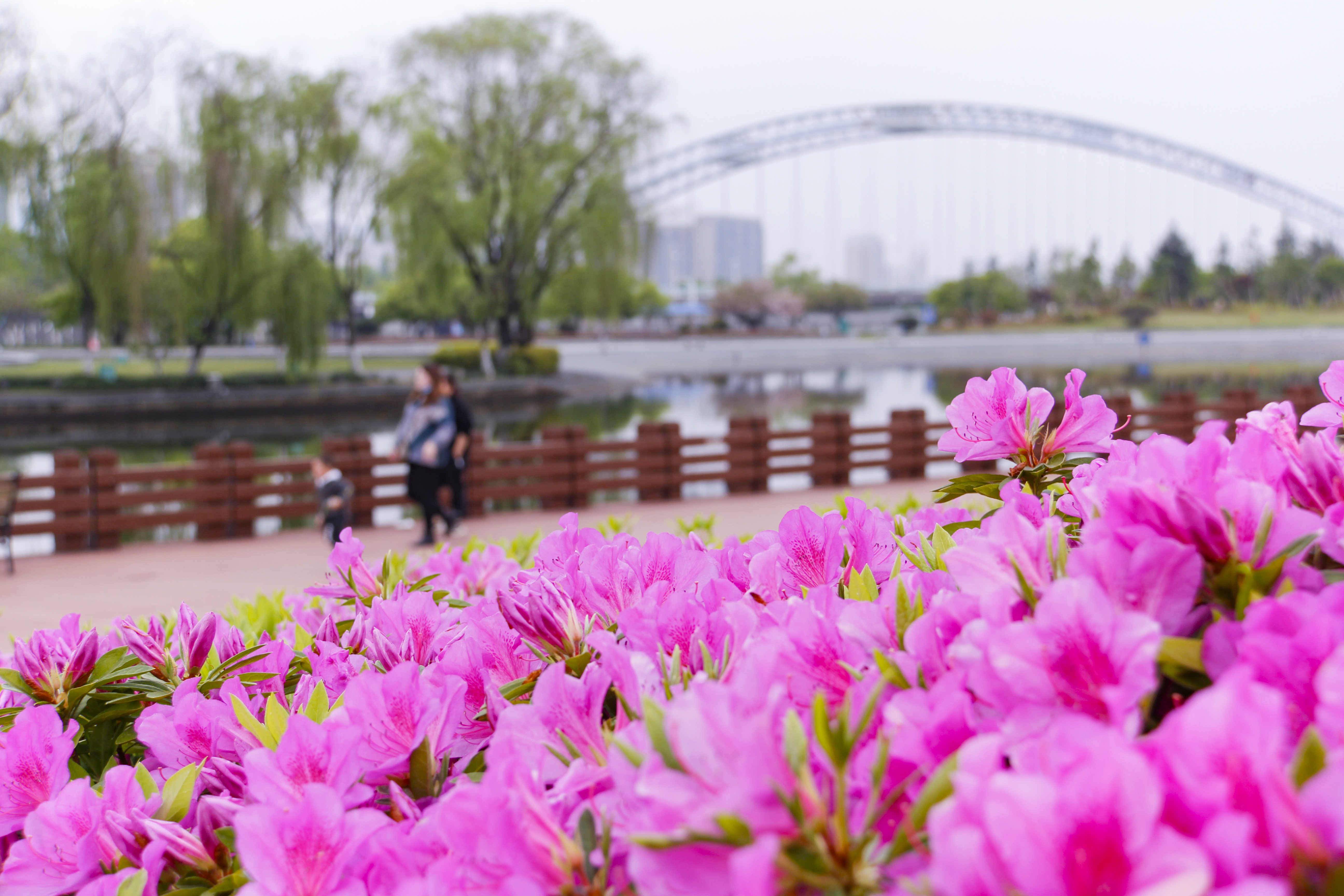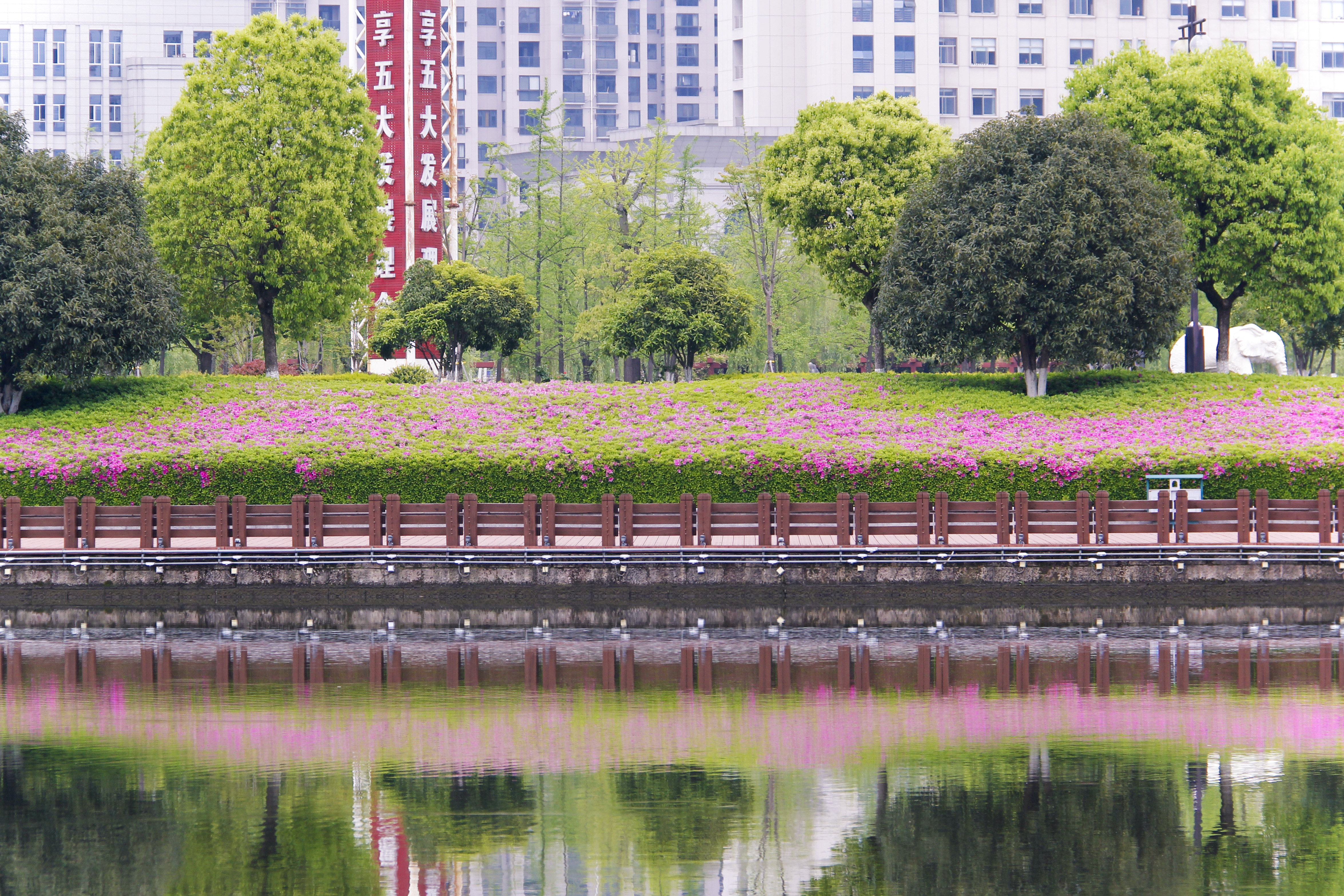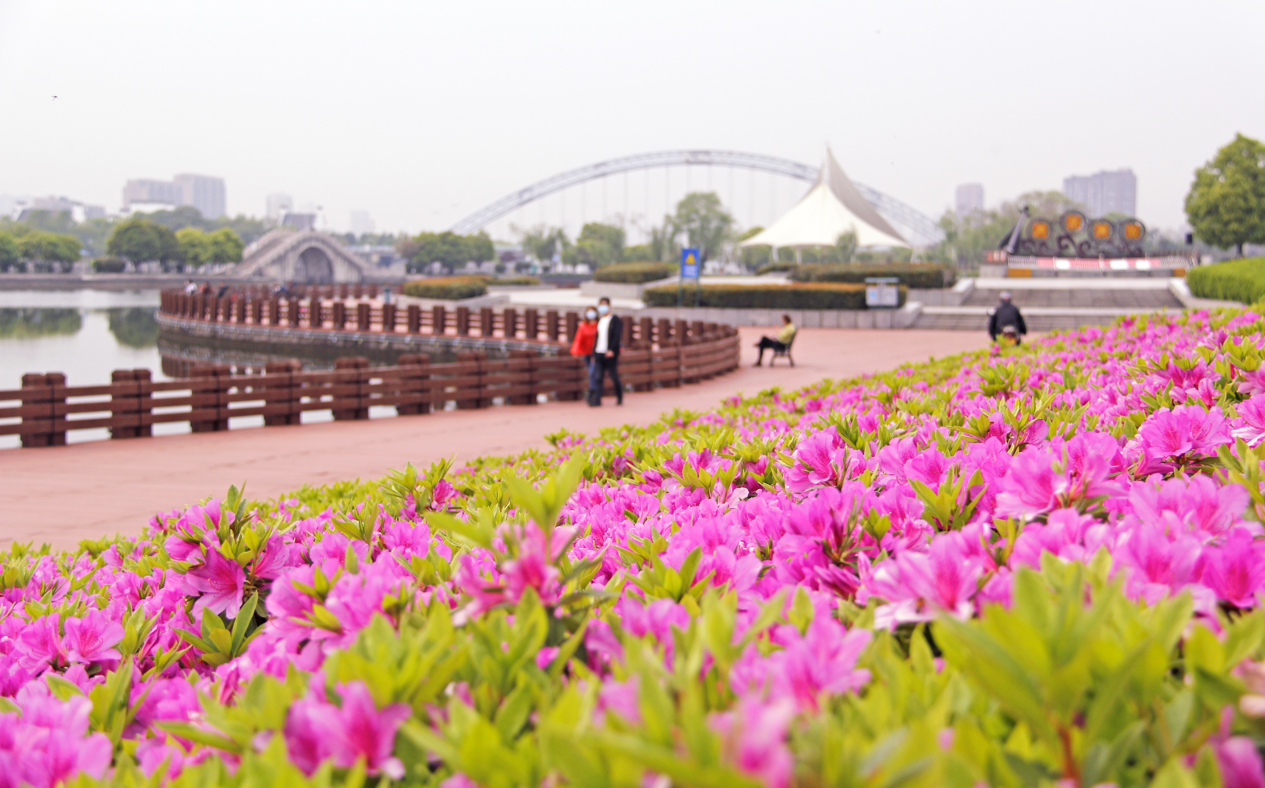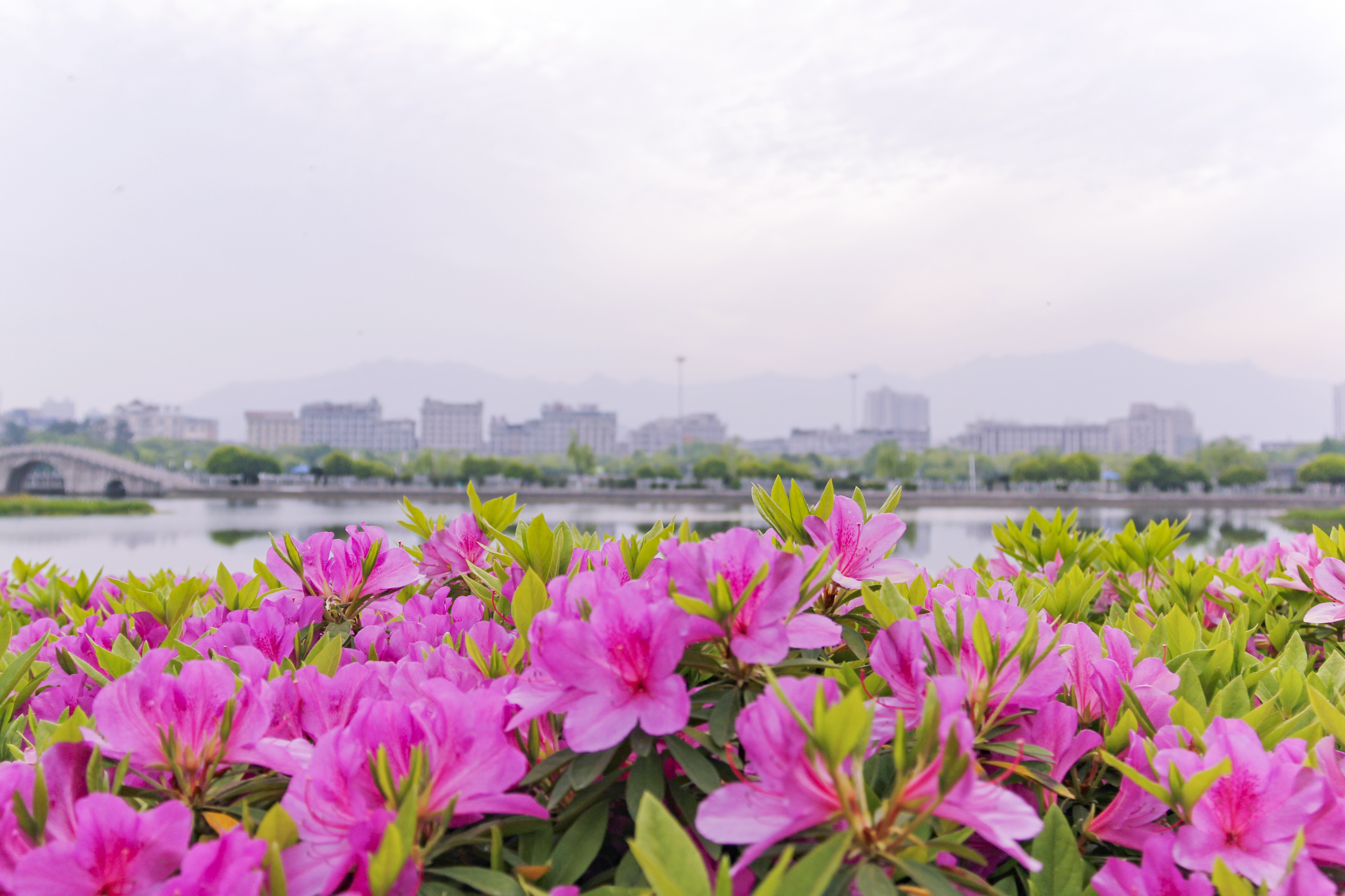 东阳市江滨公园的杜鹃花已经进入盛放期,红色的花朵在江面的倒影中如火如霞,美不胜收。