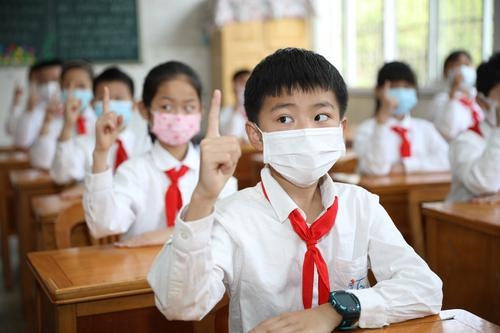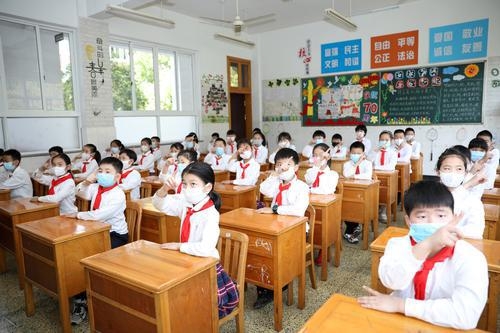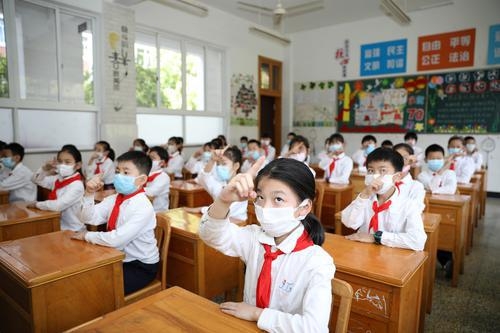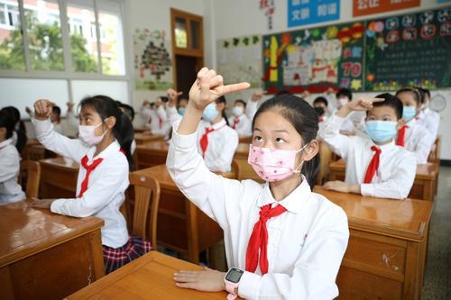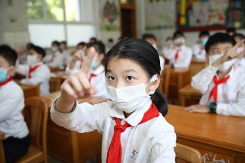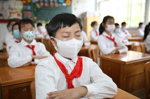 4月28日,东阳市江北小学的学生在做无接触式眼保健操。为减少手眼接触感染病毒概率,东阳市江北小学教育集团在两个校区开始采用 “无接触式眼保健操”,通过眼球与手指合一的动作,全程手眼无接触放松眼睛。