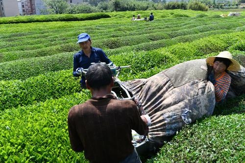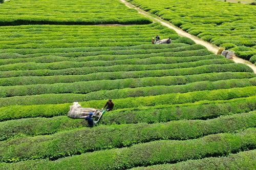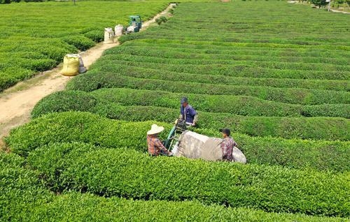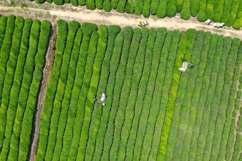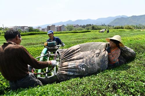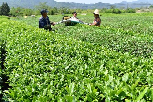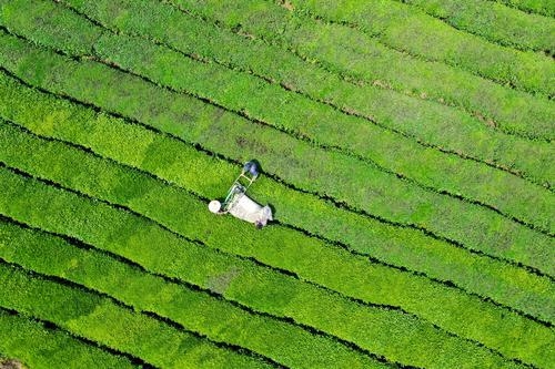 4月28日,东阳市良种场附近的茶园里,工人在使用采茶机采茶。谷雨过后,为缩短采摘周期,保证茶叶质量,东阳市的一些茶叶种植户开始使用采茶机提高采摘效率,大批量采收茶叶。