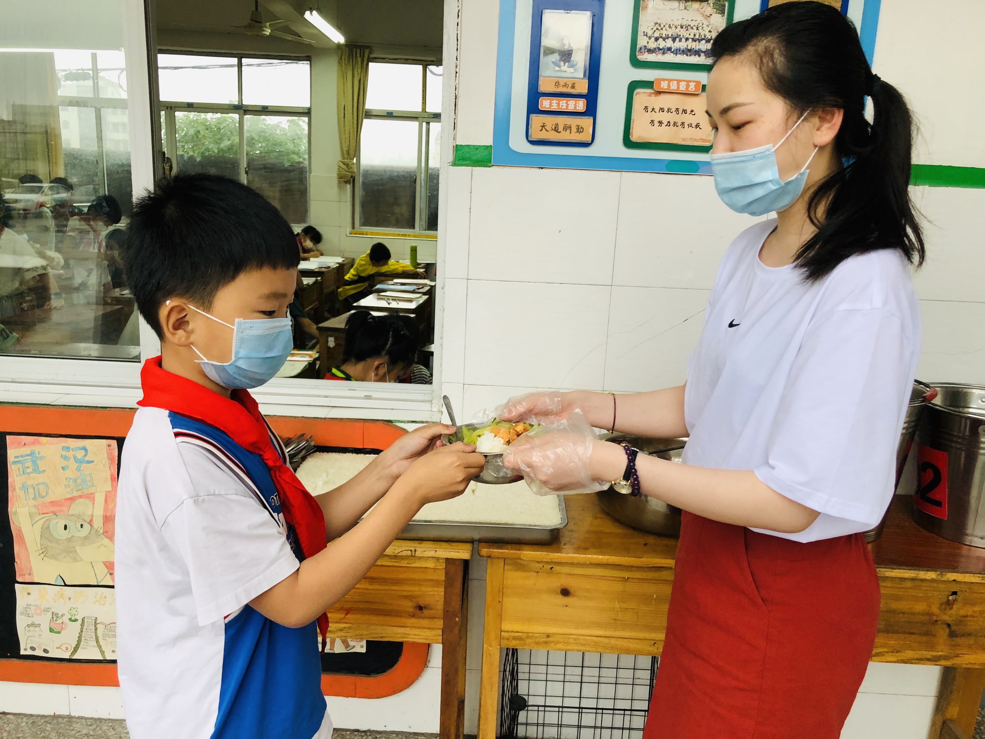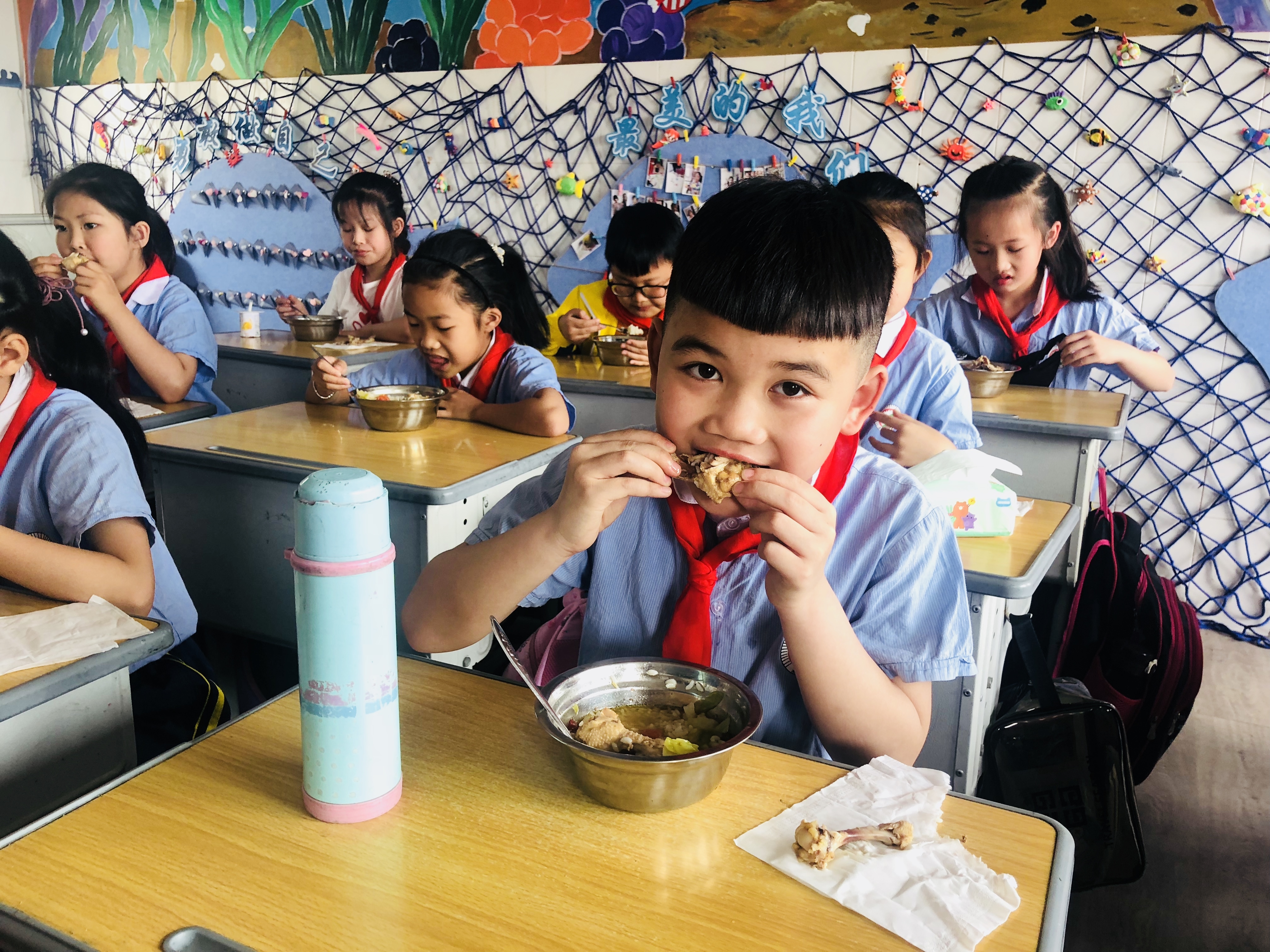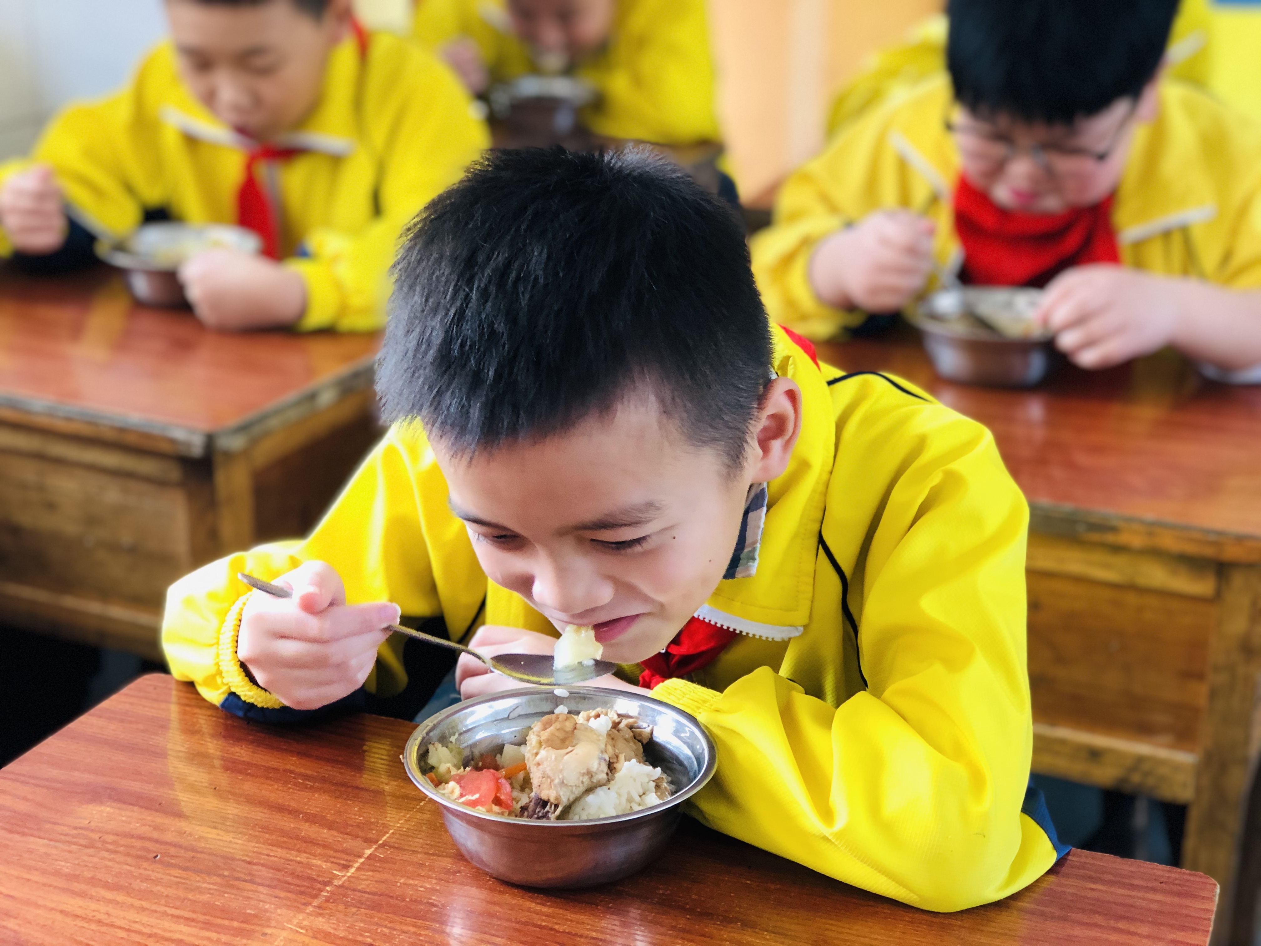 复学后午饭分餐到班,湖田小学迅速制定新的陪餐制度,每天每班两名教师共同陪餐,学生吃什么,教师就吃什么。在陪餐过程中,教师会关注菜品质量和用餐秩序,要求“食不言”,让学生养成良好的用餐习惯。学生如果需要加饭菜,可以举手示意。