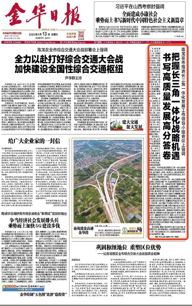 陈龙指出,去年以来,全市上下认真贯彻中央和省委决策部署,积极推进长三角一体化工作,顶层设计不断完善,创新协作加快推进,交通互联互通全面提速,民生共享项目有序实施,取得的成效值得充分肯定。中央和省委对推进长三角一体化发展高度重视,金华是这项工作的重要参与者,更是直接受益者,我们要进一步统一思想认识、强化使命担当,准确把握在长三角一体化发展中的角色定位,努力推动各项工作取得更大成效。