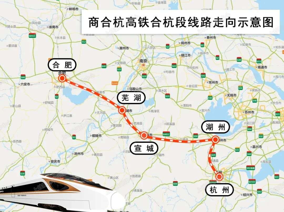 南段(合肥—杭州)也称合杭高速线,主要途经巢湖、芜湖、宣城、广德、安吉、湖州等城市,在湖州站接入宁杭高铁,终抵杭州东站,计划6月30日前具备开通条件。