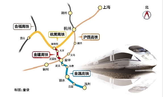 金建高铁是沪昆、杭黄两条高铁的重要联络线,也是温州至黄山通道的重要组成部分。北经杭黄铁路,可连接合福高铁至合肥,南经沪昆高铁,可连接金温铁路至温州,同时串起4条高铁,构筑起浙江东部沿海往中部腹地的快速客运通道。