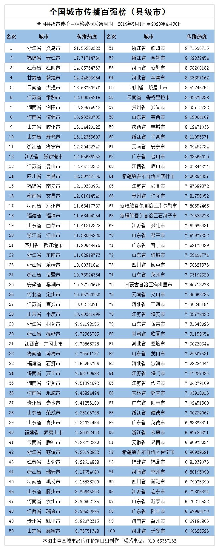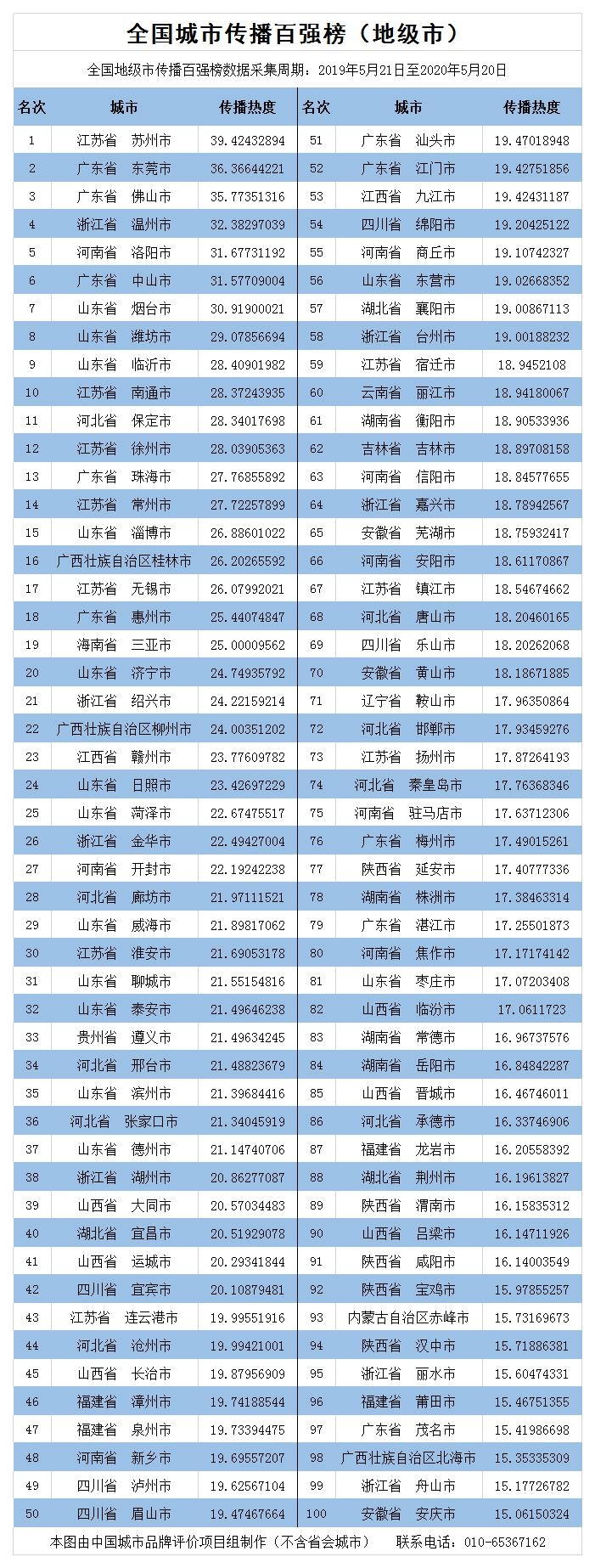 全国城市传播热度排名是中国城市品牌评价项目组、人民日报《中国城市报》社,联合清华大学国家形象传播研究中心,根据国家统计局和微热点大数据研究院相关标准和数据,对全国293座地级市、387座县级市近一年表现进行标准化计算后得出的。