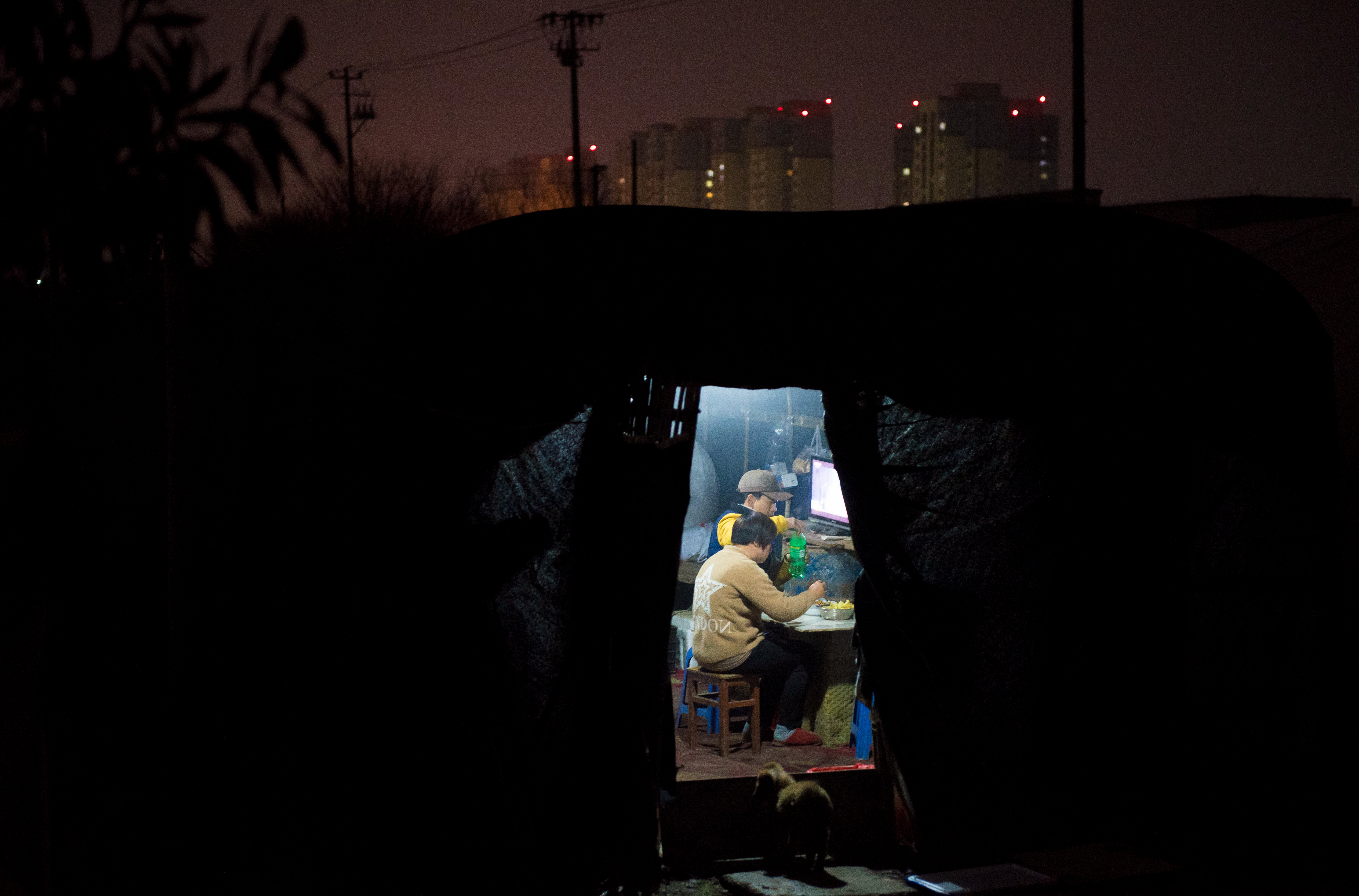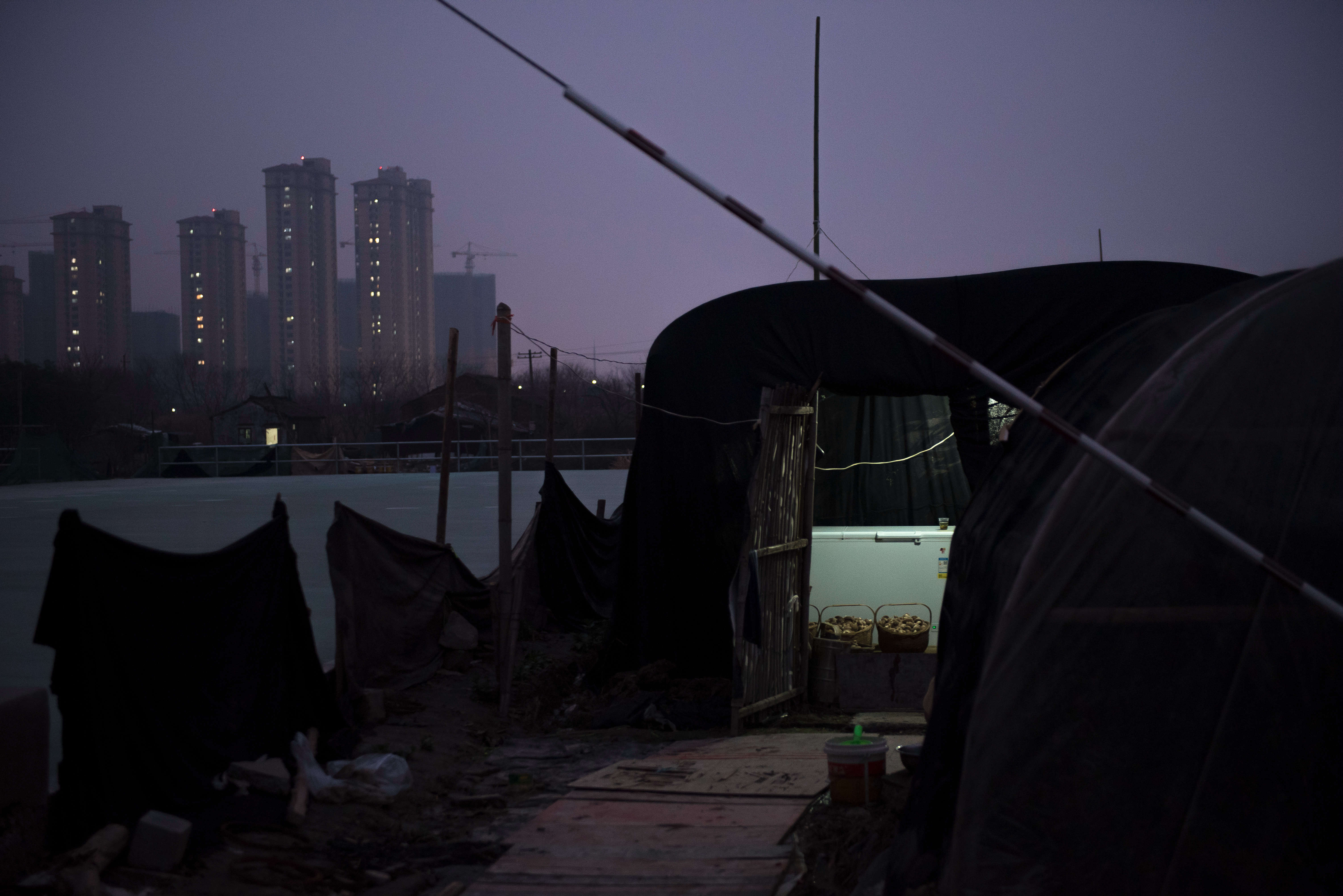 在绍兴市越城区东湖街道浪头湖村,绍兴市粮食批发市场围墙外有两个白色塑料大棚,棚里氤氲的水汽中,摆满了一簇簇棕色的香菇菌棒。大棚南侧的角落里有一个用竹片、薄膜、遮阳网搭成的黑色小棚屋,一片帘子把十多平方米的空间分成了两半,外面是厨房兼客厅,里面是卧室。放在废旧油桶上的一台电视机和靠在墙边的一个冰柜,是屋里最值钱的家当。