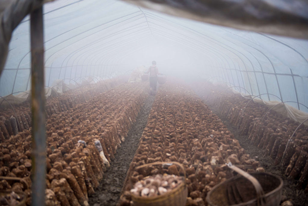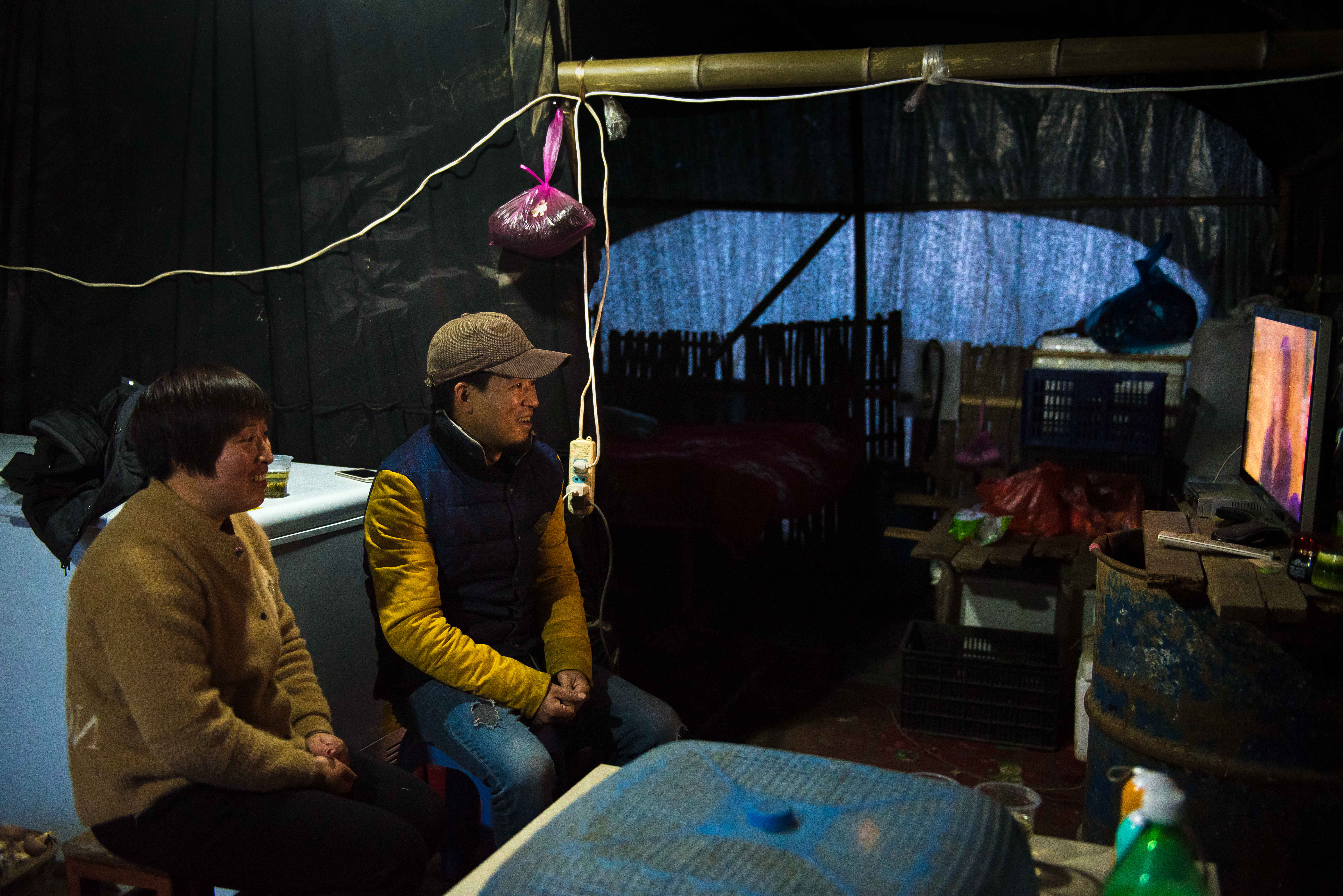 午饭后,许国强夫妇穿上雨靴进棚采摘香菇。绍兴水乡的田里都是黏脚的烂泥,一步一滑地弓着腰摘菇,隔三岔五地再补点水,是下午的全部工作内容。从吃过晚饭到睡觉前的这段时间,夫妻俩坐在一起看会儿电视,是一天中难得的空闲时间。下午采摘下来的香菇满满地装在一个个竹篮里,香气慢慢在房间里弥漫开来。因为在塑料袋里装久的香菇会闷坏,夫妻俩等第二天凌晨再次早起、称重、装袋。