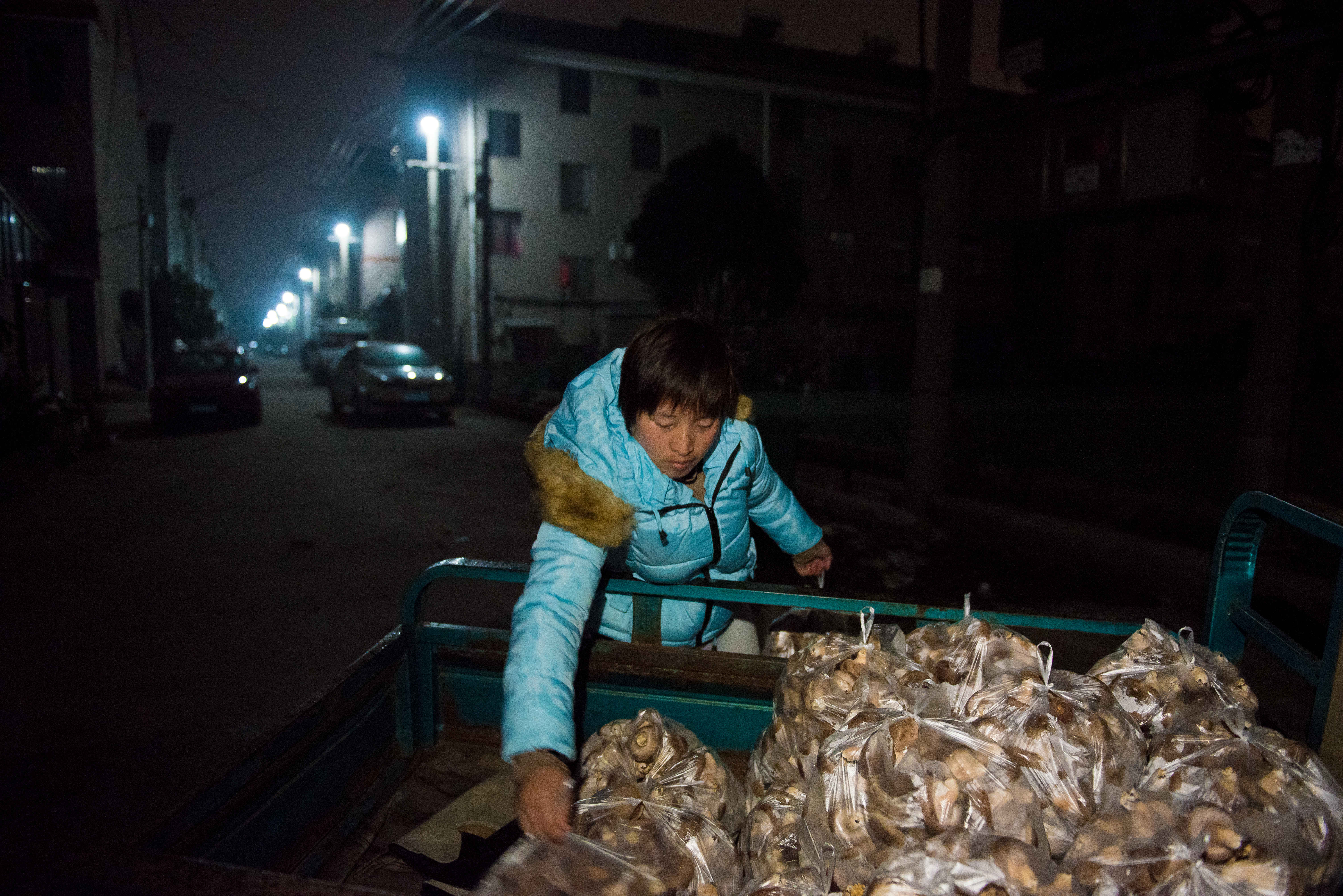 许国强和爱人李芳打开电灯,穿衣起身,一边哈着白气一边给头天采摘下来的香菇称重,用白色和蓝色塑料袋分别按2.5公斤和5公斤分量包装,再搬到门外的一辆电动三轮车上码放整齐。