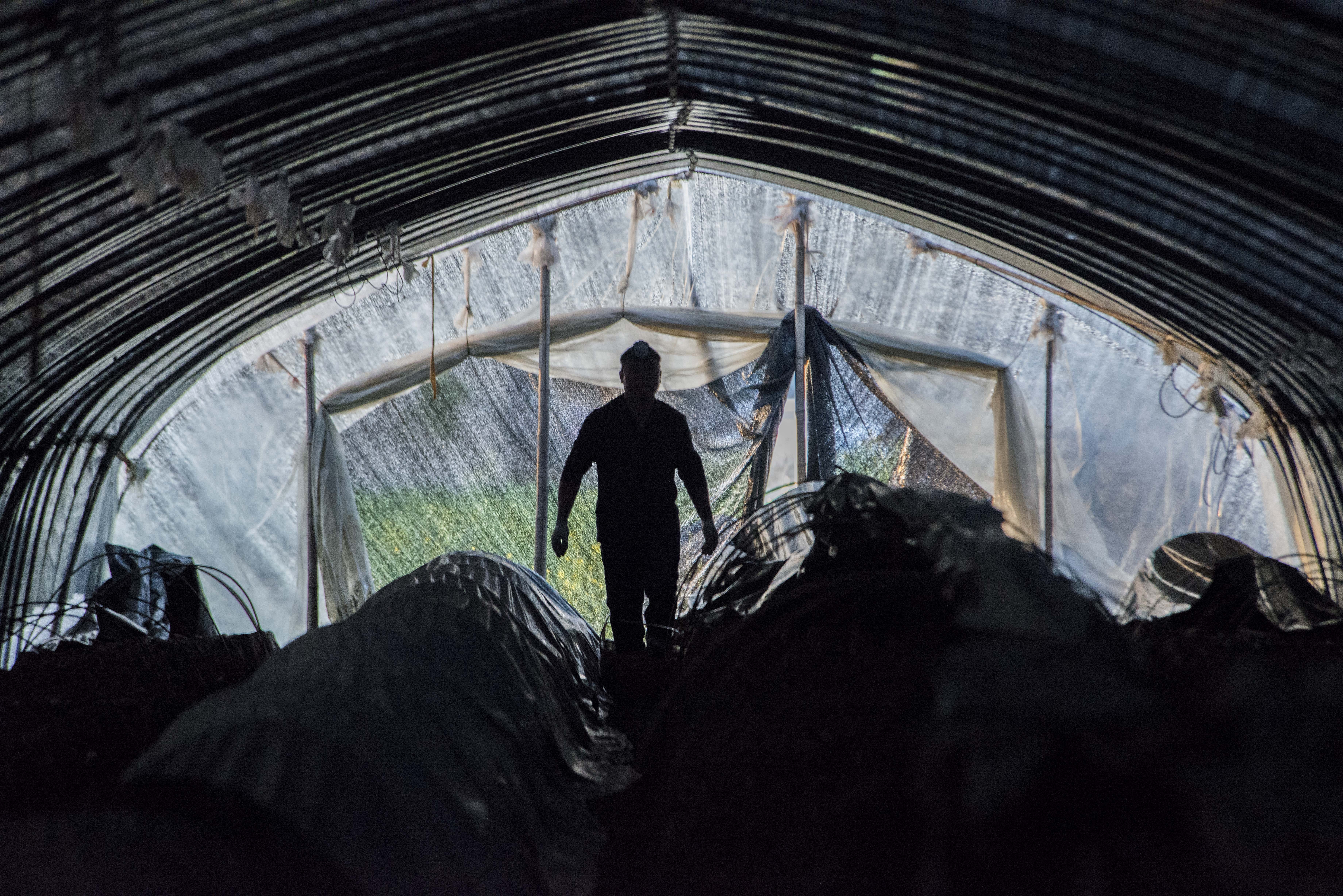 (出于尊重被采访对象的意愿,我们未将小武及其父母的影像呈现在此。图为位于上海嘉定区的一处菇棚和在此劳作的武义菇农。)