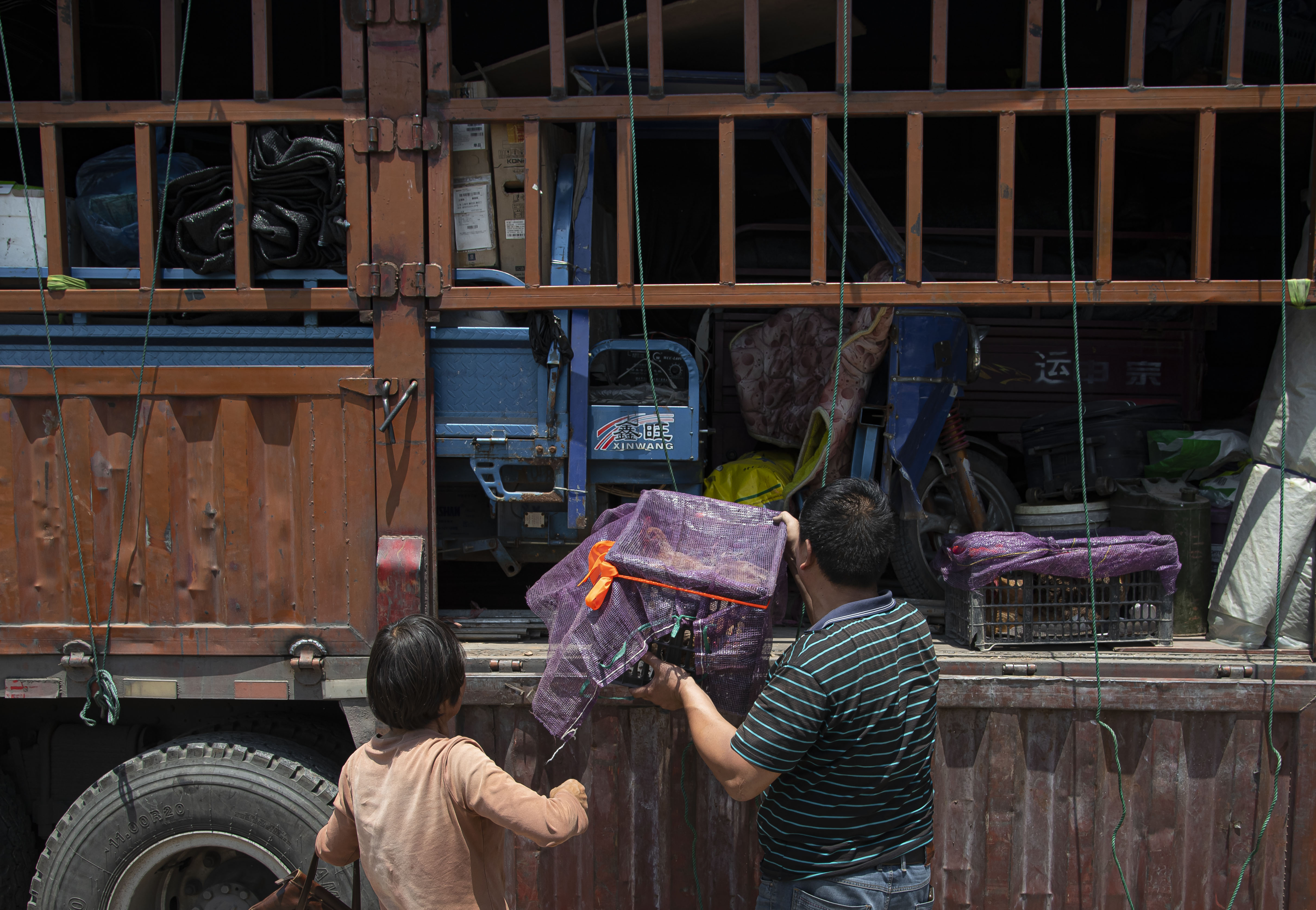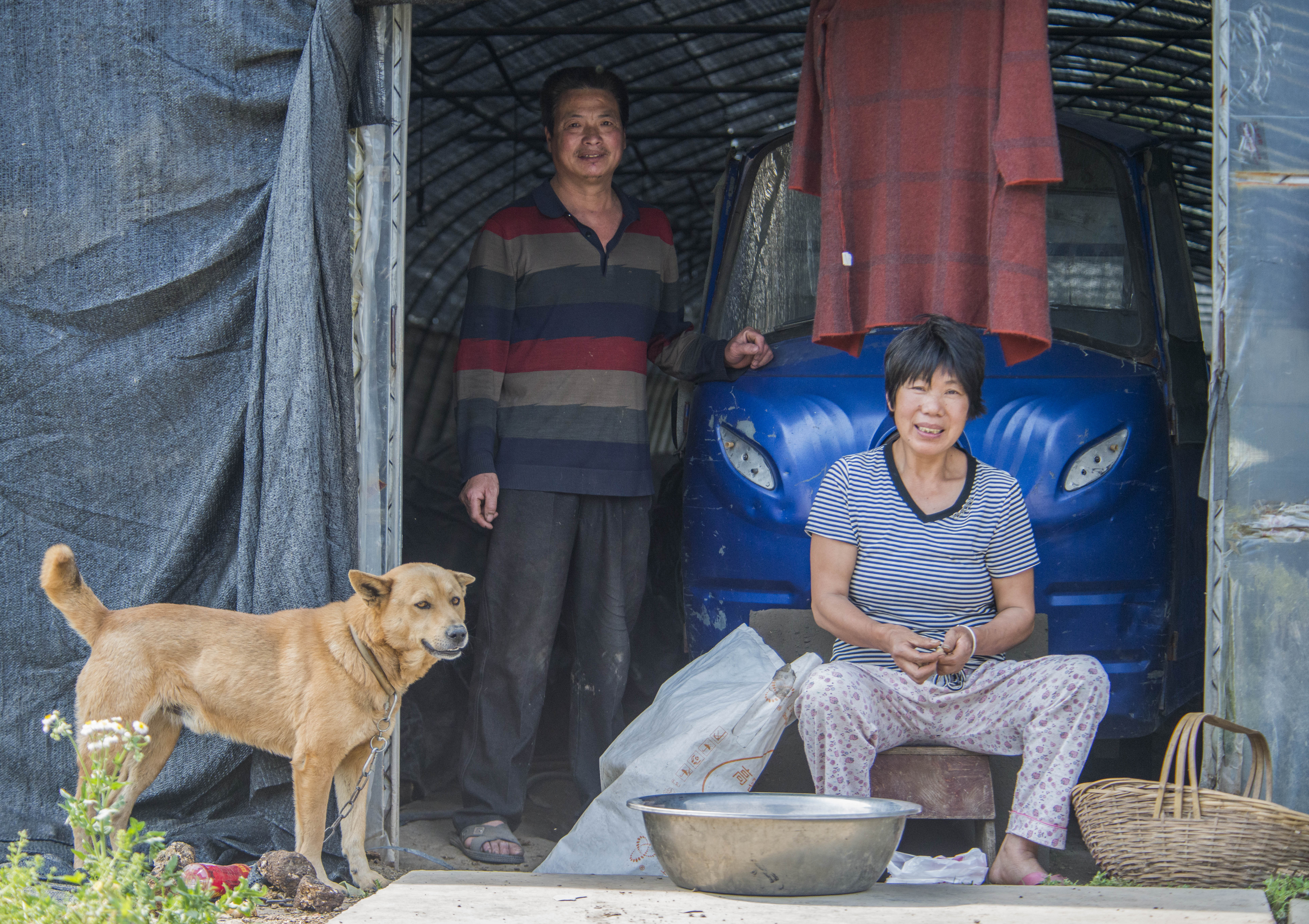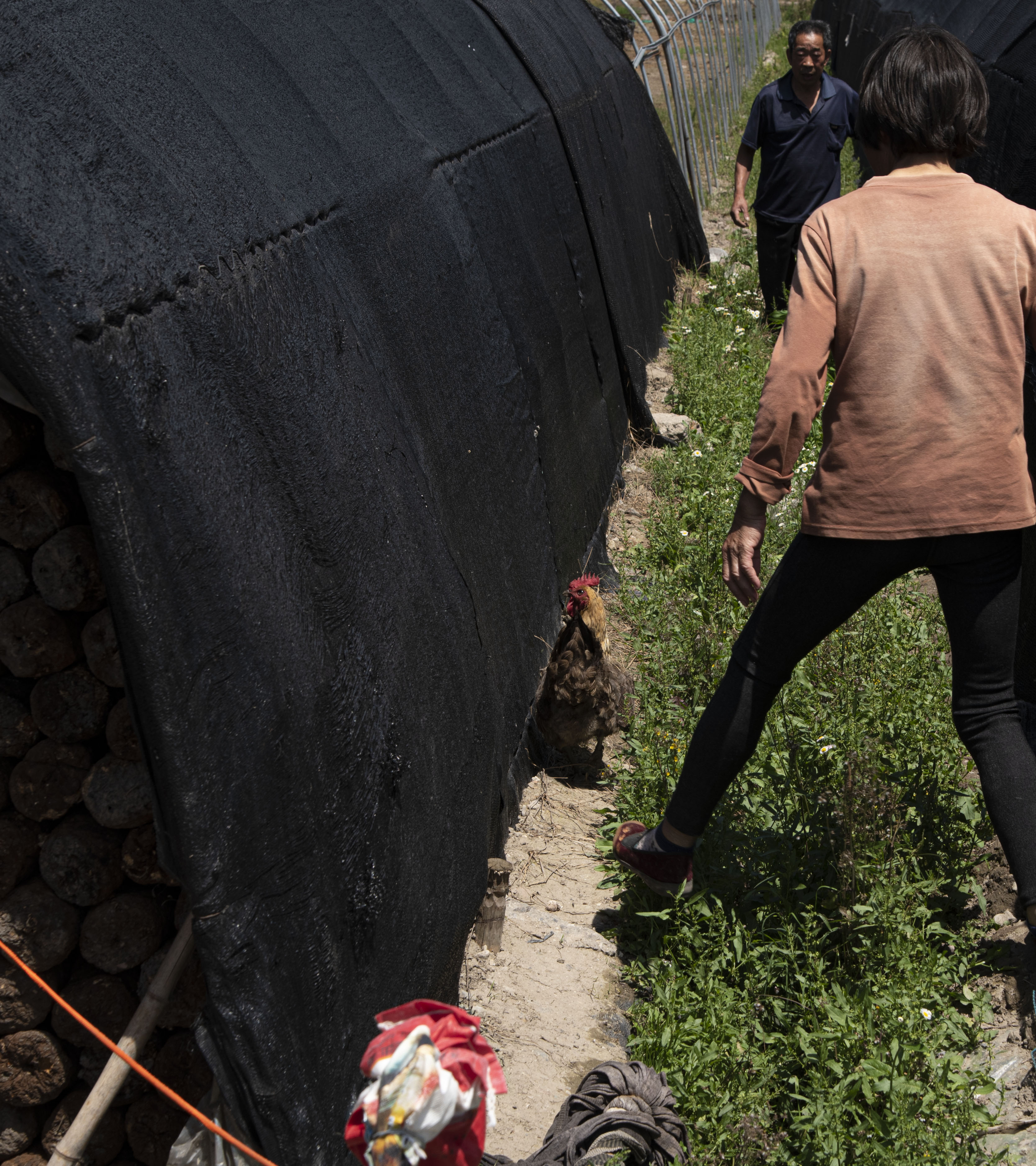 然后是生活用品,包括衣物、被褥、家电、家具,以及没吃完的米面油醋。鸡和狗也要带的。把13只满地跑的鸡活捉进笼,可着实费劲又费时,此起彼伏的尖锐鸣叫让这个正午变得更加闷热、烦躁。土豆、螺蛳、鸡蛋是菇棚外的额外收获,整整齐齐地码放在盒子或罐子里,算是菇农们带给家人的礼物。
