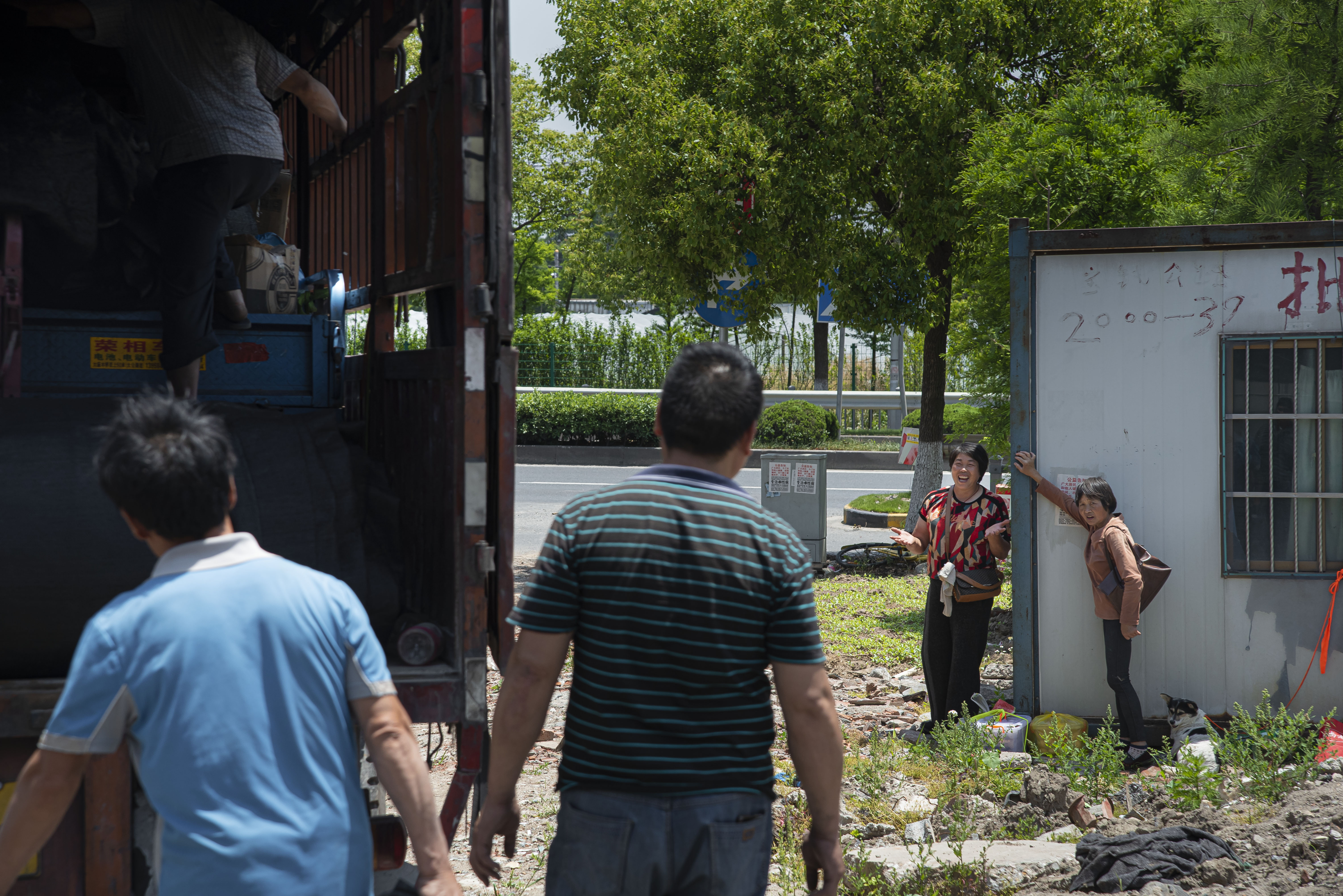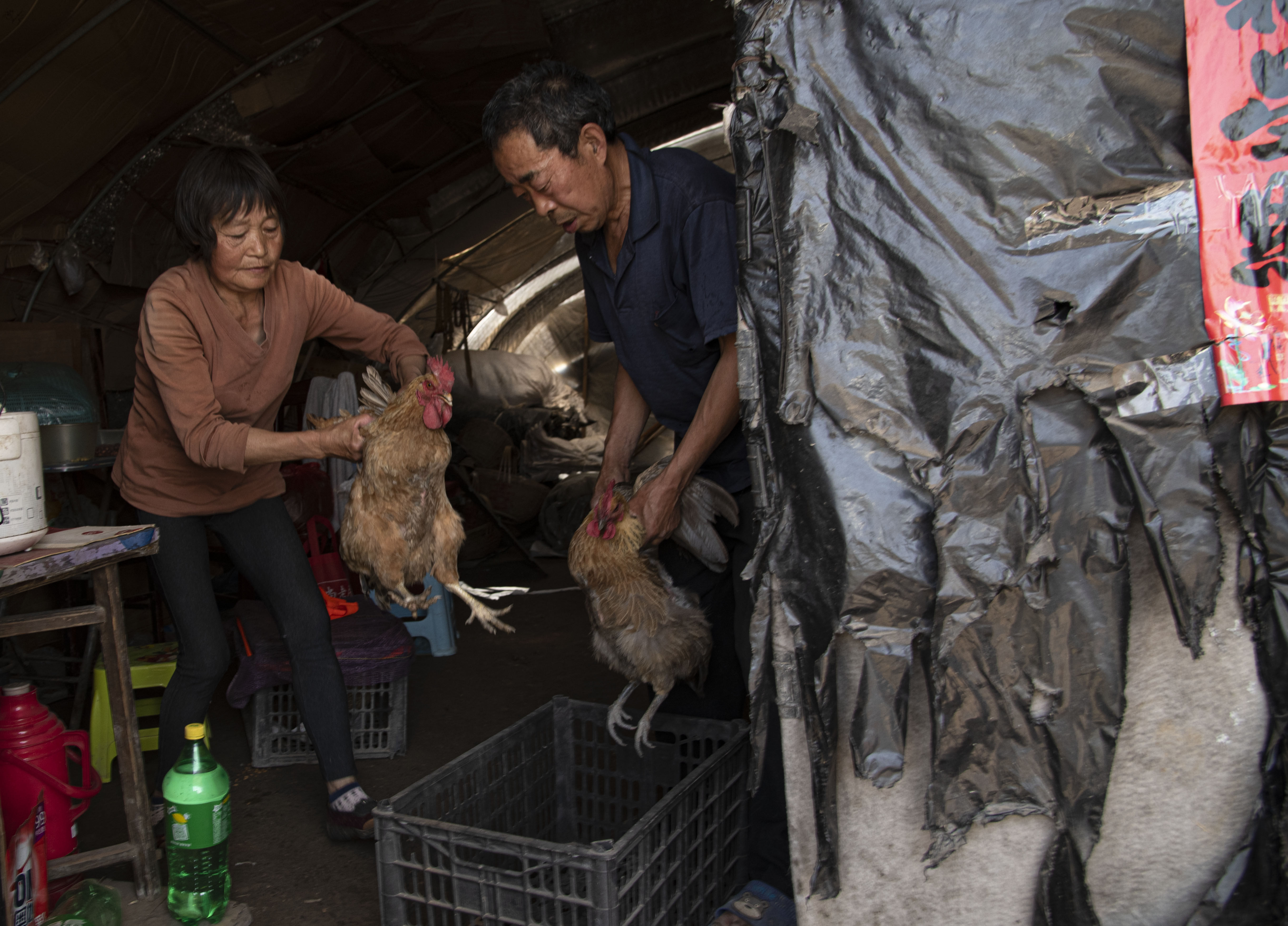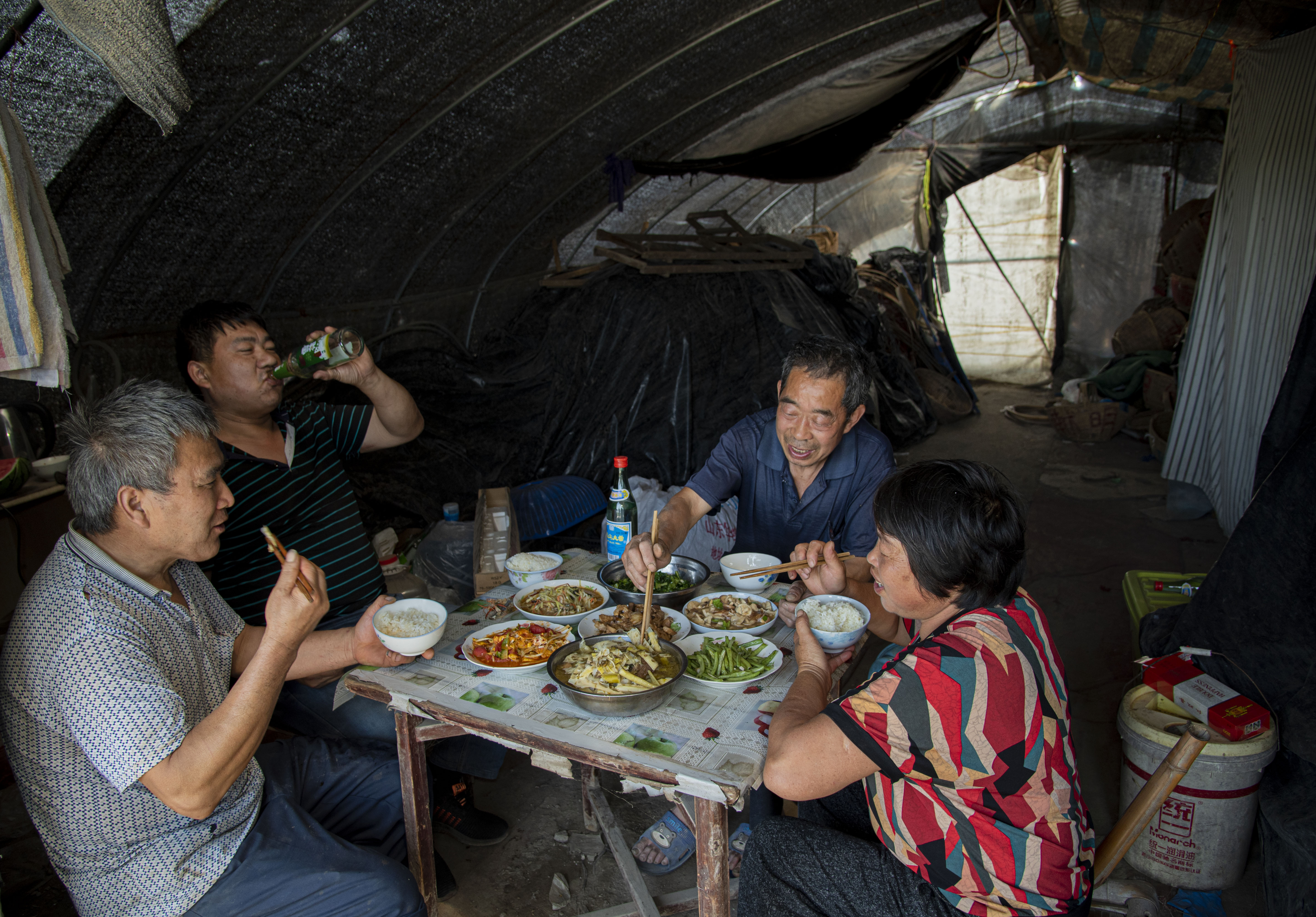 然后是生活用品,包括衣物、被褥、家电、家具,以及没吃完的米面油醋。鸡和狗也要带的。把13只满地跑的鸡活捉进笼,可着实费劲又费时,此起彼伏的尖锐鸣叫让这个正午变得更加闷热、烦躁。土豆、螺蛳、鸡蛋是菇棚外的额外收获,整整齐齐地码放在盒子或罐子里,算是菇农们带给家人的礼物。