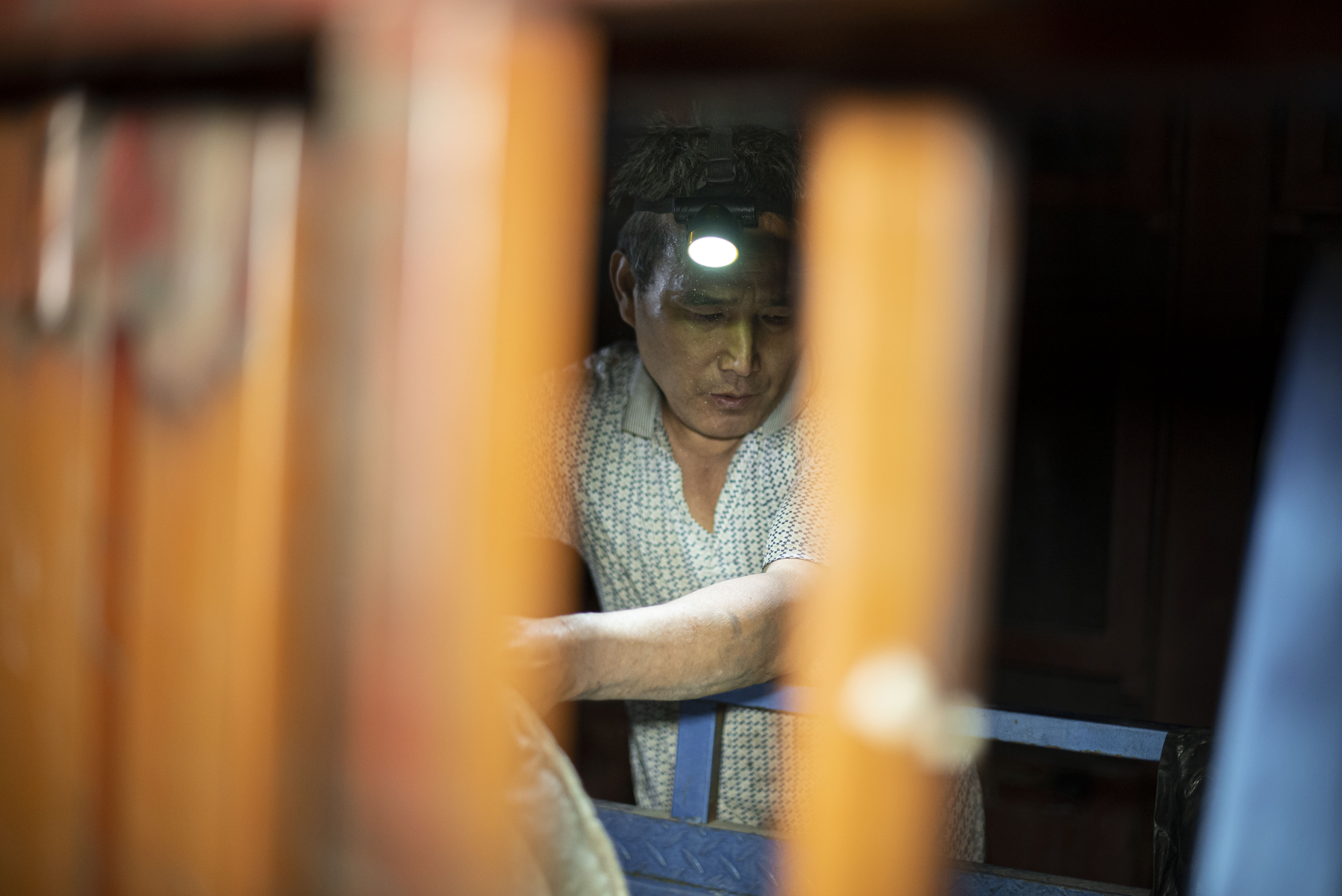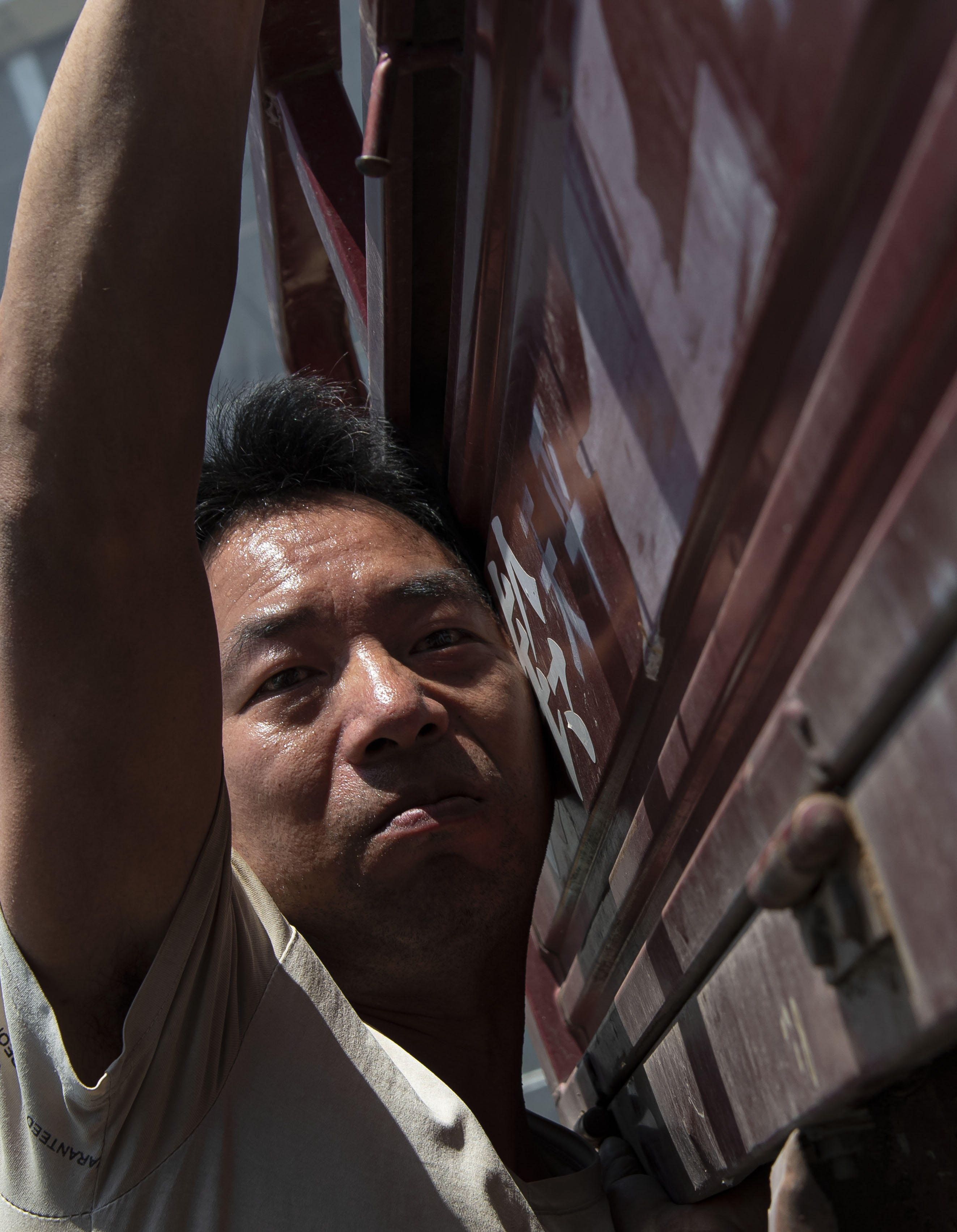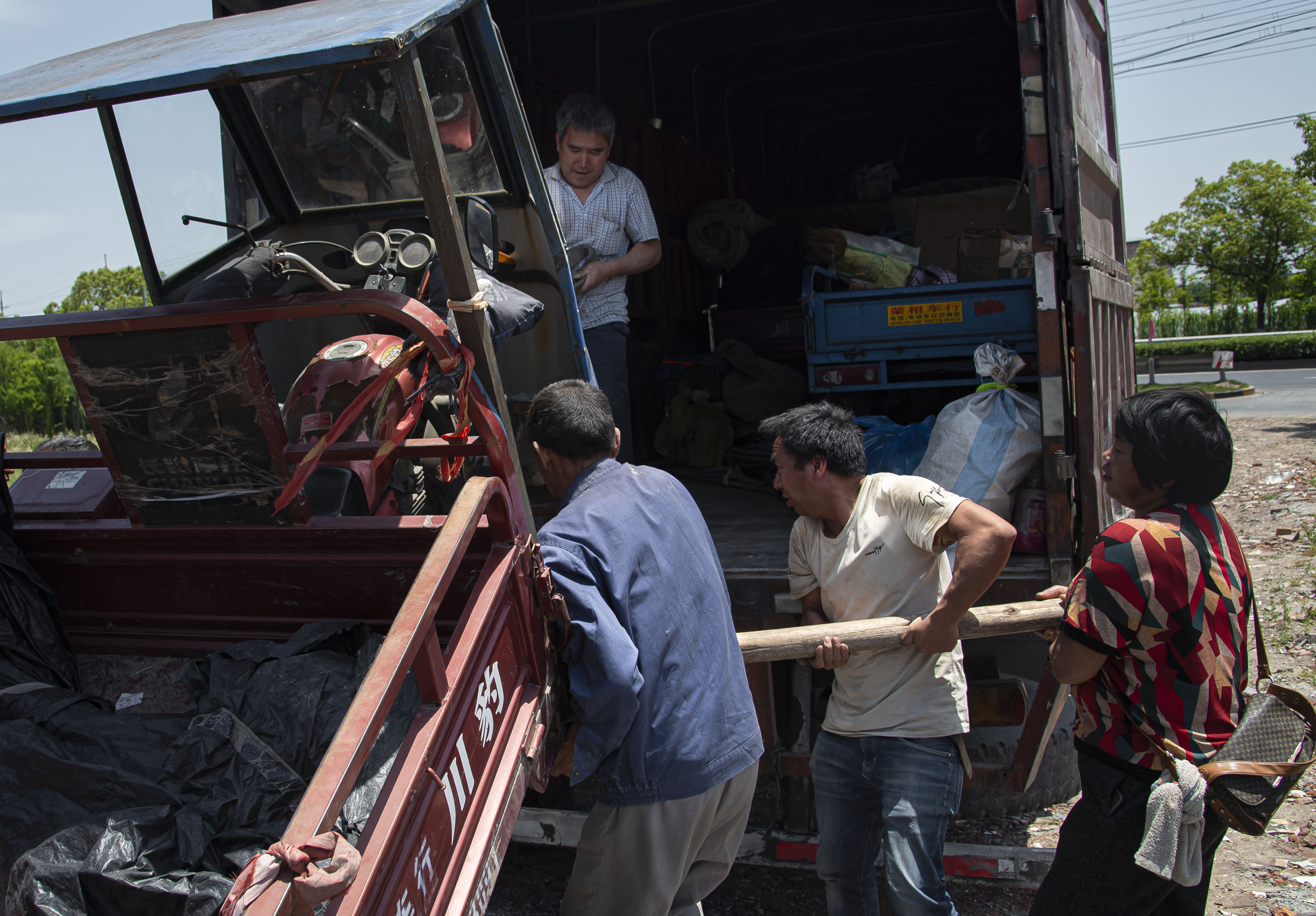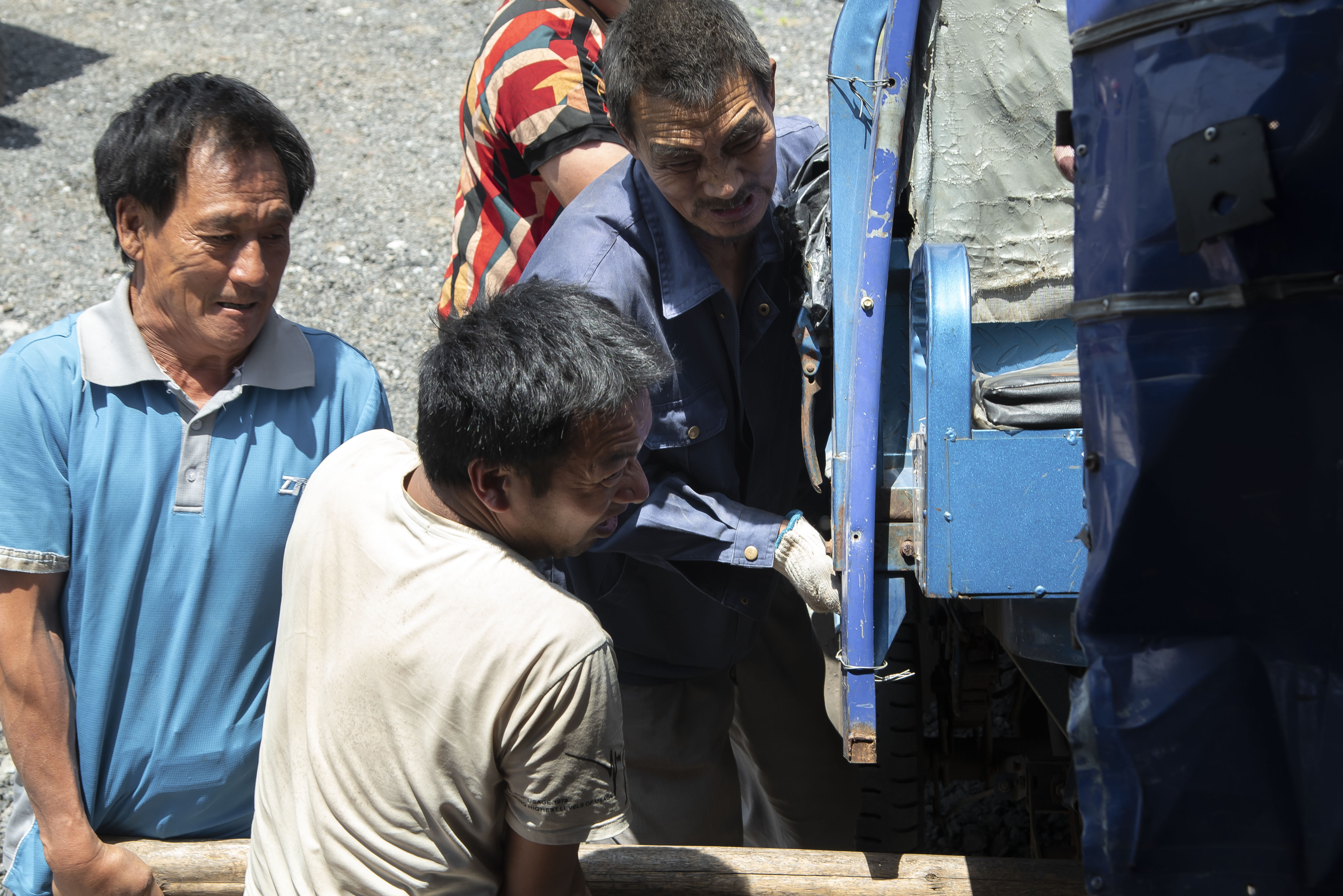最后要上车的,是各家的农用三轮车。重的近两吨,轻的也有七八百公斤,这些笨重的铁疙瘩是菇农的出行必备。把它们搬上一人多高的货车,可不是两三个人能做到的。用皮带穿过三轮车前轮,车上的两个人像拔河一样,使劲往上拖。座椅下方横插着一根竹竿,一边各有两人,像抬扁担一样奋力架起。与此同时,三轮车的车斗后,还有三四个人使出吃奶的力气往前推。“一二三、一二三……”十几声吆喝后,七八张用力到扭曲的脸才放松下来——一辆三轮车总算被安顿好了。