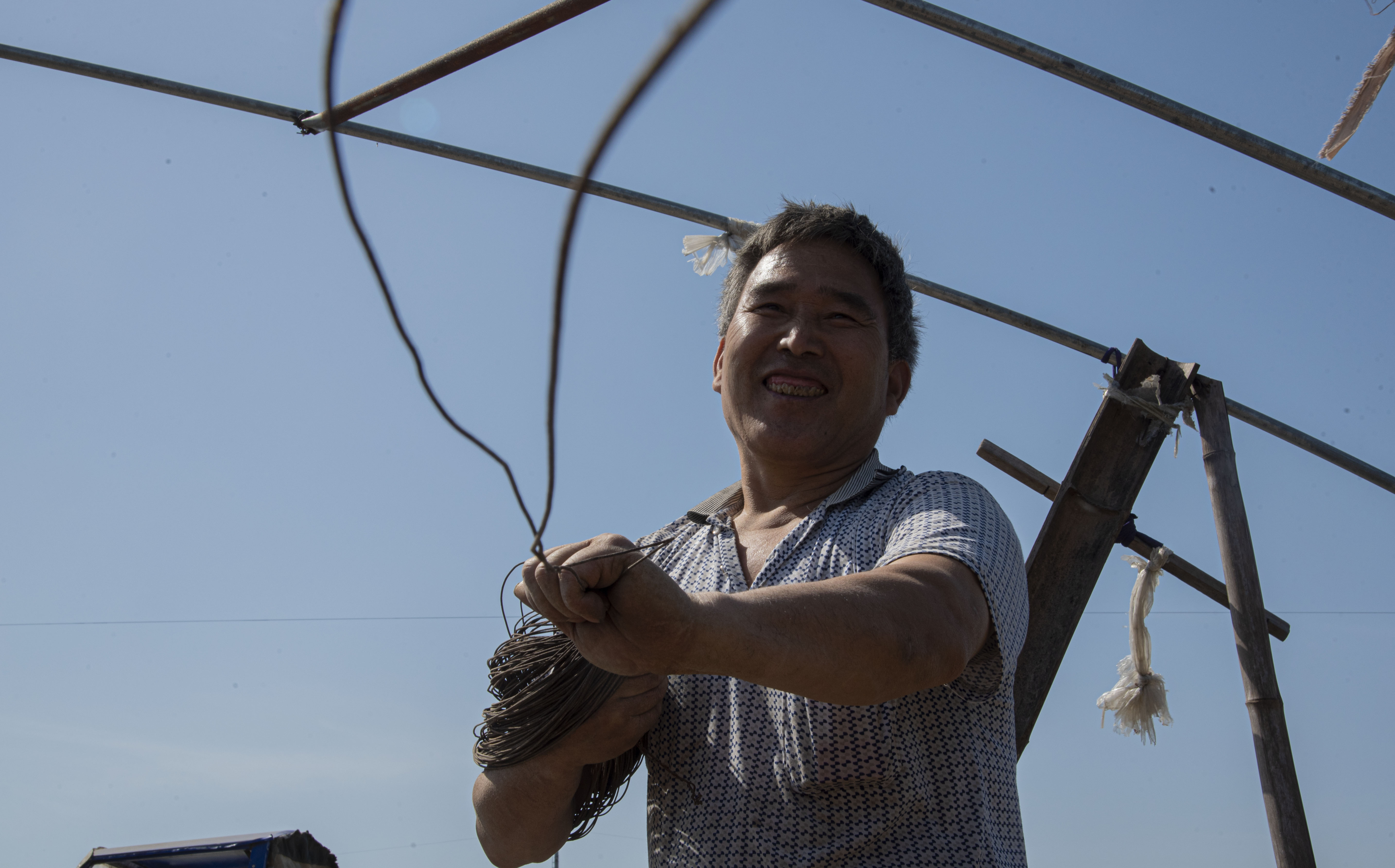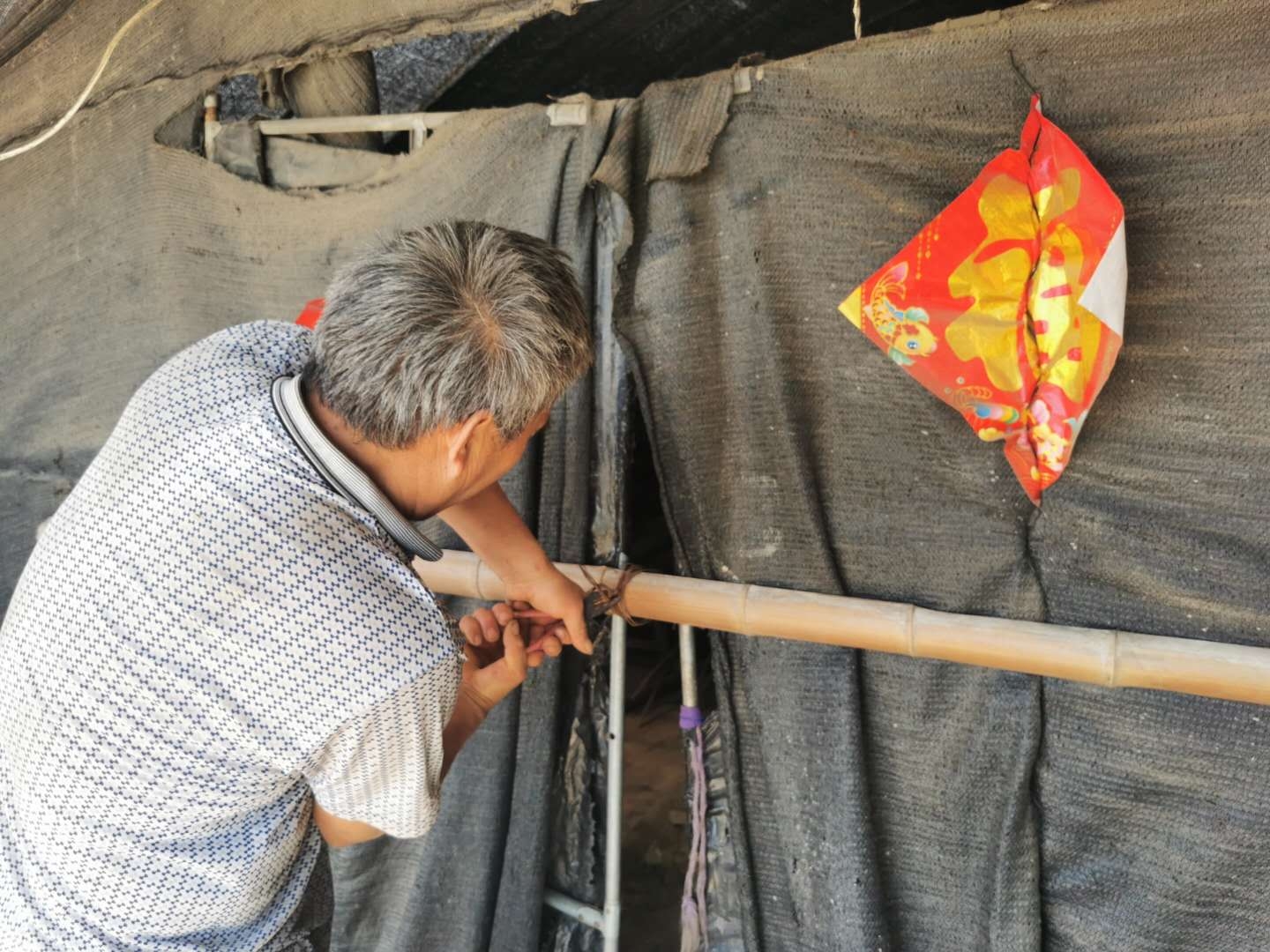 3个多小时后,装车完成。将一根扁担横在菇棚门洞外,两头用4股铁丝与钢架扎在一起,李仙民又用老虎钳拧了好几圈。