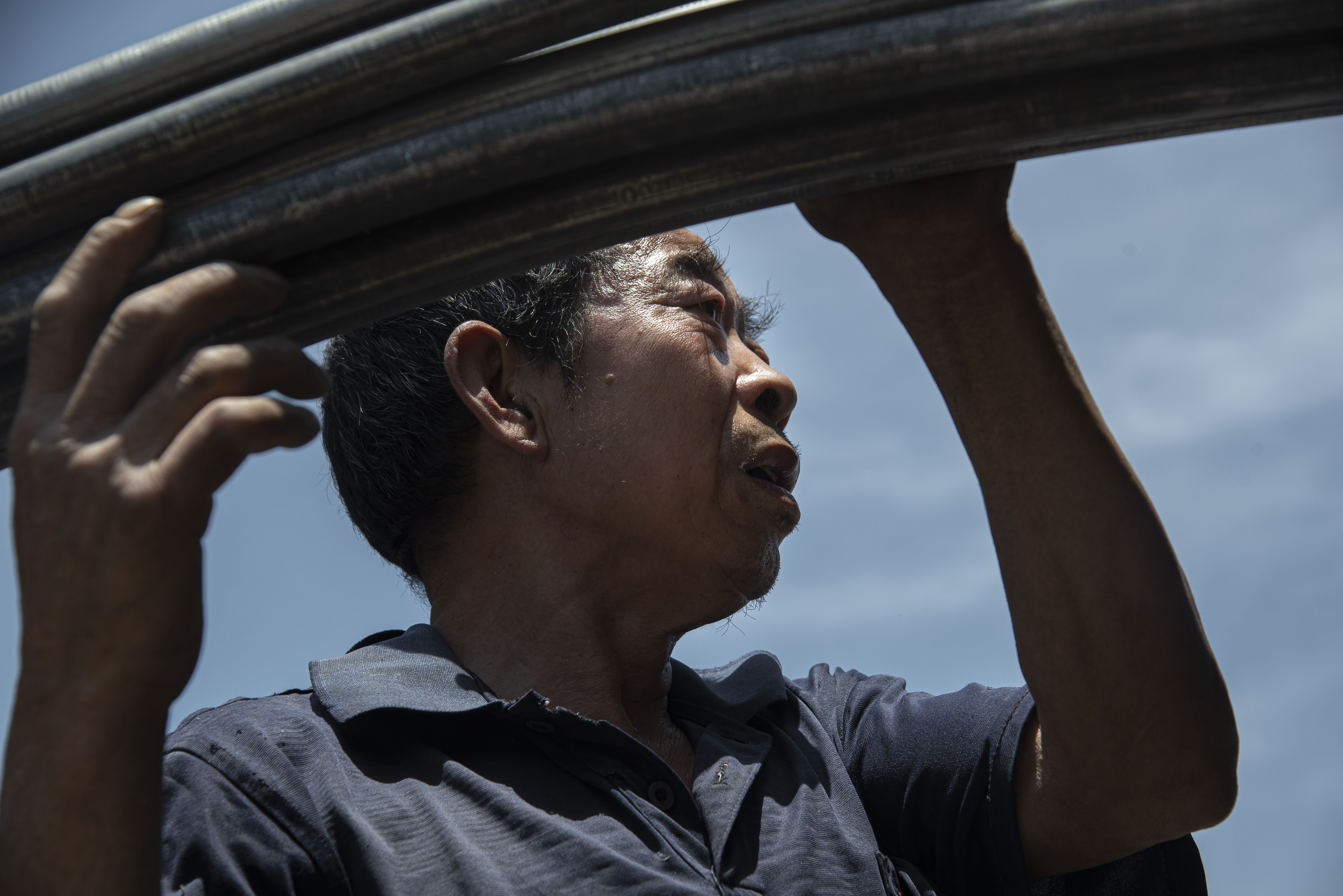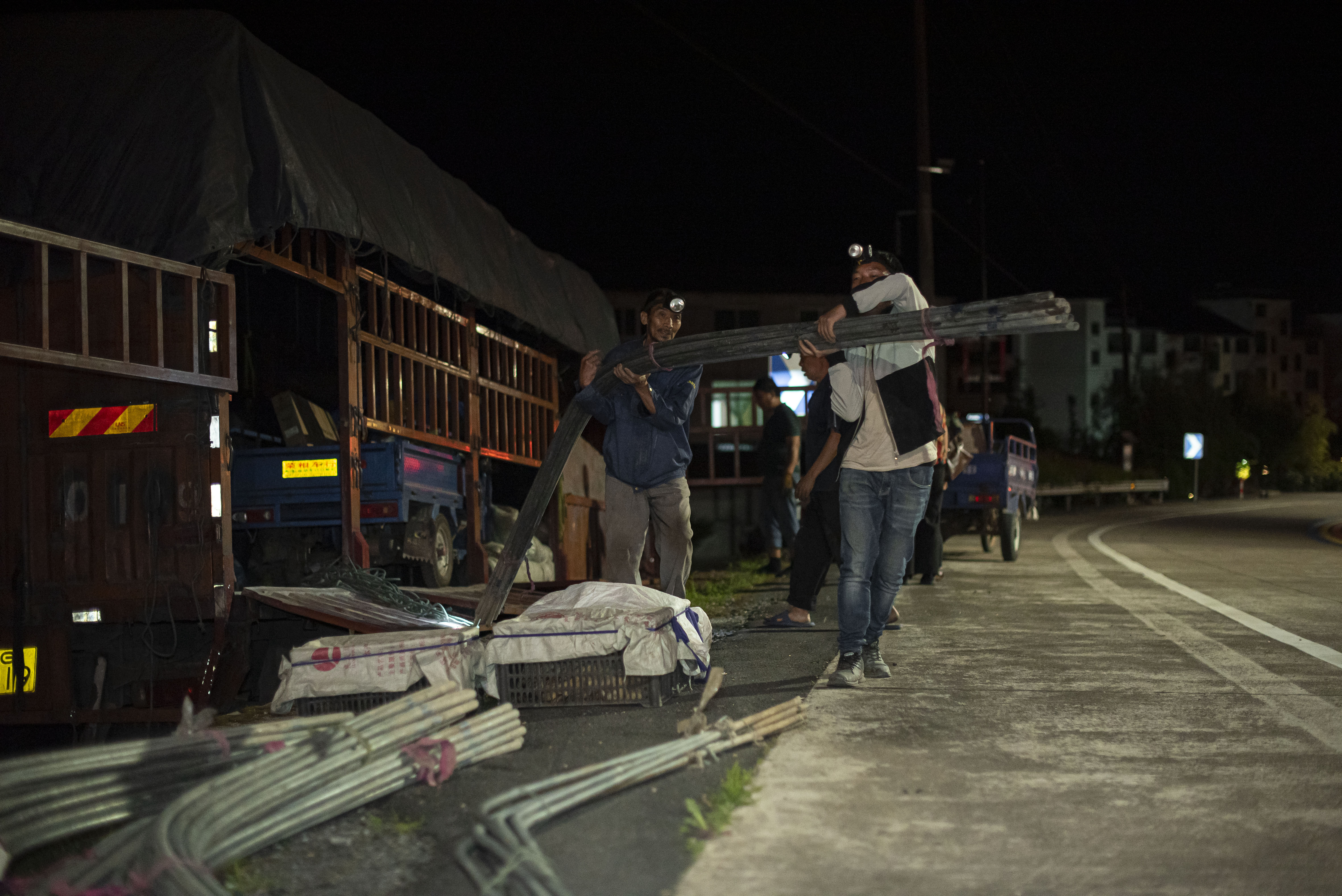 各家的农用车将一捆捆遮阳网、钢管拉到货车旁。一拨人再分成4群,或抬或托,或拉或扛,轮番上阵,将它们搬上车。种菇要用的东西是最重要的,马上又要做菌棒了,家里的菇棚等着用。于是,接下来要上车的,还有泡菌棒的水桶、澡盆,固定菇棚的成捆钢丝……