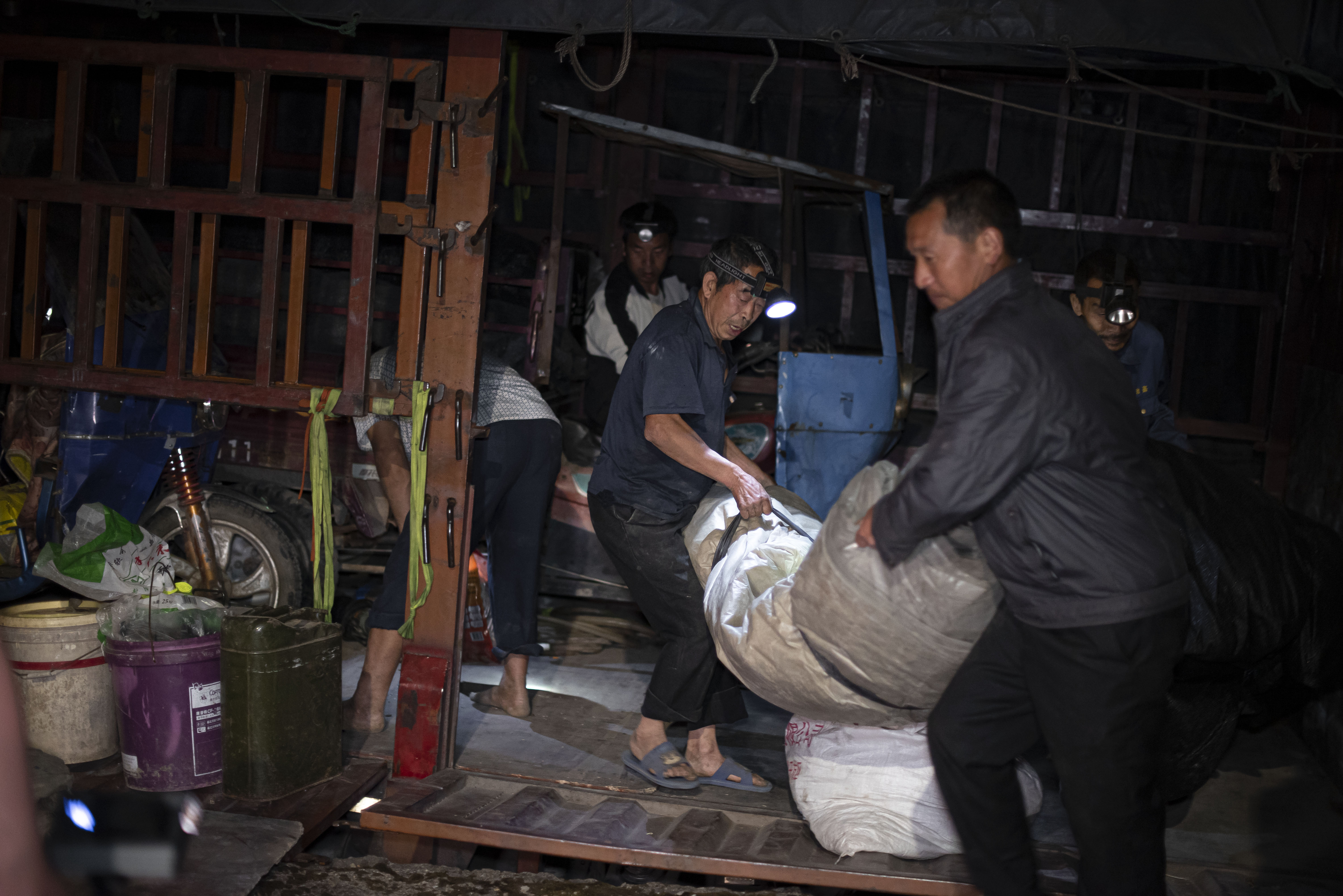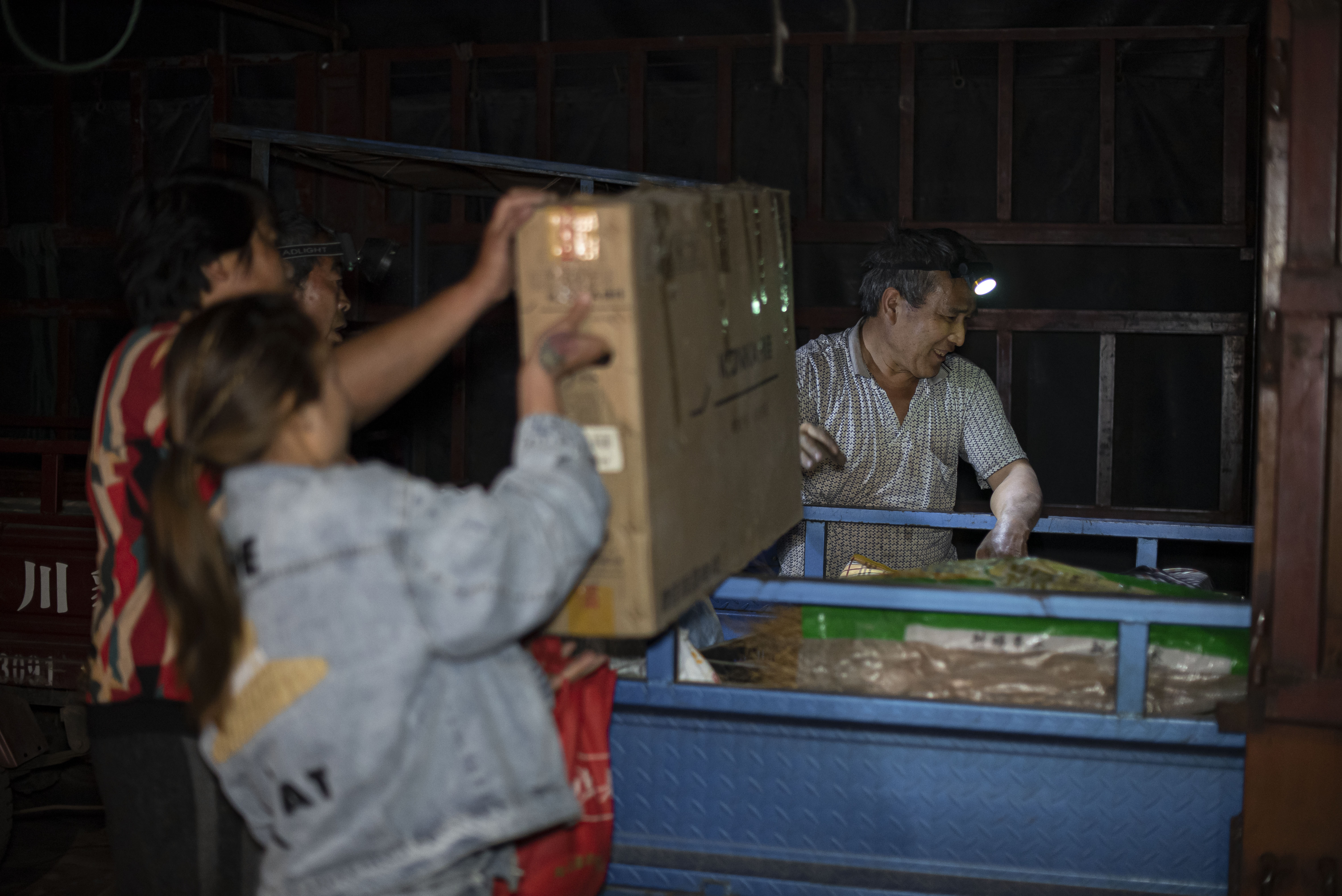 货车停下来,天也黑透了。李春根的儿子李方军等在路灯下,开着一辆白色的越野车。一起等候的,还有李德松的儿子李剑彪、早前回家的菇农李银好。卸货又是一番争分夺秒、热火朝天的景象,重逢的喜悦反倒显得克制了。