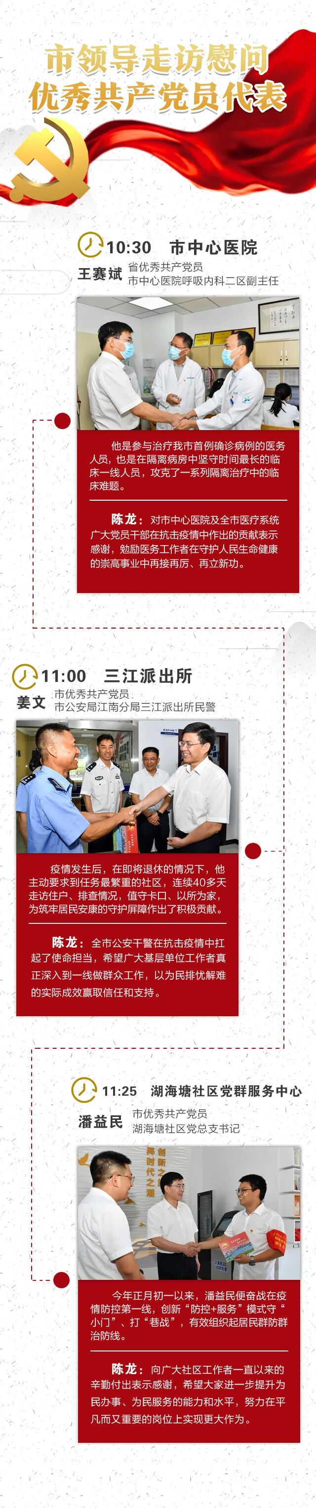 7月1日,市委书记陈龙专程走访慰问省、市优秀共产党员代表,向他们送去党的温暖与关怀,并向全市广大党员致以节日问候和美好祝愿,希望大家继续发扬拼搏实干、争先进位的作风,认真学习贯彻习近平总书记考察浙江重要讲话和省委十四届七次全会精神,在加快打造形成一批“金”字招牌中展现担当作为,交出建设“重要窗口”的金华高分答卷。面对突如其来的新冠肺炎疫情,我市广大医务工作者义无反顾、勇毅逆行,特别是广大党员率先垂范,在一线坚守中诠释着初心使命,涌现出许多先进典型。市中心医院呼吸内科二区副主任王赛斌,是参与治疗我市首例确诊病例的医务人员,也是在隔离病房中坚守时间最长的临床一线人员,攻克了一系列隔离治疗中的临床难题,因工作表现突出,获浙江省优秀共产党员荣誉。看望王赛斌时,陈龙赞赏他发挥了党员的先锋模范作用,对市中心医院及全市医疗系统广大党员干部在抗击疫情中作出的贡献表示感谢,勉励医务工作者永葆医者仁心的职业态度,全力做好常态化疫情防控各项工作,在服务群众的平凡岗位上、在守护人民生命健康的崇高事业中再接再厉、再立新功。