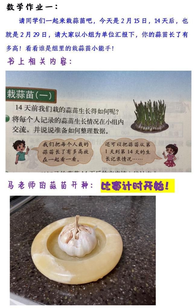 2月,受疫情影响,大蒜成为热门话题之一。四年级数学有一课是《栽蒜苗》,四(1)班数学教师马宝燕认为,当时学生和家长都居家,正好可以完整地观察、记录蒜苗生长的全过程,是一个引导学生和家长进行亲子探究学习的好机会。于是,她在班里开展了栽蒜苗比赛。