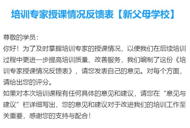 反馈表不记名,且不对培训专家反馈,学员们可以对课程设计、专家授课、培训主题、培训效果、服务团队等进行真实评价,畅所欲言。东阳市教师进修学校教务处及时采集和数据分析,作为制订下学期培训方案的参考内容之一。据统计,近几年学员培训满意度达99%。