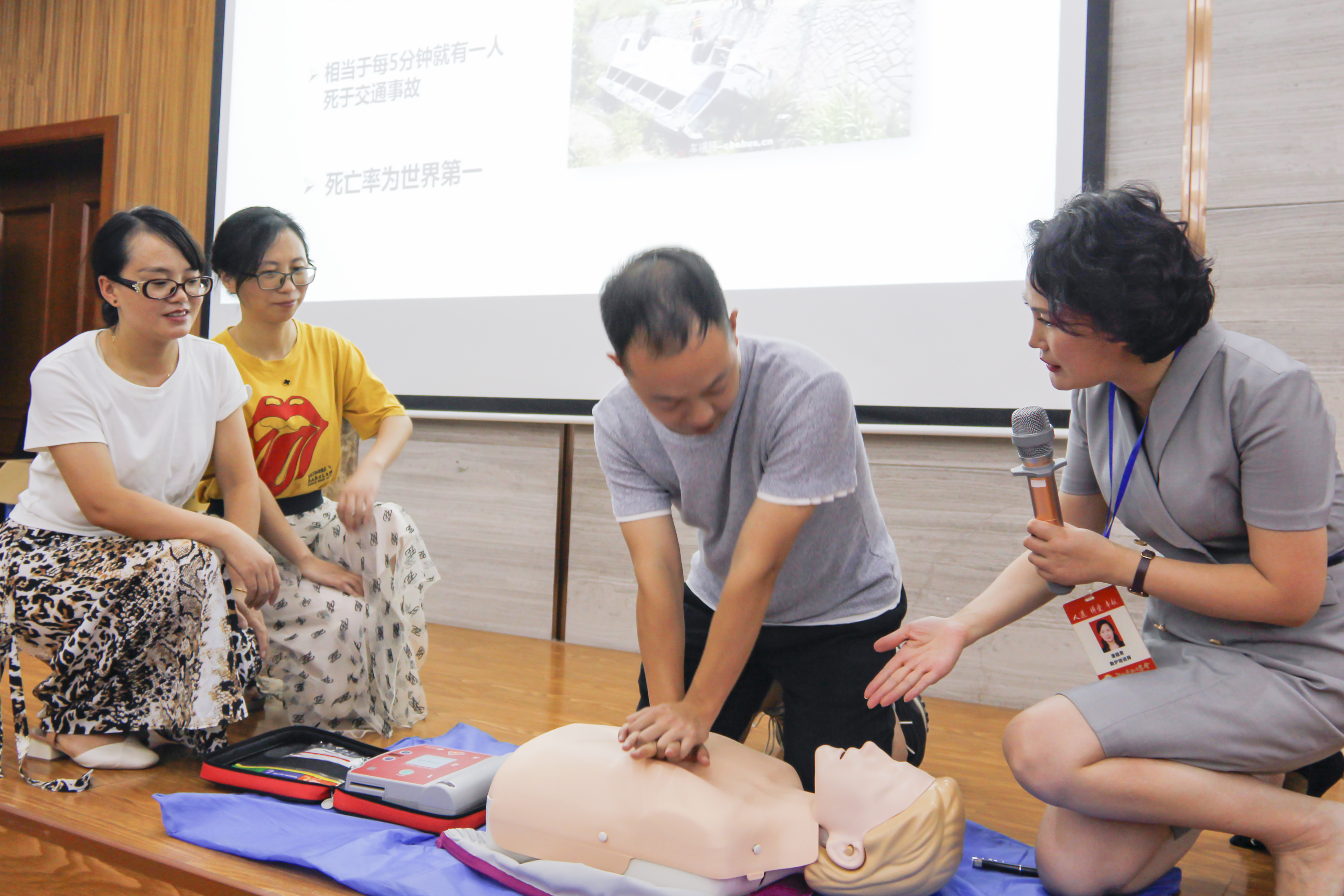 24—25日,在中小幼校园应急救护培训班上,金华市职业技术学院医学院讲师潘超君上的虽是理论课,但她设置了情景剧,邀请学员上台示范,生动的形式牢牢吸引了学员的注意。该项目针对的是东阳所有中小幼教师,分5年时间完成,现已进行了4年。培训结束后,学员们要考取红十字救护员证,确保掌握“真把式”。