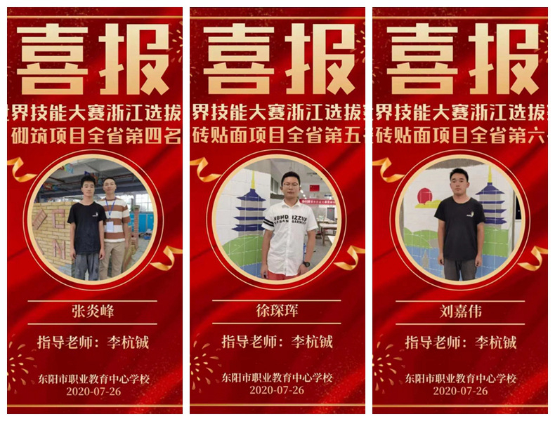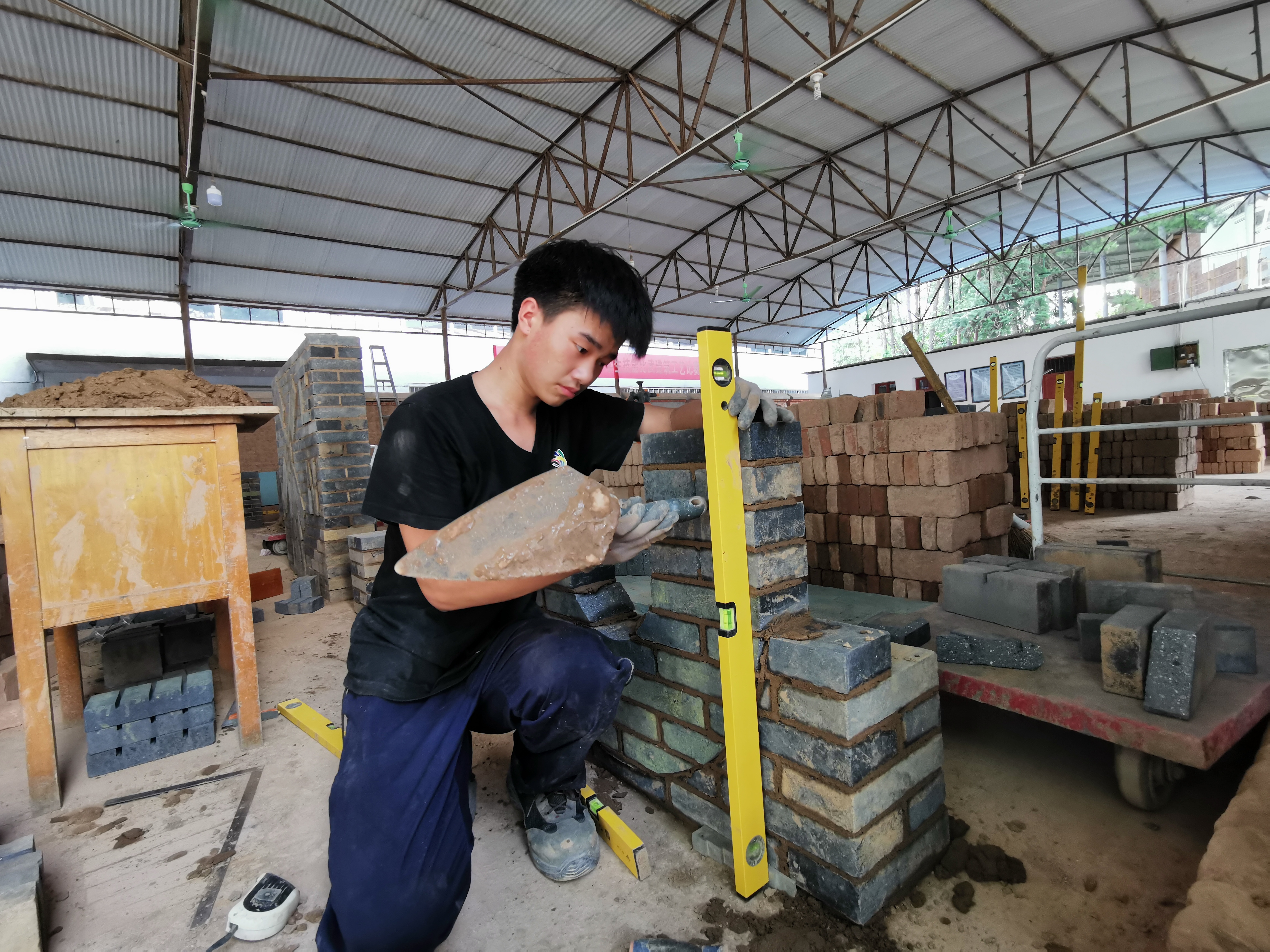 拿砖、抹泥、叠砖、用水平尺测量,22日下午2点多,东阳市职业教育中心学校高一学生张炎峰满头大汗,却无暇擦拭,专心地用砖块叠字母“Z”“J”。