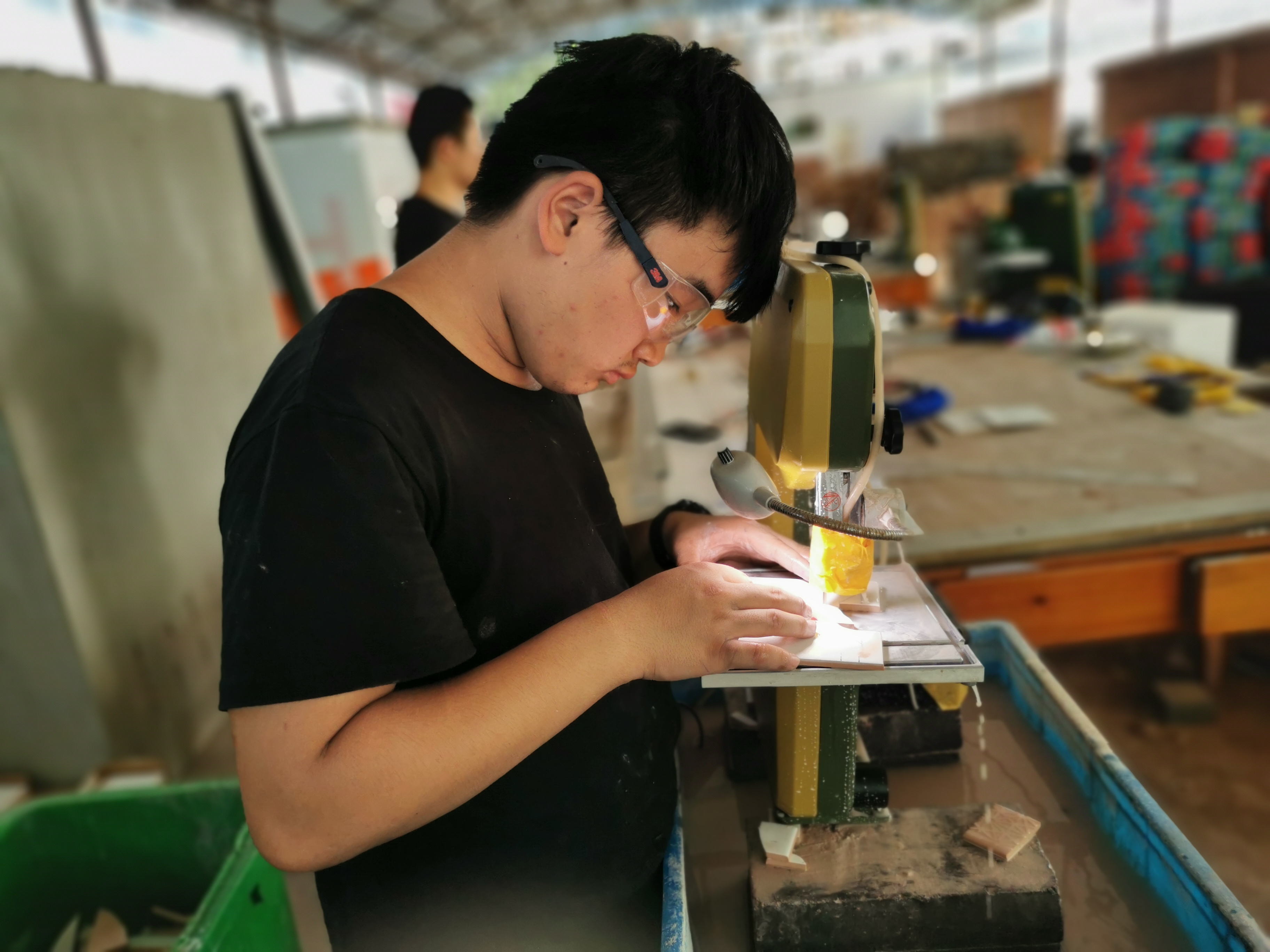 不远处,高二学生徐琛珲、高一学生刘嘉伟在切割瓷砖。指导老师李杭铖来回走,时不时点拨几句。他们在为第46届世界技能大赛浙江省选拔赛的砌筑、瓷砖贴面两个项目做准备。