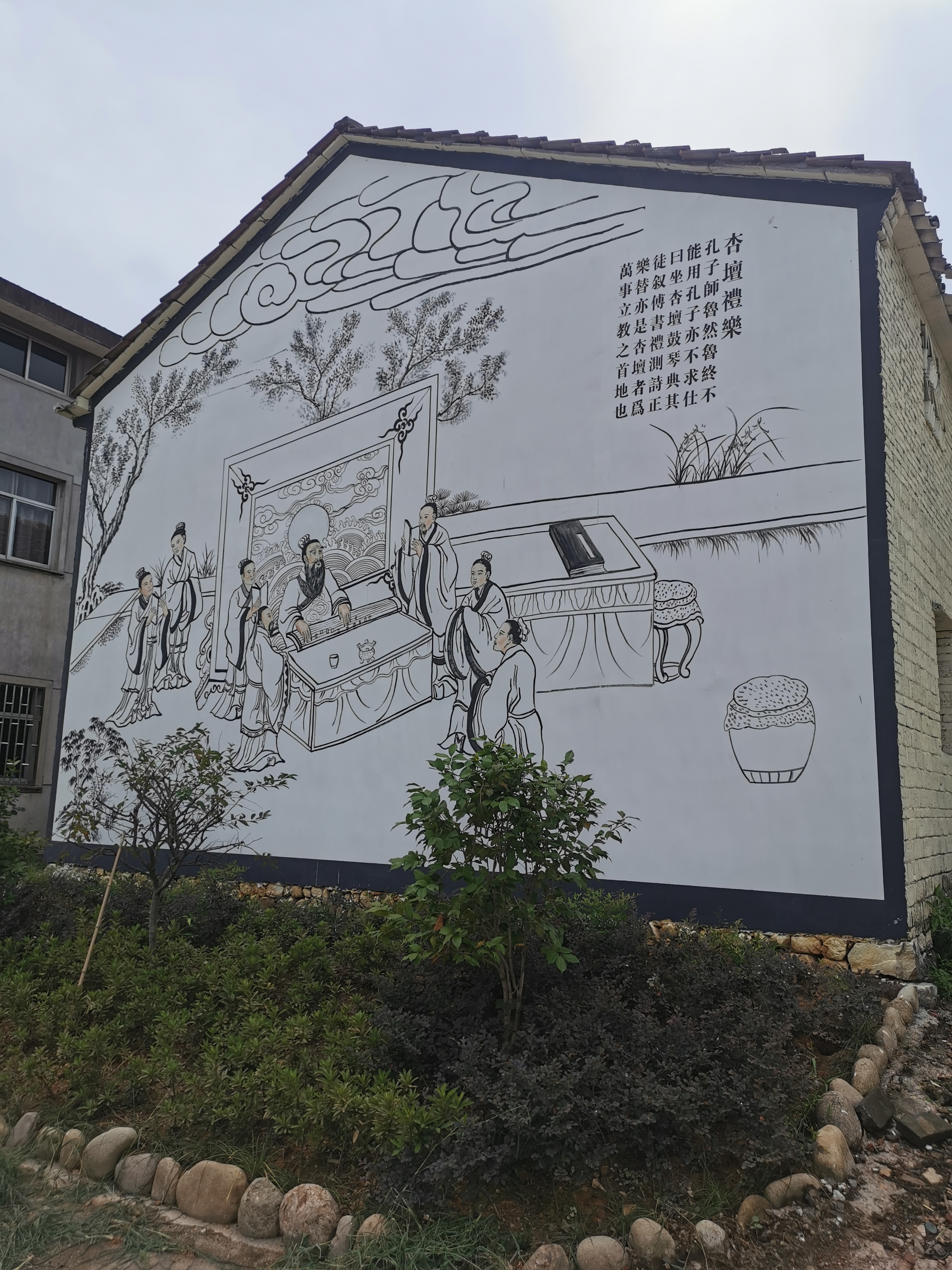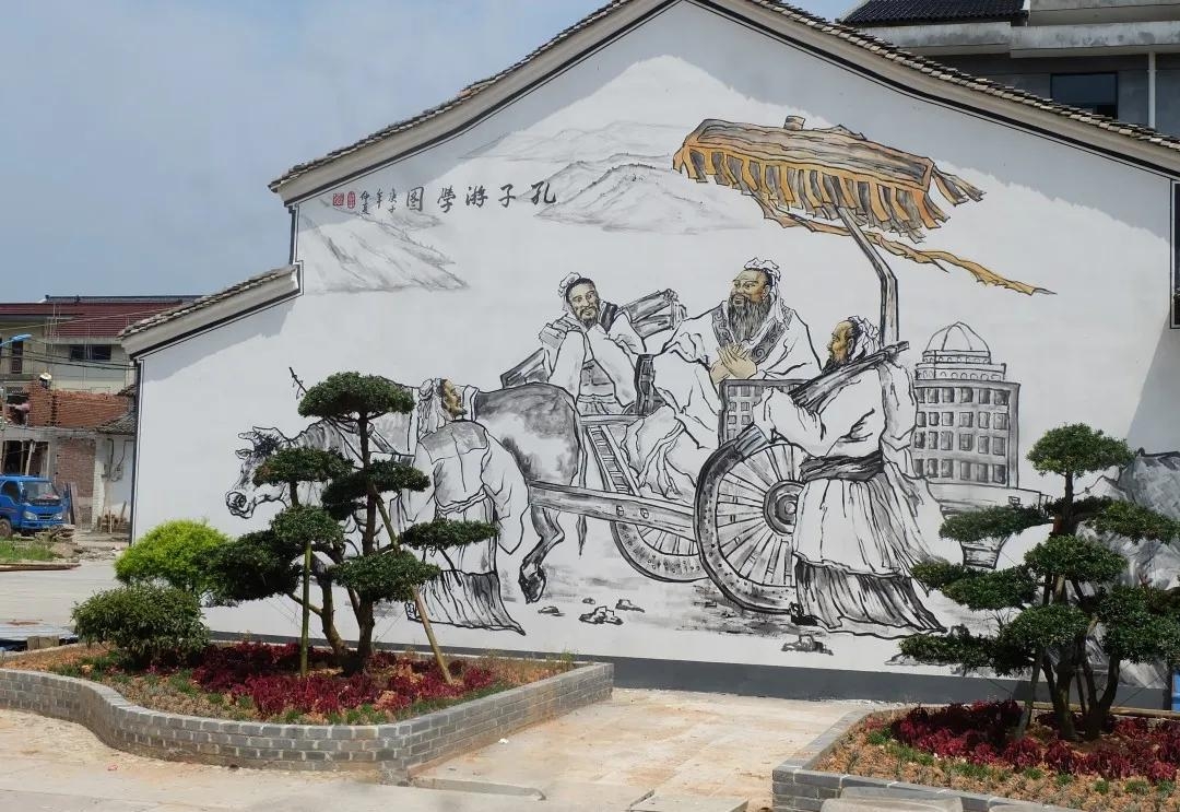 在提升村庄“颜值”的同时,堂鹤村还十分注重文化的打造。据李茂良介绍,堂鹤村村民是正宗的孔子后裔,“我们的祖先被过继给了舅舅抚养,所以改了姓”。尽管不再姓孔,但堂鹤村村民没忘记自己的根,在村庄文化打造上,从村口的景观标识到大片的孔子游学墙绘,再到老祠堂里的孔子雕像,村里时时处处可见孔子的相关元素以及儒家文化。