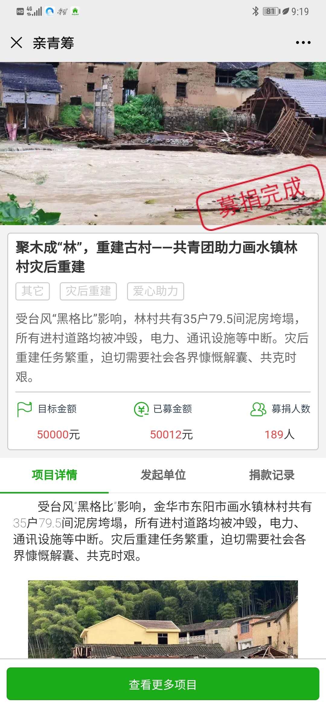 近日,画水镇共青团将林村受灾的消息上报至东阳团市委,在团市委积极牵头下,东阳市迅速吹响“青春集结号”,号召广大团员青年积极捐款奉献爱心,共克时艰。短短两天时间,“亲青筹”公益募捐平台募捐救灾款5万元。