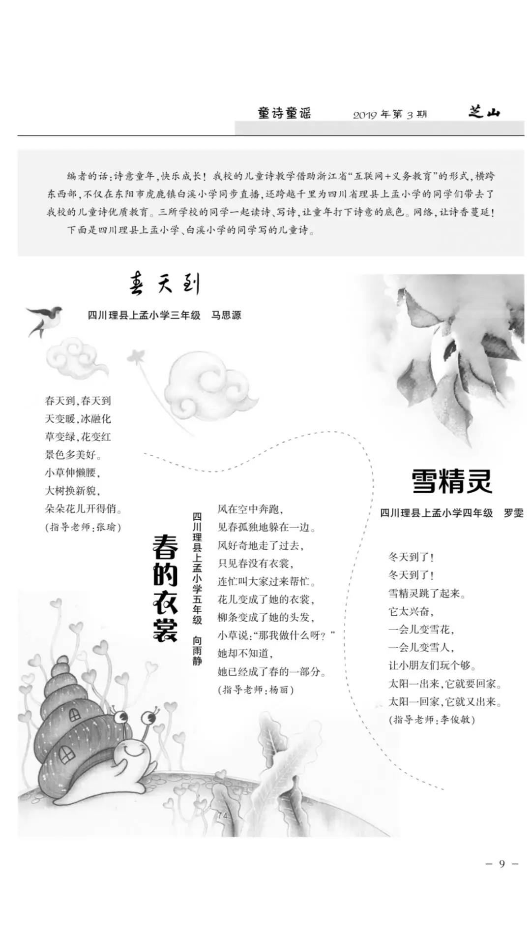 儿童诗是巍山校区的精品课程。按照帮扶计划,两省三所学校每周开展“学写儿童诗”教学。利用巍山校区的自编教材《芝山园里学童诗》,三所学校学生一起学习了“霜”“母爱”“冬之梦”等十几个主题。近一年来,上孟小学开展了“童年邂逅童诗”系列活动,学生已创作近百首儿童诗,其中有10余首在东阳各刊物网站发表。三所学校还通过互联网评比“十佳小诗人”,在孩子们心里埋下诗歌的种子。