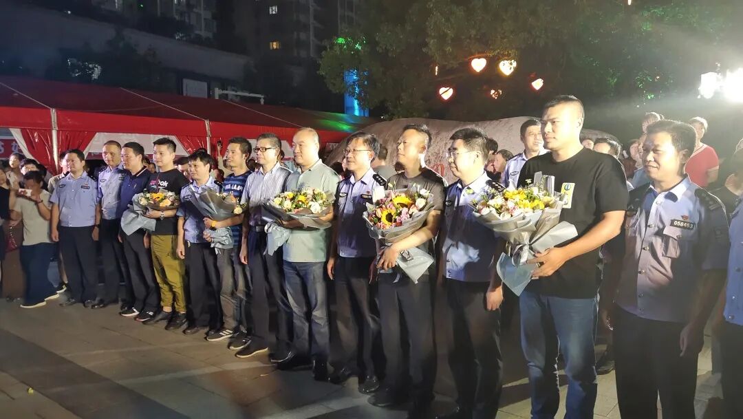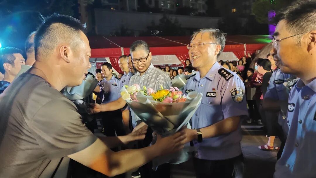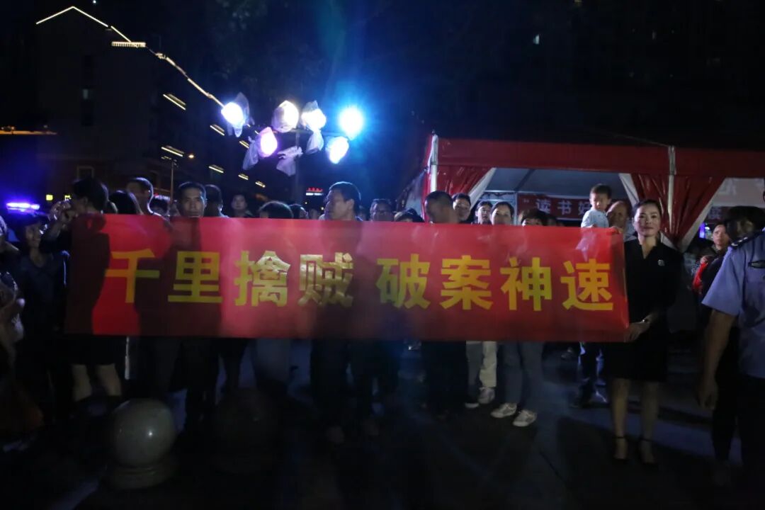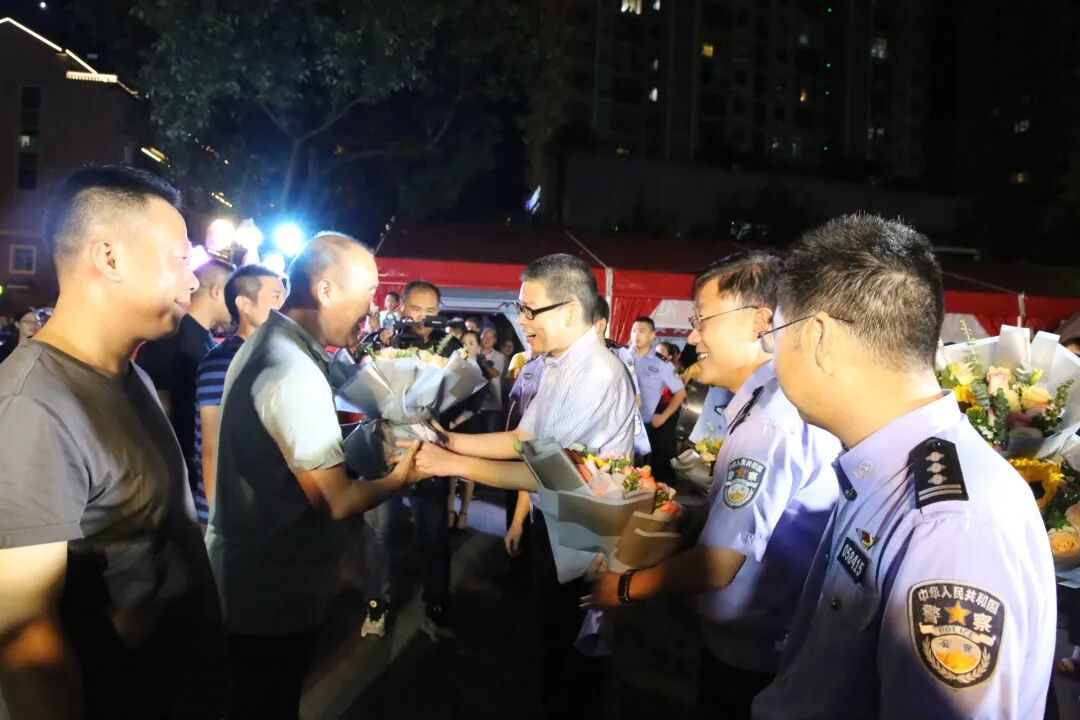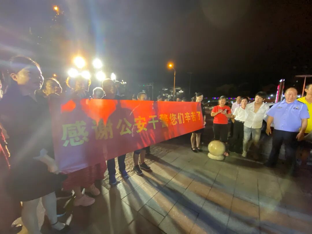 9月15日晚,磐安县领导陈远志、陈劲松带领县公安局全体党委班子成员到盘龙广场迎接抓捕组凯旋。磐安上千名群众自发来到盘龙广场,举起横幅、敲锣打鼓庆祝案件迅速告破,现场群众送上阵阵欢呼,向快速破案的全体办案民警表达了敬意。