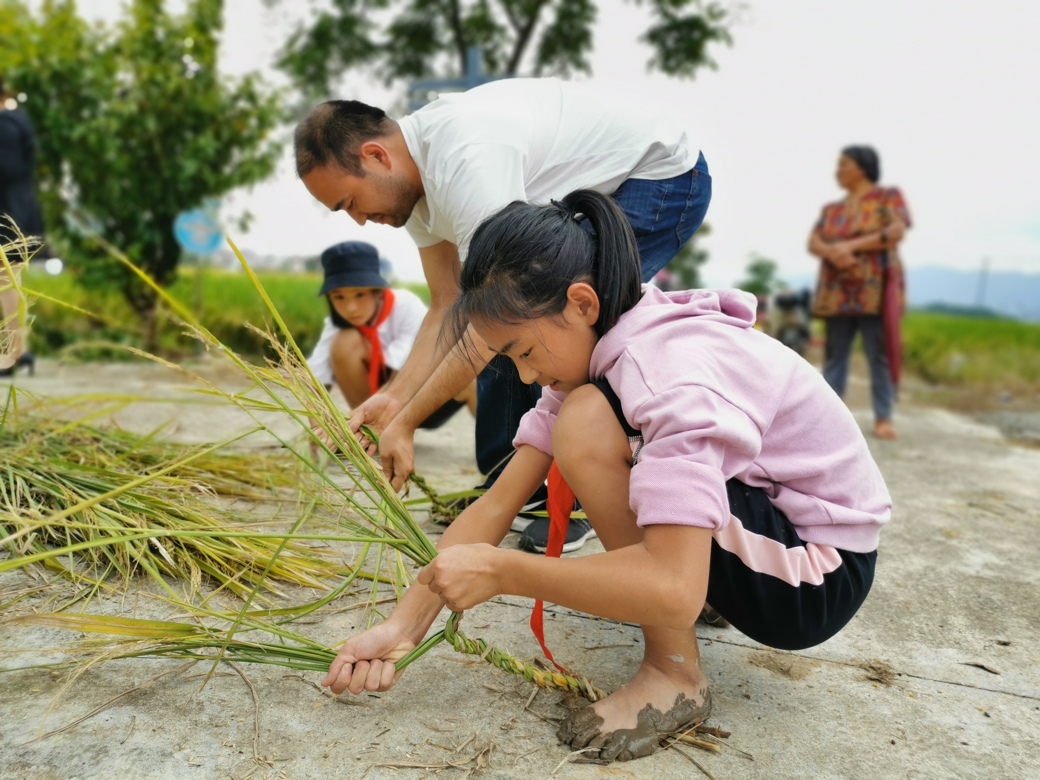 六年级学生严茹钰收割稻子后,光着泥脚丫、踩着稻草,双手不停地搓,和稻草“较劲”。一旁,爸爸严晓峰正熟练地搓稻绳,边搓边给女儿传授技巧。“太难了。”严茹钰嘴上说要放弃,但手上动作一直忙不停。经过爸爸的指导,她的技术明显长进。