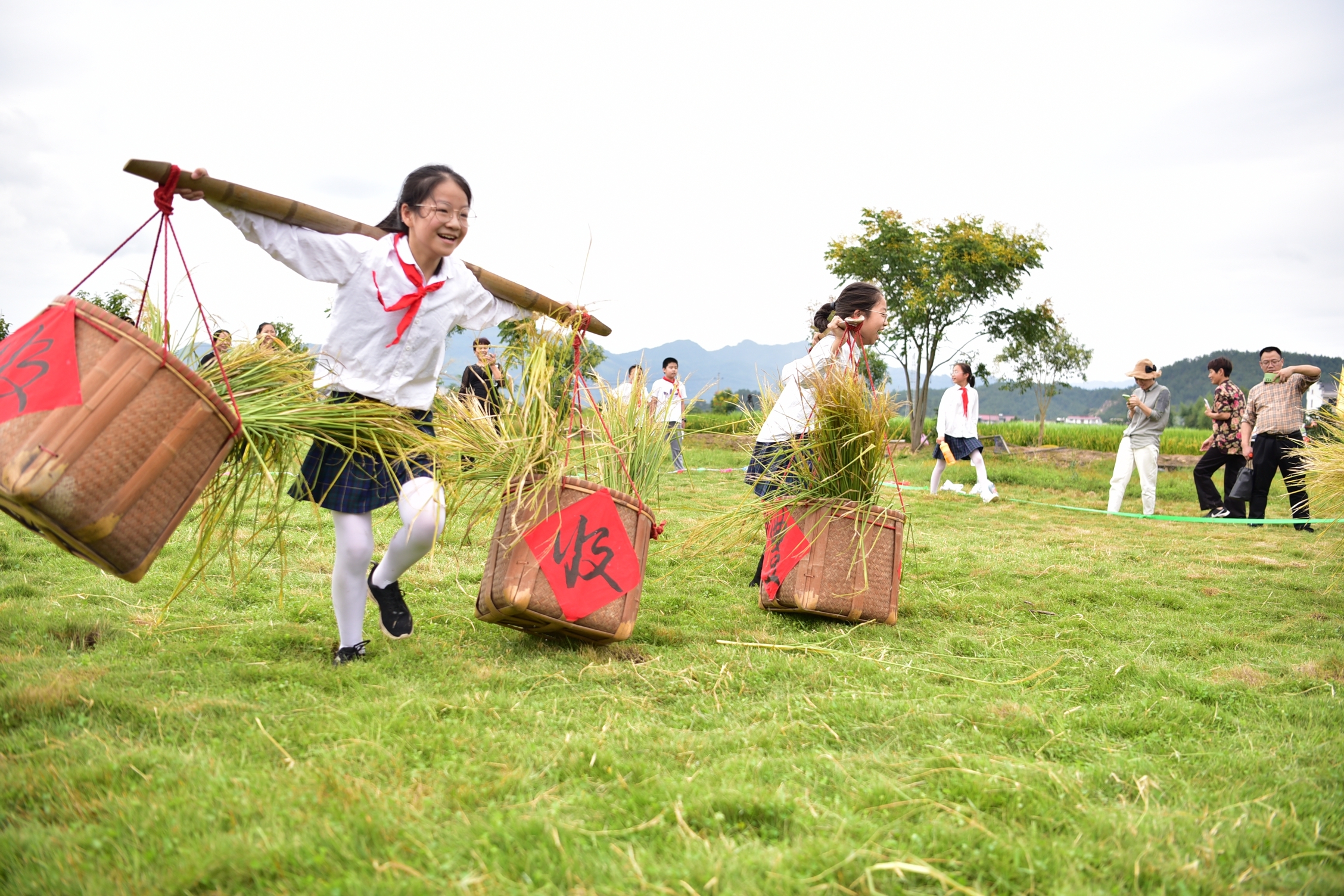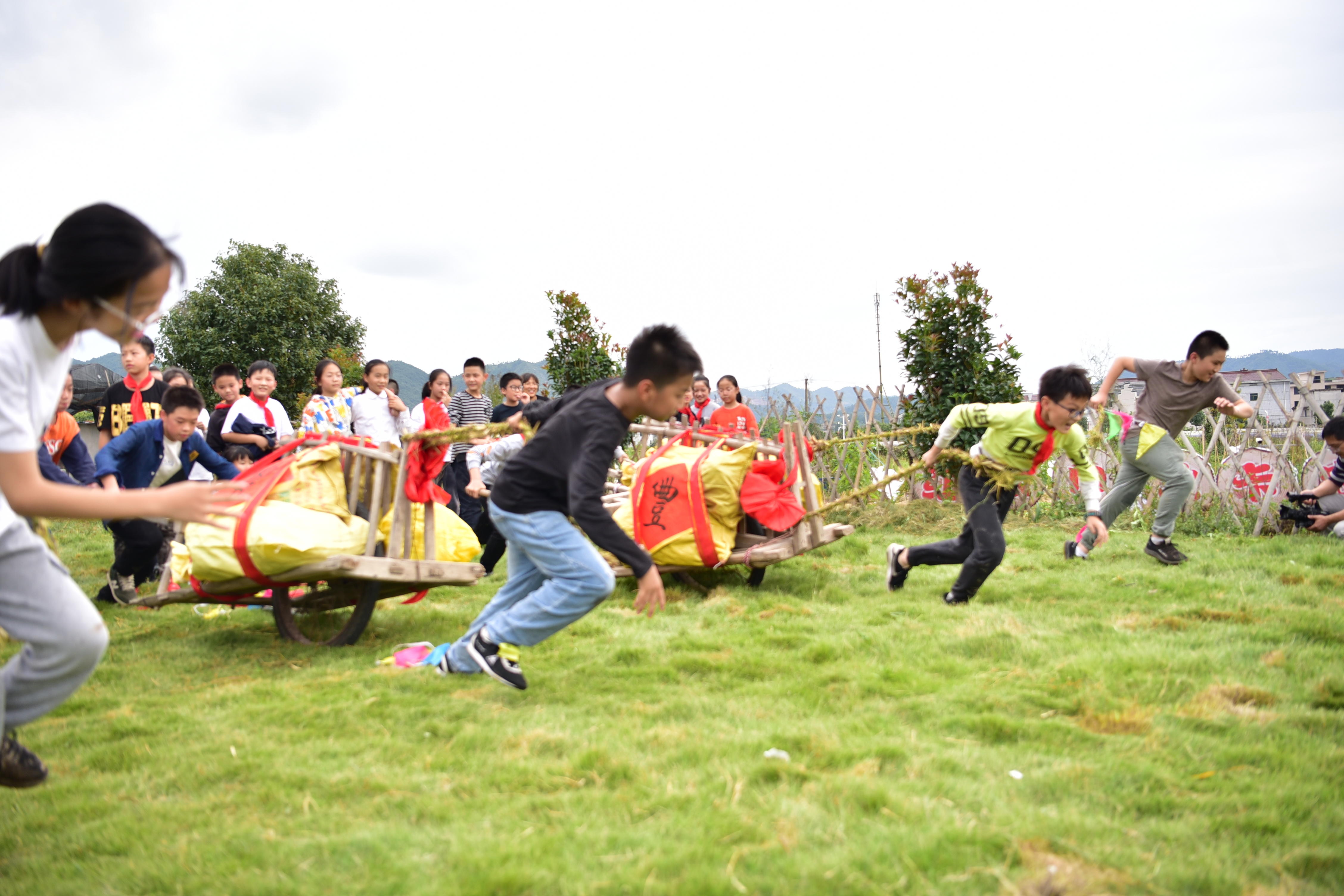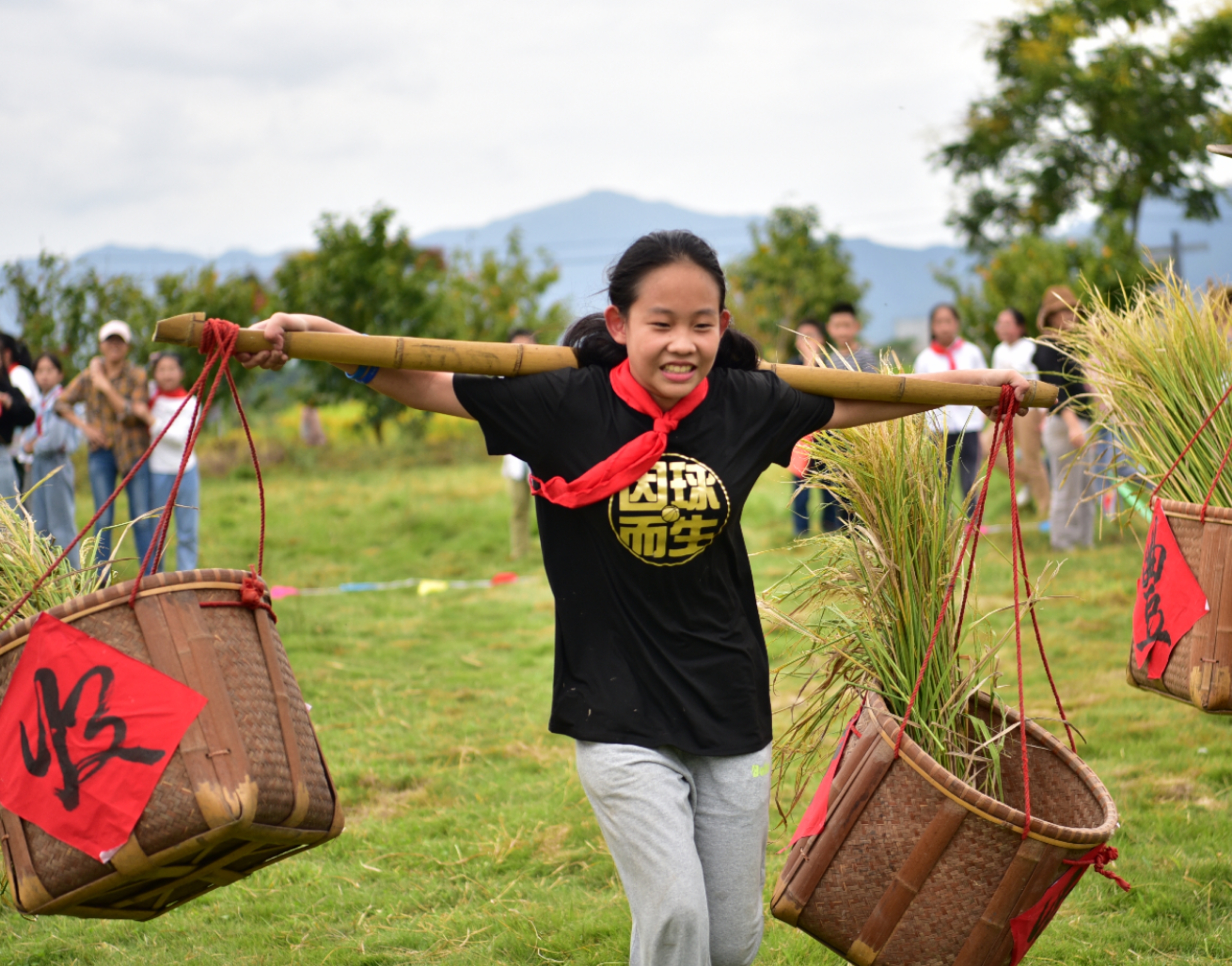 挑担比赛与独轮车比赛齐头并进,学生用扁担挑起装着稻谷的箩筐,有的轻松跑到终点,有的没跑几步扁担就滑脱了。