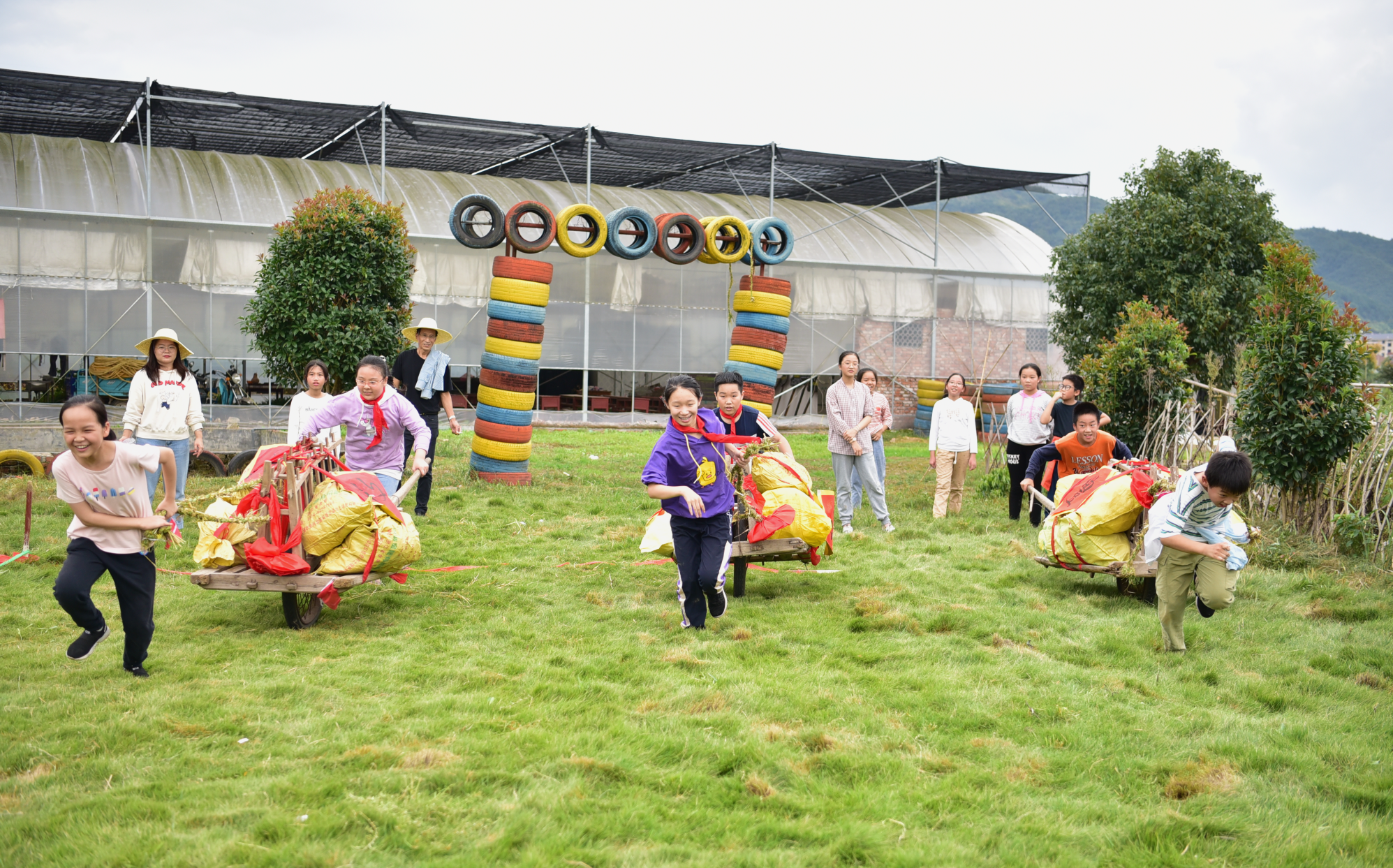 稻绳是为了田间运动会准备的。稻绳绑在独轮车上,一个人在前面拉,一个人在后面推,奋力向前冲。