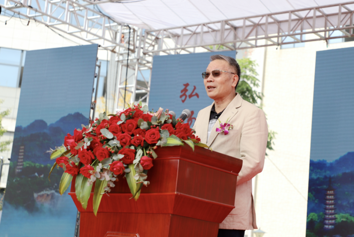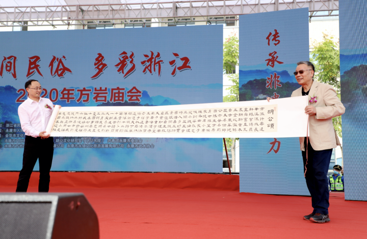 陈加元宣布2020年方岩庙会开幕,并向永康市捐赠《胡公颂》书法作品。