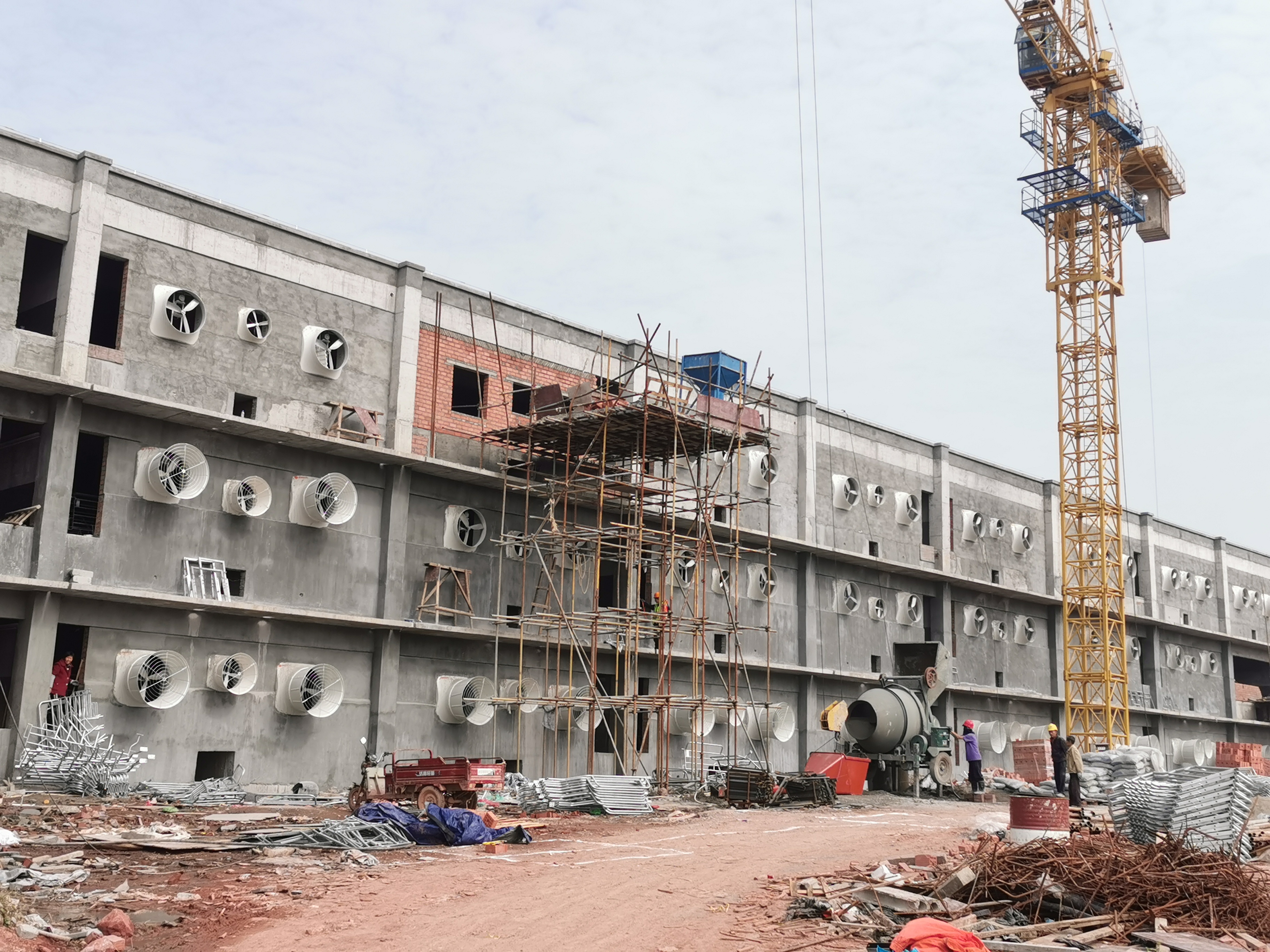 11月8日,在兰溪市永昌街道兰溪华统牧业瑞溪现代化生猪养殖项目施工现场,吊车、挖掘机、运输车辆在工地上穿梭。