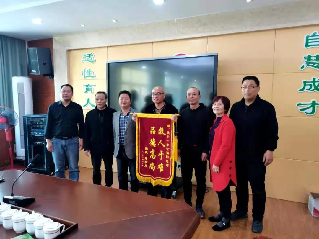 “救人于难 品德高尚”,昨天,东阳市民陈先生将这面锦旗送到东阳市吴宁一中,交到57岁教师金福阳手中,感谢其背着晕厥的妻子郑女士下山,让妻子及时得到救治。