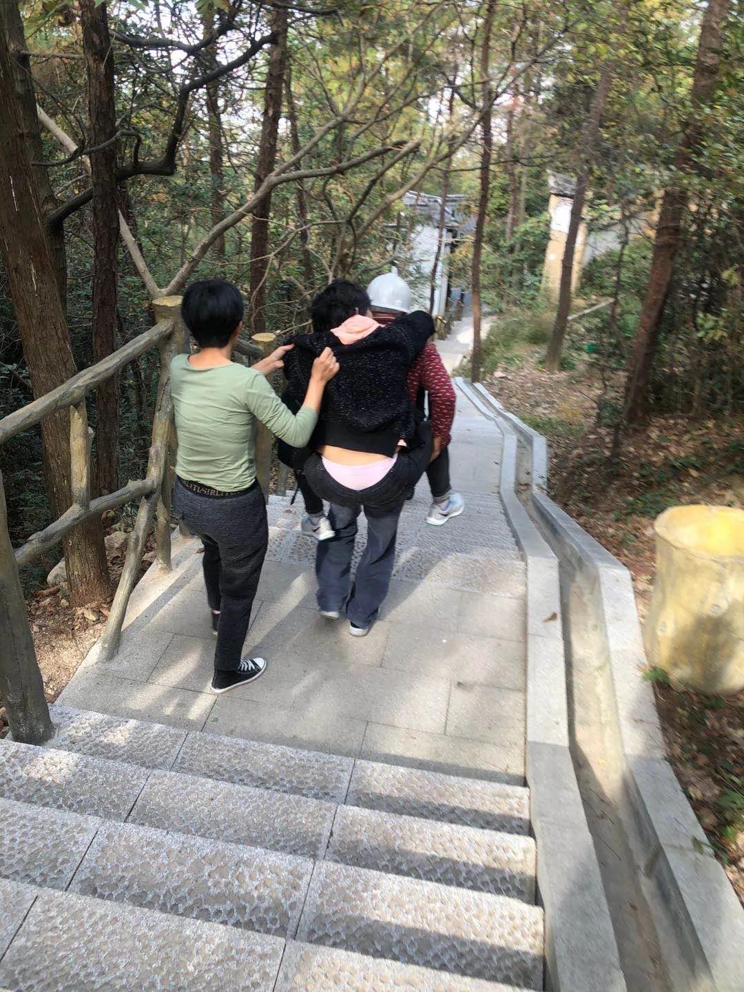 事情发生在7日下午1时许,郑女士和同伴张女士等共3个大人2个孩子,登山至东岘峰半山腰吃午饭。突然,郑女士感到头晕,伴有身体抽搐,昏了过去。两个同伴一个扶着郑女士,不让她的脑袋着地,另一个立即拨打急救电话,并去寻人帮忙。