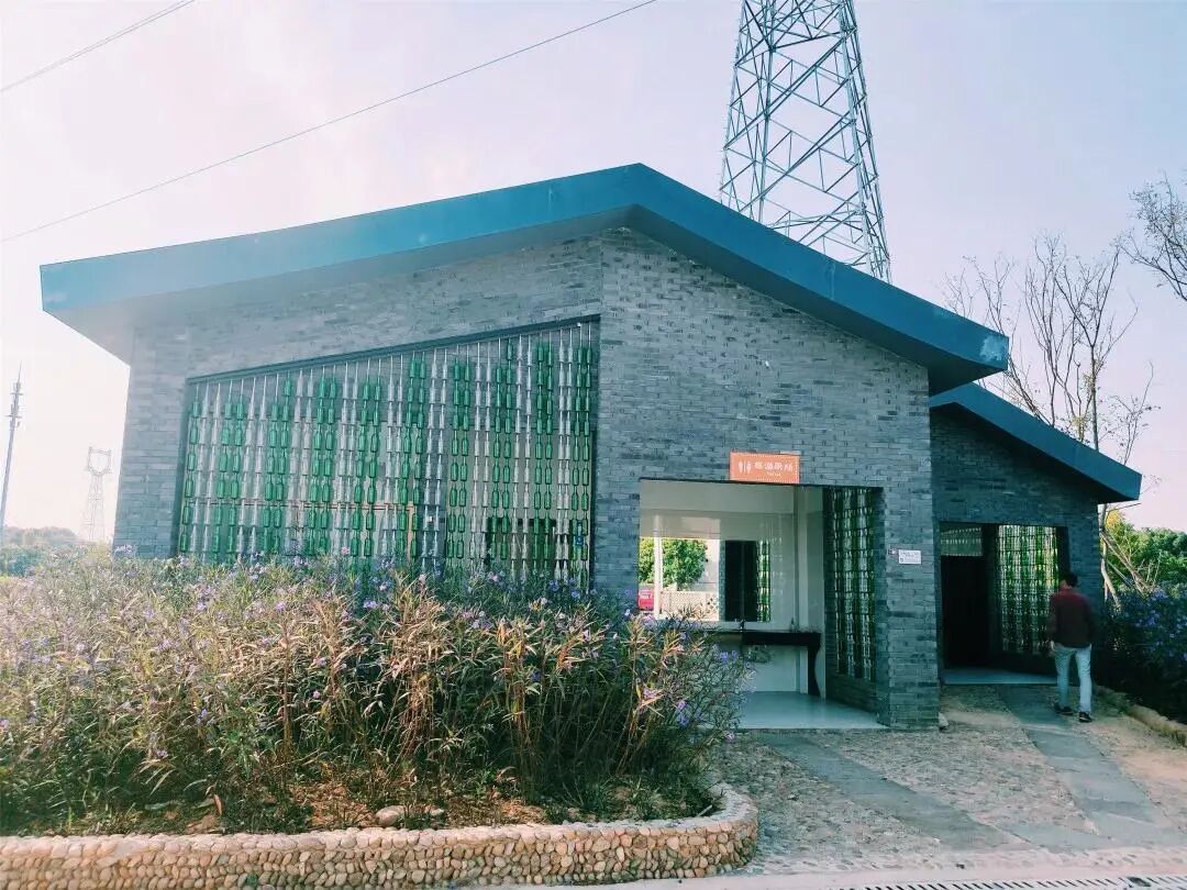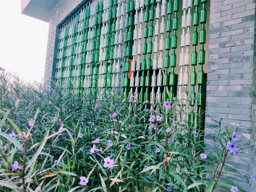 六角塘村是全国垃圾分类示范村,拥有全国首个以垃圾分类为主题的艺术展馆。如今,连村上的旅游厕所也成了艺术展馆的一部分。站在旅游厕所不远处,会看到一个个废弃的玻璃瓶像珠子一样被串在一起,青白相间的玻璃瓶帘子被当做艺术品悬挂起来,十分好看。