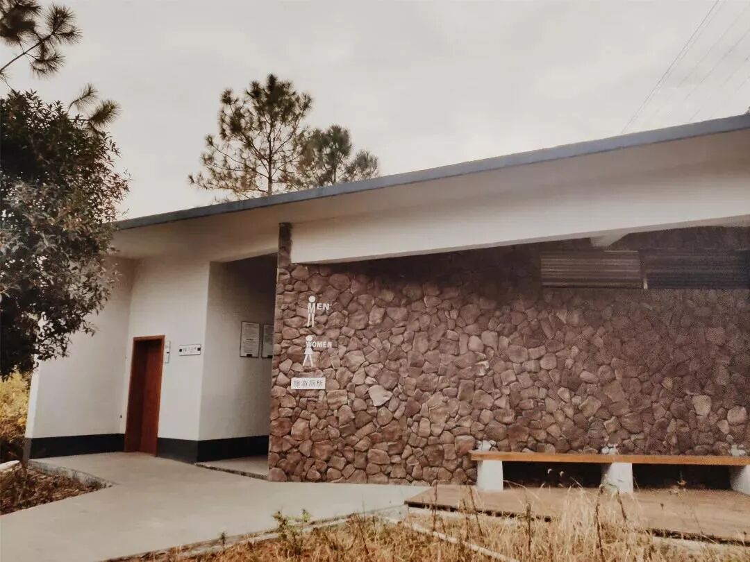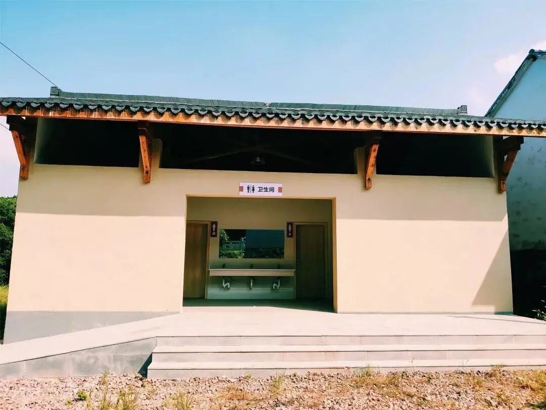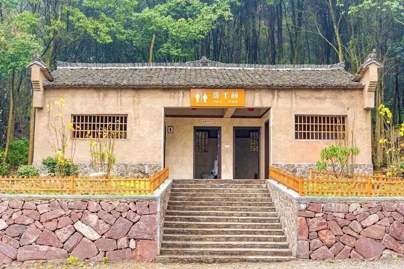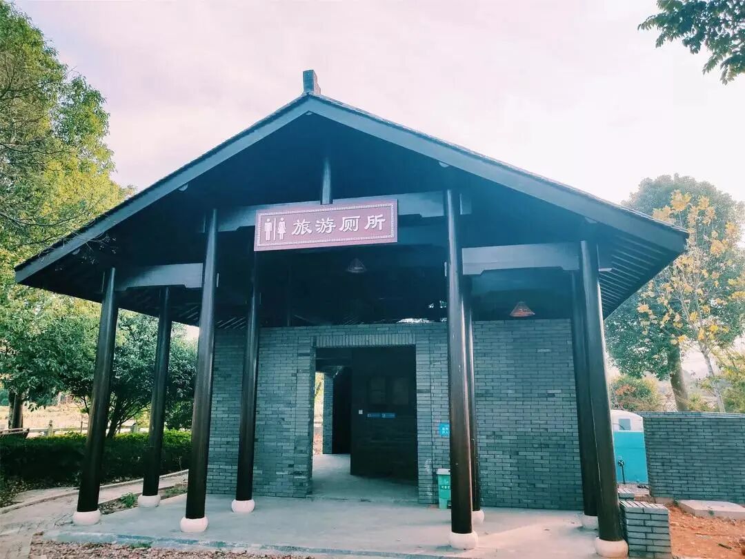 山南村的旅游厕所是一座青砖黑瓦的复古式建筑,它隐藏在一片林子中,门前的黄泥石板路与建筑外形相呼应,双入口开放设计,方便游客进出,前庭拥有的开放式空间,为游客提供了舒适的休憩场所。