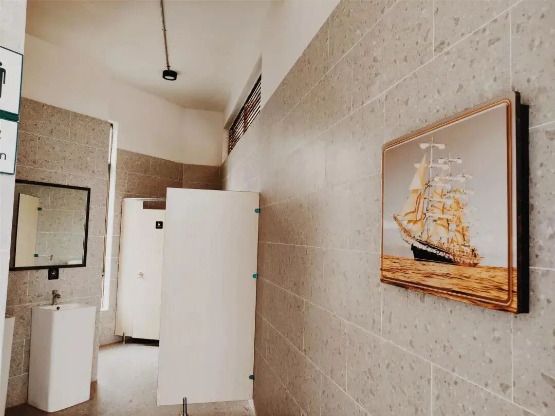 釜章村的旅游公厕主体外墙以红泥粉刷,环保美观的同时又具有当地特色,内部设施一应俱全,并配备了烘干、梳妆镜、节水冲洗等设备,儿童使用设备具有童趣风格。
