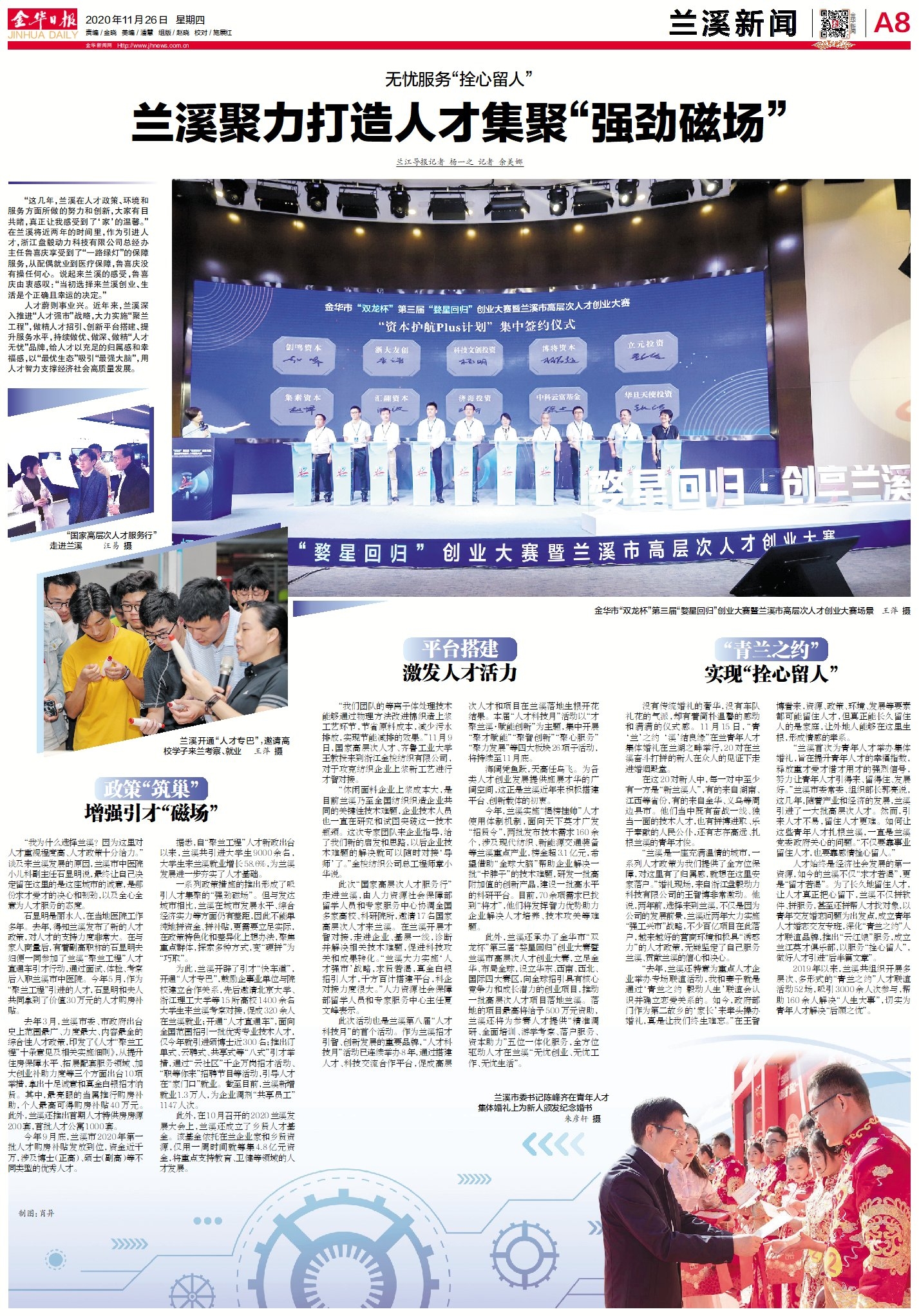 此外,在10月召开的2020兰溪发展大会上,兰溪还成立了乡贤人才基金。该基金依托在兰企业家和乡贤资源,仅用一周时间筹集了4.8亿元资金,将重点支持教育、卫健等领域的人才发展。