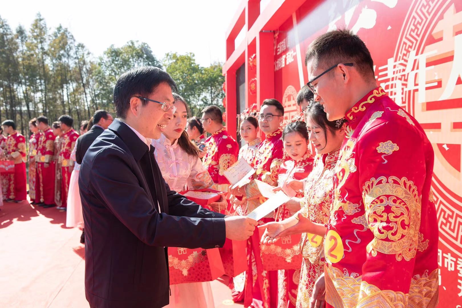 兰溪市委书记陈峰齐在青年人才集体婚礼上为新人颁发纪念婚书 朱彦轩/摄