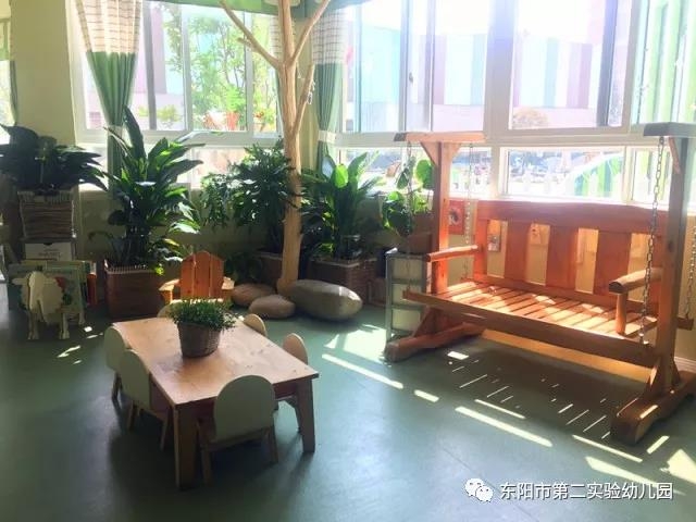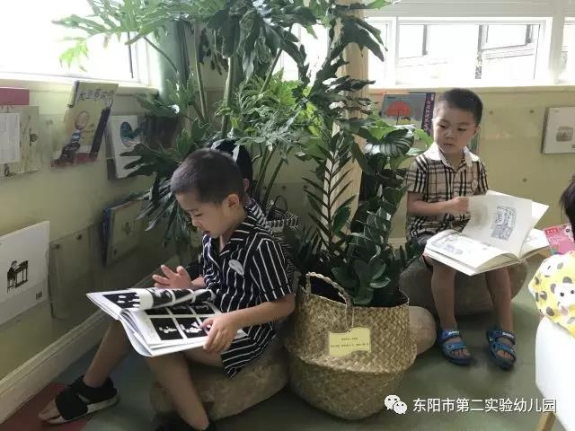 草莓图书馆、神秘图书馆、宝藏图书馆……班级内,儿童图书馆风格独特;小森林书吧、小芽儿书馆、绿野仙踪……公共大厅处,小朋友可以坐在秋千上阅读,也可以倚靠在大树下看书;香香小池塘、诗心生活坊、快乐小驿站……户外,这些书馆是带着花香、泥香和果香的。细细数来,东阳实验二幼有大大小小的“阅读角”20多处,满园都散发着书香,孩子们可以随时、随地、随心、随性读书。
