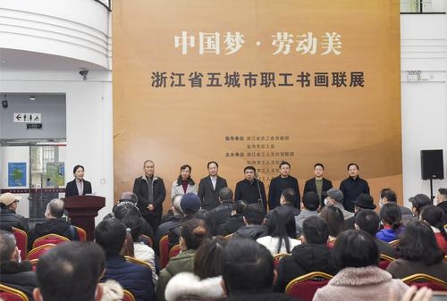 12月23日,金华市总工会举行“中国梦•劳动美”五城市职工书画联展,杭州、温州、湖州、海宁、金华等五城市百余名职工书画爱好者的书画作品140余幅参展。 五城市书画联展是弘扬和传承五地优秀文化,增进交流合作,增强职工文化凝聚力的有效载体,为职工书画爱好者提供施展才华、体现艺术价值的舞台。